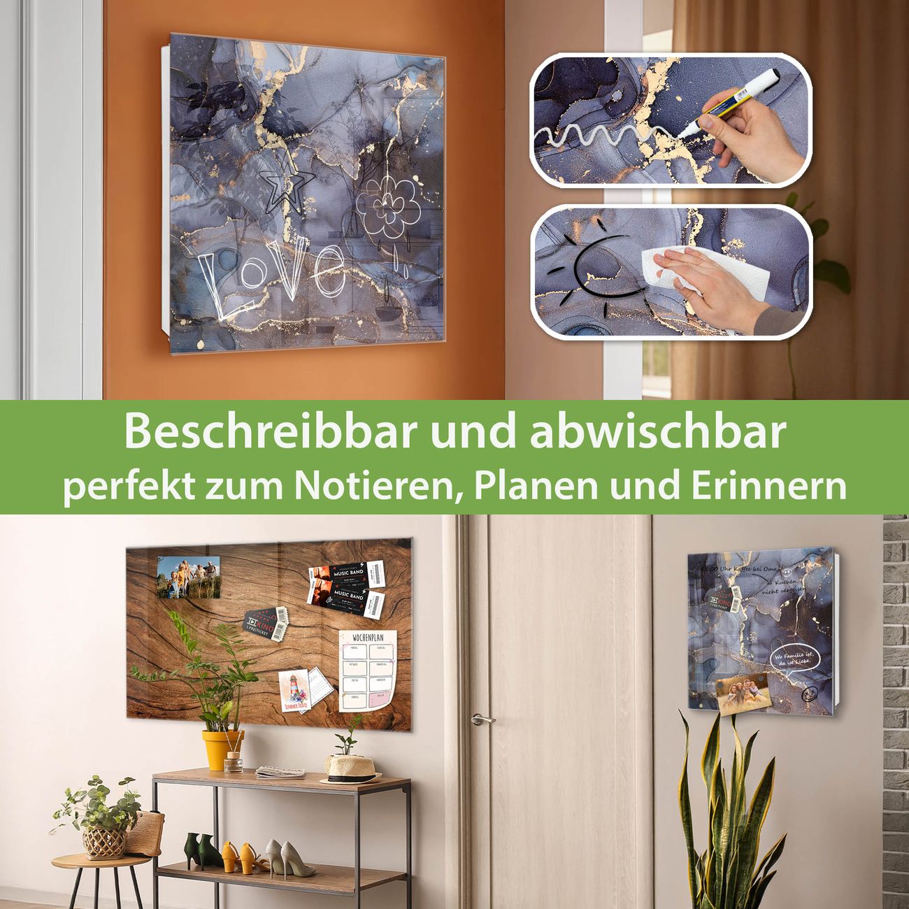 Bringe Ordnung und Eleganz in deinen Eingangsbereich mit dem banjado Schlüsselkasten Motiv Lila Marmor mit Gold 1. Die moderne Schlüsselbox kombiniert funktionales Design mit hochwertiger Verarbeitung und wird so zu einem echten Hingucker in Flur, Büro oder Ferienwohnung. ✅ Stilvolle Schlüsselaufbewahrung mit Glasfront im Motiv Motiv Lila Marmor mit Gold 1 Der Design-Schlüsselkasten Motiv Lila Marmor mit Gold 1 bietet Platz für bis zu 50 Schlüssel, die auf 5 stabilen Reihen mit je 10 Haken übersichtlich verstaut werden. Mit seinen kompakten Maßen von 30 x 30 x 5 cm passt die Schlüsselbox perfekt auch in kleinere Räume. Der weiß lackierte Stahlkorpus mit rechts angeschlagenem Türscharnier harmoniert mit der Glasfront und fügt sich nahtlos in jedes Wohnambiente ein. Ob als Schlüsselorganizer für Zuhause oder als praktische Lösung für Büros, Praxen und Gewerbe, der banjado Schlüsselkasten sorgt für Ordnung und Übersicht. Dank der magnetischen, mit Kreidestiften beschreibbaren Glasfront kannst du Notizen anheften oder Termine direkt auf der Oberfläche festhalten. Die Schlüsselbox Motiv Lila Marmor mit Gold 1 zur Wandmontage wird inklusive Befestigungsmaterial geliefert und ist schnell angebracht. So hast du deine Schlüssel jederzeit griffbereit und zugleich stilvoll verstaut. Mit diesem banjado Schlüsselkasten Motiv Lila Marmor mit Gold 1 kombinierst du praktische Aufbewahrung mit stilvollem Wohndesign. Ob privat oder geschäftlich, die Schlüsselbox sorgt für mehr Ordnung, Übersicht und ein wohnliches Ambiente.Vorteile im Überblick