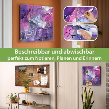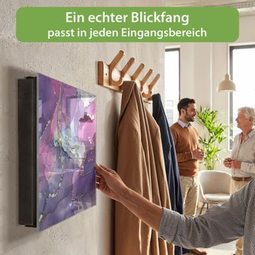 Bringe Ordnung und Eleganz in deinen Eingangsbereich mit dem banjado Schlüsselkasten Motiv Lila Marmor mit Gold 2. Die moderne Schlüsselbox kombiniert funktionales Design mit hochwertiger Verarbeitung und wird so zu einem echten Hingucker in Flur, Büro oder Ferienwohnung. ✅ Stilvolle Schlüsselaufbewahrung mit Glasfront im Motiv Motiv Lila Marmor mit Gold 2 Der Design-Schlüsselkasten Motiv Lila Marmor mit Gold 2 bietet Platz für bis zu 50 Schlüssel, die auf 5 stabilen Reihen mit je 10 Haken übersichtlich verstaut werden. Mit seinen kompakten Maßen von 30 x 30 x 5 cm passt die Schlüsselbox perfekt auch in kleinere Räume. Der schwarz lackierte Stahlkorpus mit rechts angeschlagenem Türscharnier harmoniert mit der Glasfront und fügt sich nahtlos in jedes Wohnambiente ein. Ob als Schlüsselorganizer für Zuhause oder als praktische Lösung für Büros, Praxen und Gewerbe, der banjado Schlüsselkasten sorgt für Ordnung und Übersicht. Dank der magnetischen, mit Kreidestiften beschreibbaren Glasfront kannst du Notizen anheften oder Termine direkt auf der Oberfläche festhalten. Die Schlüsselbox Motiv Lila Marmor mit Gold 2 zur Wandmontage wird inklusive Befestigungsmaterial geliefert und ist schnell angebracht. So hast du deine Schlüssel jederzeit griffbereit und zugleich stilvoll verstaut. Mit diesem banjado Schlüsselkasten Motiv Lila Marmor mit Gold 2 kombinierst du praktische Aufbewahrung mit stilvollem Wohndesign. Ob privat oder geschäftlich, die Schlüsselbox sorgt für mehr Ordnung, Übersicht und ein wohnliches Ambiente.Vorteile im Überblick