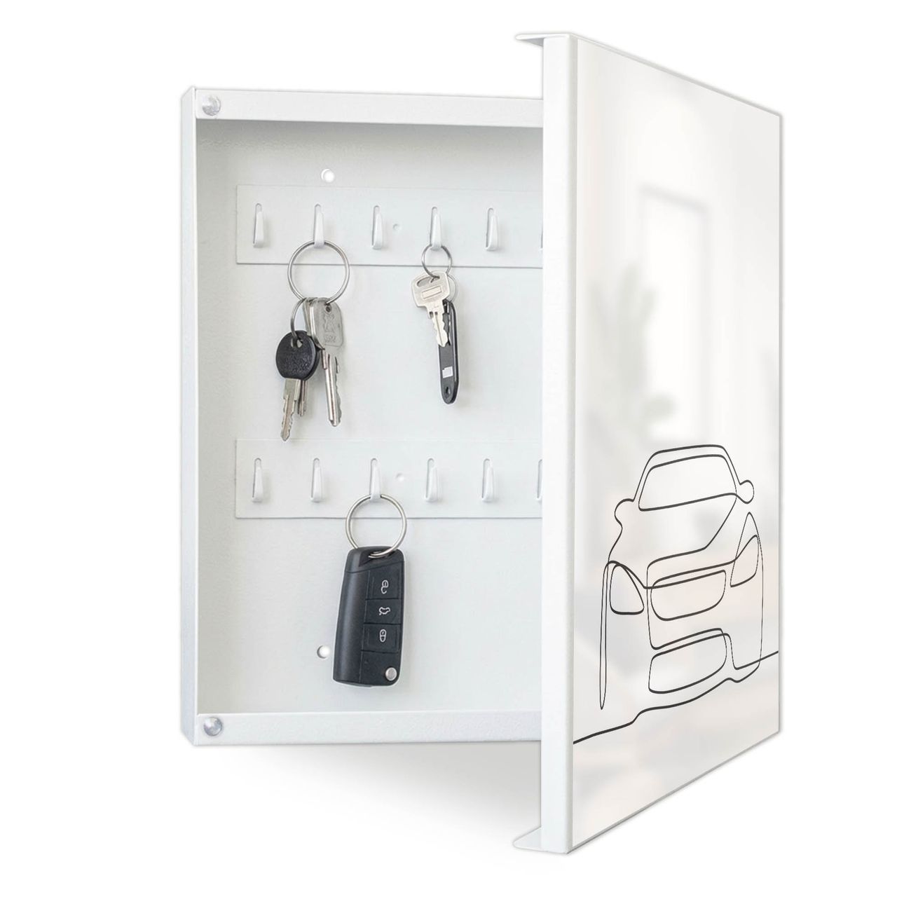 Bringe Ordnung und Eleganz in deinen Eingangsbereich mit dem banjado Schlüsselkasten Motiv Motiv Lineart Auto. Die moderne Schlüsselbox kombiniert funktionales Design mit hochwertiger Verarbeitung und wird so zu einem echten Hingucker in Flur, Büro oder Ferienwohnung. ✅ Stilvolle Schlüsselaufbewahrung mit Motiv Motiv Lineart Auto Der Design-Schlüsselkasten Motiv Motiv Lineart Auto bietet Platz für bis zu 32 Schlüssel, die auf 4 stabilen Reihen mit je 8 Haken übersichtlich verstaut werden. Mit seinen kompakten Maßen von 30 x 30 x 5 cm passt die Schlüsselbox perfekt auch in kleinere Räume. Der weiß lackierte Stahlkorpus mit rechts angeschlagenem Türscharnier harmoniert mit gedruckten Folie auf der Front und fügt sich nahtlos in jedes Wohnambiente ein. Ob als Schlüsselorganizer für Zuhause oder als praktische Lösung für Büros, Praxen und Gewerbe, der banjado Schlüsselkasten sorgt für Ordnung und Übersicht. Dank der magnetischen, mit Kreidestiften beschreibbaren Folie auf der Front kannst du Notizen anheften oder Termine direkt auf der Oberfläche festhalten. Die Schlüsselbox Motiv Motiv Lineart Auto zur Wandmontage wird inklusive Befestigungsmaterial geliefert und ist schnell angebracht. So hast du deine Schlüssel jederzeit griffbereit und zugleich stilvoll verstaut. Mit diesem banjado Schlüsselkasten Motiv Motiv Lineart Auto kombinierst du praktische Aufbewahrung mit stilvollem Wohndesign. Ob privat oder geschäftlich, die Schlüsselbox sorgt für mehr Ordnung, Übersicht und ein wohnliches Ambiente.Vorteile im Überblick