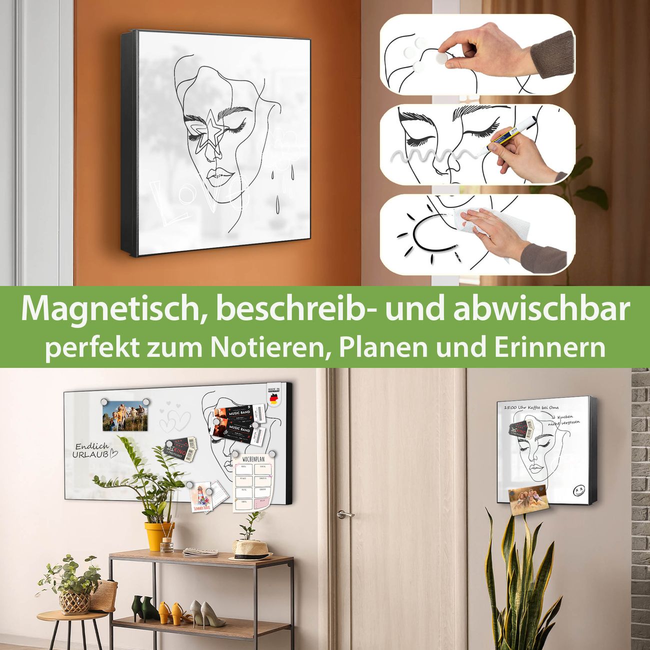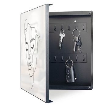 Bringe Ordnung und Eleganz in deinen Eingangsbereich mit dem banjado Schlüsselkasten Motiv Motiv Portrait Lineart. Die moderne Schlüsselbox kombiniert funktionales Design mit hochwertiger Verarbeitung und wird so zu einem echten Hingucker in Flur, Büro oder Ferienwohnung. ✅ Stilvolle Schlüsselaufbewahrung mit Motiv Motiv Portrait Lineart Der Design-Schlüsselkasten Motiv Motiv Portrait Lineart bietet Platz für bis zu 32 Schlüssel, die auf 4 stabilen Reihen mit je 8 Haken übersichtlich verstaut werden. Mit seinen kompakten Maßen von 30 x 30 x 5 cm passt die Schlüsselbox perfekt auch in kleinere Räume. Der schwarz lackierte Stahlkorpus mit links angeschlagenem Türscharnier harmoniert mit gedruckten Folie auf der Front und fügt sich nahtlos in jedes Wohnambiente ein. Ob als Schlüsselorganizer für Zuhause oder als praktische Lösung für Büros, Praxen und Gewerbe, der banjado Schlüsselkasten sorgt für Ordnung und Übersicht. Dank der magnetischen, mit Kreidestiften beschreibbaren Folie auf der Front kannst du Notizen anheften oder Termine direkt auf der Oberfläche festhalten. Die Schlüsselbox Motiv Motiv Portrait Lineart zur Wandmontage wird inklusive Befestigungsmaterial geliefert und ist schnell angebracht. So hast du deine Schlüssel jederzeit griffbereit und zugleich stilvoll verstaut. Mit diesem banjado Schlüsselkasten Motiv Motiv Portrait Lineart kombinierst du praktische Aufbewahrung mit stilvollem Wohndesign. Ob privat oder geschäftlich, die Schlüsselbox sorgt für mehr Ordnung, Übersicht und ein wohnliches Ambiente.Vorteile im Überblick