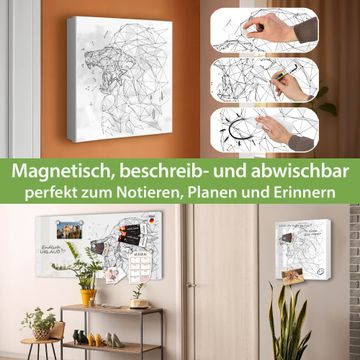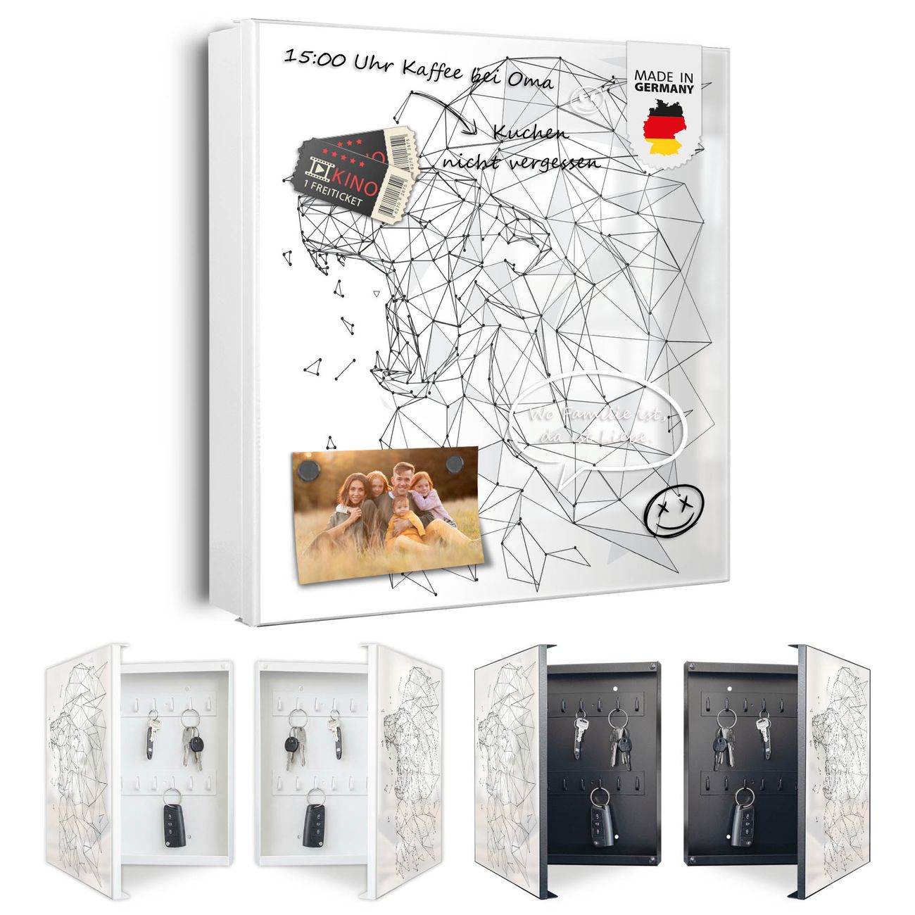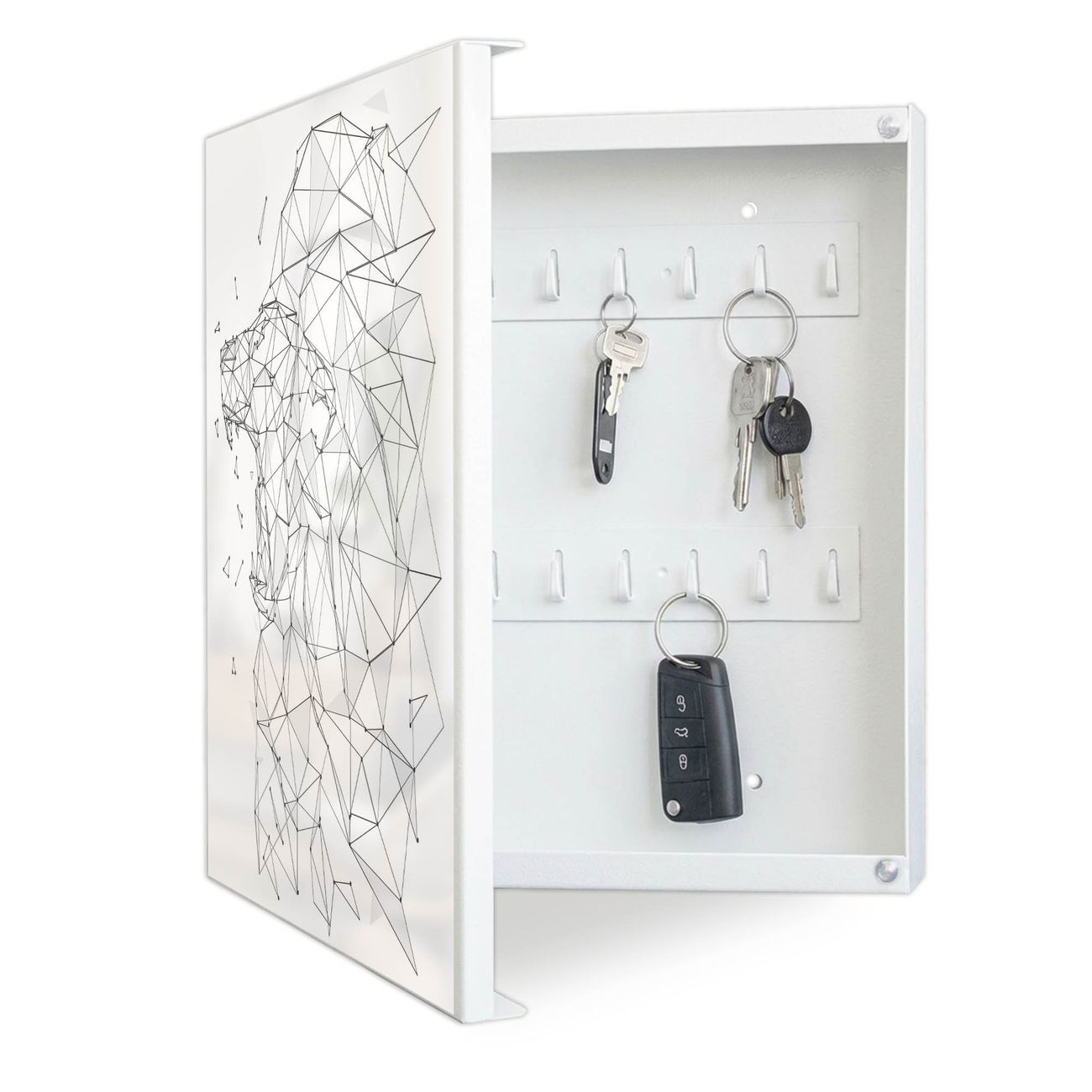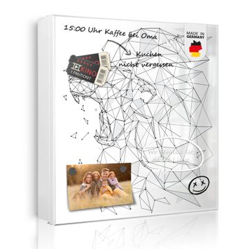Bringe Ordnung und Eleganz in deinen Eingangsbereich mit dem banjado Schlüsselkasten Motiv Motiv Löwe abstrakt 2. Die moderne Schlüsselbox kombiniert funktionales Design mit hochwertiger Verarbeitung und wird so zu einem echten Hingucker in Flur, Büro oder Ferienwohnung. ✅ Stilvolle Schlüsselaufbewahrung mit Motiv Motiv Löwe abstrakt 2 Der Design-Schlüsselkasten Motiv Motiv Löwe abstrakt 2 bietet Platz für bis zu 32 Schlüssel, die auf 4 stabilen Reihen mit je 8 Haken übersichtlich verstaut werden. Mit seinen kompakten Maßen von 30 x 30 x 5 cm passt die Schlüsselbox perfekt auch in kleinere Räume. Der weiß lackierte Stahlkorpus mit links angeschlagenem Türscharnier harmoniert mit gedruckten Folie auf der Front und fügt sich nahtlos in jedes Wohnambiente ein. Ob als Schlüsselorganizer für Zuhause oder als praktische Lösung für Büros, Praxen und Gewerbe, der banjado Schlüsselkasten sorgt für Ordnung und Übersicht. Dank der magnetischen, mit Kreidestiften beschreibbaren Folie auf der Front kannst du Notizen anheften oder Termine direkt auf der Oberfläche festhalten. Die Schlüsselbox Motiv Motiv Löwe abstrakt 2 zur Wandmontage wird inklusive Befestigungsmaterial geliefert und ist schnell angebracht. So hast du deine Schlüssel jederzeit griffbereit und zugleich stilvoll verstaut. Mit diesem banjado Schlüsselkasten Motiv Motiv Löwe abstrakt 2 kombinierst du praktische Aufbewahrung mit stilvollem Wohndesign. Ob privat oder geschäftlich, die Schlüsselbox sorgt für mehr Ordnung, Übersicht und ein wohnliches Ambiente.Vorteile im Überblick
