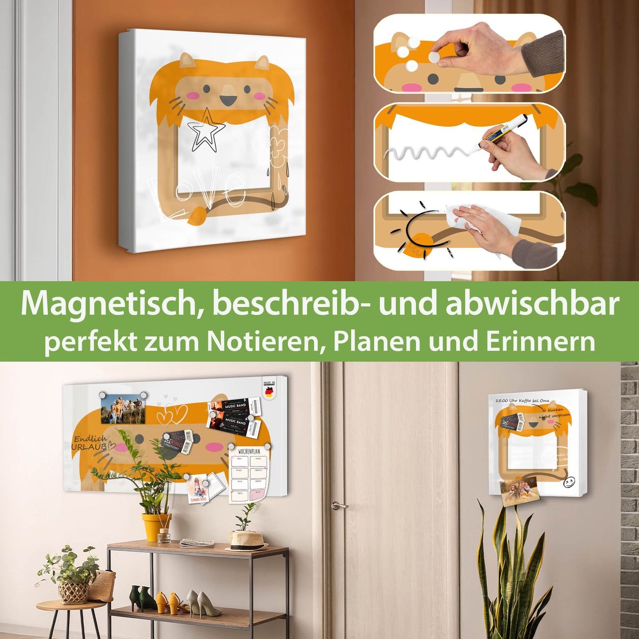 Bringe Ordnung und Eleganz in deinen Eingangsbereich mit dem banjado Schlüsselkasten Motiv Motiv Löwe bilderrahmen. Die moderne Schlüsselbox kombiniert funktionales Design mit hochwertiger Verarbeitung und wird so zu einem echten Hingucker in Flur, Büro oder Ferienwohnung. ✅ Stilvolle Schlüsselaufbewahrung mit Motiv Motiv Löwe bilderrahmen Der Design-Schlüsselkasten Motiv Motiv Löwe bilderrahmen bietet Platz für bis zu 32 Schlüssel, die auf 4 stabilen Reihen mit je 8 Haken übersichtlich verstaut werden. Mit seinen kompakten Maßen von 30 x 30 x 5 cm passt die Schlüsselbox perfekt auch in kleinere Räume. Der weiß lackierte Stahlkorpus mit links angeschlagenem Türscharnier harmoniert mit gedruckten Folie auf der Front und fügt sich nahtlos in jedes Wohnambiente ein. Ob als Schlüsselorganizer für Zuhause oder als praktische Lösung für Büros, Praxen und Gewerbe, der banjado Schlüsselkasten sorgt für Ordnung und Übersicht. Dank der magnetischen, mit Kreidestiften beschreibbaren Folie auf der Front kannst du Notizen anheften oder Termine direkt auf der Oberfläche festhalten. Die Schlüsselbox Motiv Motiv Löwe bilderrahmen zur Wandmontage wird inklusive Befestigungsmaterial geliefert und ist schnell angebracht. So hast du deine Schlüssel jederzeit griffbereit und zugleich stilvoll verstaut. Mit diesem banjado Schlüsselkasten Motiv Motiv Löwe bilderrahmen kombinierst du praktische Aufbewahrung mit stilvollem Wohndesign. Ob privat oder geschäftlich, die Schlüsselbox sorgt für mehr Ordnung, Übersicht und ein wohnliches Ambiente.Vorteile im Überblick