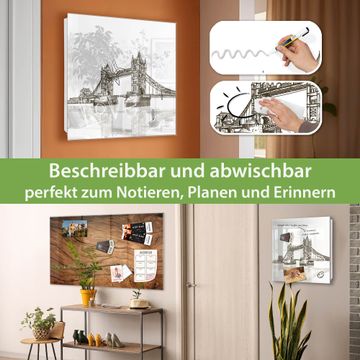 Bringe Ordnung und Eleganz in deinen Eingangsbereich mit dem banjado Schlüsselkasten Motiv Motiv London Brücke Illustration. Die moderne Schlüsselbox kombiniert funktionales Design mit hochwertiger Verarbeitung und wird so zu einem echten Hingucker in Flur, Büro oder Ferienwohnung. ✅ Stilvolle Schlüsselaufbewahrung mit Glasfront im Motiv Motiv London Brücke Illustration Der Design-Schlüsselkasten Motiv Motiv London Brücke Illustration bietet Platz für bis zu 50 Schlüssel, die auf 5 stabilen Reihen mit je 10 Haken übersichtlich verstaut werden. Mit seinen kompakten Maßen von 30 x 30 x 5 cm passt die Schlüsselbox perfekt auch in kleinere Räume. Der weiß lackierte Stahlkorpus mit rechts angeschlagenem Türscharnier harmoniert mit der Glasfront und fügt sich nahtlos in jedes Wohnambiente ein. Ob als Schlüsselorganizer für Zuhause oder als praktische Lösung für Büros, Praxen und Gewerbe, der banjado Schlüsselkasten sorgt für Ordnung und Übersicht. Dank der magnetischen, mit Kreidestiften beschreibbaren Glasfront kannst du Notizen anheften oder Termine direkt auf der Oberfläche festhalten. Die Schlüsselbox Motiv Motiv London Brücke Illustration zur Wandmontage wird inklusive Befestigungsmaterial geliefert und ist schnell angebracht. So hast du deine Schlüssel jederzeit griffbereit und zugleich stilvoll verstaut. Mit diesem banjado Schlüsselkasten Motiv Motiv London Brücke Illustration kombinierst du praktische Aufbewahrung mit stilvollem Wohndesign. Ob privat oder geschäftlich, die Schlüsselbox sorgt für mehr Ordnung, Übersicht und ein wohnliches Ambiente.Vorteile im Überblick