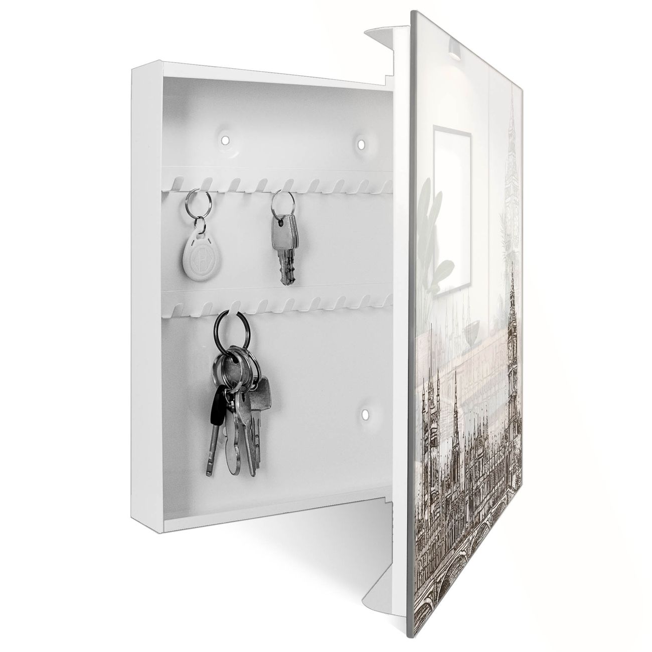 Bringe Ordnung und Eleganz in deinen Eingangsbereich mit dem banjado Schlüsselkasten Motiv Motiv London Skyline Skizze. Die moderne Schlüsselbox kombiniert funktionales Design mit hochwertiger Verarbeitung und wird so zu einem echten Hingucker in Flur, Büro oder Ferienwohnung. ✅ Stilvolle Schlüsselaufbewahrung mit Glasfront im Motiv Motiv London Skyline Skizze Der Design-Schlüsselkasten Motiv Motiv London Skyline Skizze bietet Platz für bis zu 50 Schlüssel, die auf 5 stabilen Reihen mit je 10 Haken übersichtlich verstaut werden. Mit seinen kompakten Maßen von 30 x 30 x 5 cm passt die Schlüsselbox perfekt auch in kleinere Räume. Der weiß lackierte Stahlkorpus mit rechts angeschlagenem Türscharnier harmoniert mit der Glasfront und fügt sich nahtlos in jedes Wohnambiente ein. Ob als Schlüsselorganizer für Zuhause oder als praktische Lösung für Büros, Praxen und Gewerbe, der banjado Schlüsselkasten sorgt für Ordnung und Übersicht. Dank der magnetischen, mit Kreidestiften beschreibbaren Glasfront kannst du Notizen anheften oder Termine direkt auf der Oberfläche festhalten. Die Schlüsselbox Motiv Motiv London Skyline Skizze zur Wandmontage wird inklusive Befestigungsmaterial geliefert und ist schnell angebracht. So hast du deine Schlüssel jederzeit griffbereit und zugleich stilvoll verstaut. Mit diesem banjado Schlüsselkasten Motiv Motiv London Skyline Skizze kombinierst du praktische Aufbewahrung mit stilvollem Wohndesign. Ob privat oder geschäftlich, die Schlüsselbox sorgt für mehr Ordnung, Übersicht und ein wohnliches Ambiente.Vorteile im Überblick