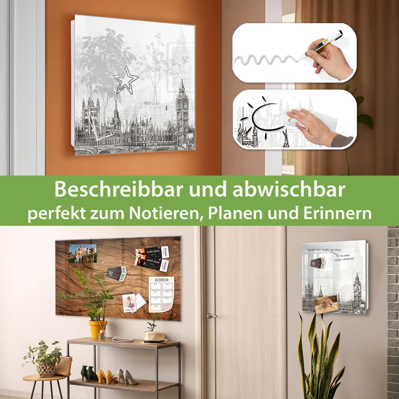 ✅ Magnetisch und mit Kreidestift beschreibbar, gehärtetes Glas, rechts angeschlagene TürOrdnung und Design in einem