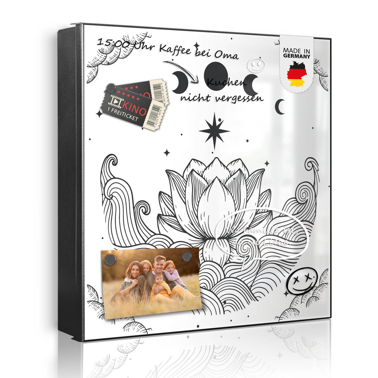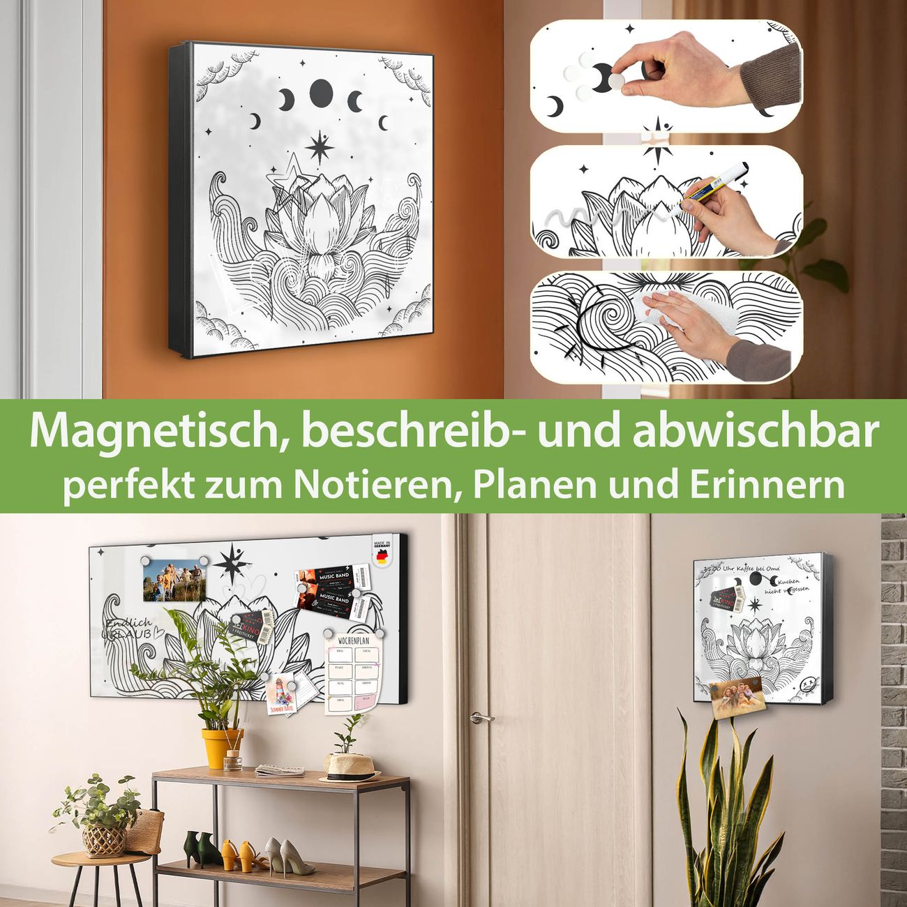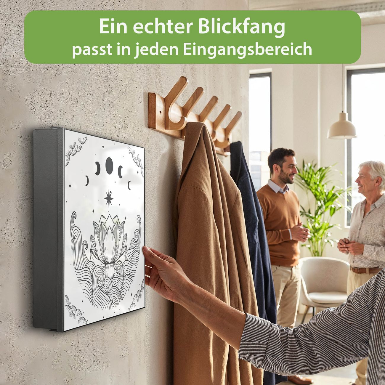 Bringe Ordnung und Eleganz in deinen Eingangsbereich mit dem banjado Schlüsselkasten Motiv Motiv Lotus und Mondphasen 2. Die moderne Schlüsselbox kombiniert funktionales Design mit hochwertiger Verarbeitung und wird so zu einem echten Hingucker in Flur, Büro oder Ferienwohnung. ✅ Stilvolle Schlüsselaufbewahrung mit Motiv Motiv Lotus und Mondphasen 2 Der Design-Schlüsselkasten Motiv Motiv Lotus und Mondphasen 2 bietet Platz für bis zu 32 Schlüssel, die auf 4 stabilen Reihen mit je 8 Haken übersichtlich verstaut werden. Mit seinen kompakten Maßen von 30 x 30 x 5 cm passt die Schlüsselbox perfekt auch in kleinere Räume. Der schwarz lackierte Stahlkorpus mit rechts angeschlagenem Türscharnier harmoniert mit gedruckten Folie auf der Front und fügt sich nahtlos in jedes Wohnambiente ein. Ob als Schlüsselorganizer für Zuhause oder als praktische Lösung für Büros, Praxen und Gewerbe, der banjado Schlüsselkasten sorgt für Ordnung und Übersicht. Dank der magnetischen, mit Kreidestiften beschreibbaren Folie auf der Front kannst du Notizen anheften oder Termine direkt auf der Oberfläche festhalten. Die Schlüsselbox Motiv Motiv Lotus und Mondphasen 2 zur Wandmontage wird inklusive Befestigungsmaterial geliefert und ist schnell angebracht. So hast du deine Schlüssel jederzeit griffbereit und zugleich stilvoll verstaut. Mit diesem banjado Schlüsselkasten Motiv Motiv Lotus und Mondphasen 2 kombinierst du praktische Aufbewahrung mit stilvollem Wohndesign. Ob privat oder geschäftlich, die Schlüsselbox sorgt für mehr Ordnung, Übersicht und ein wohnliches Ambiente.Vorteile im Überblick