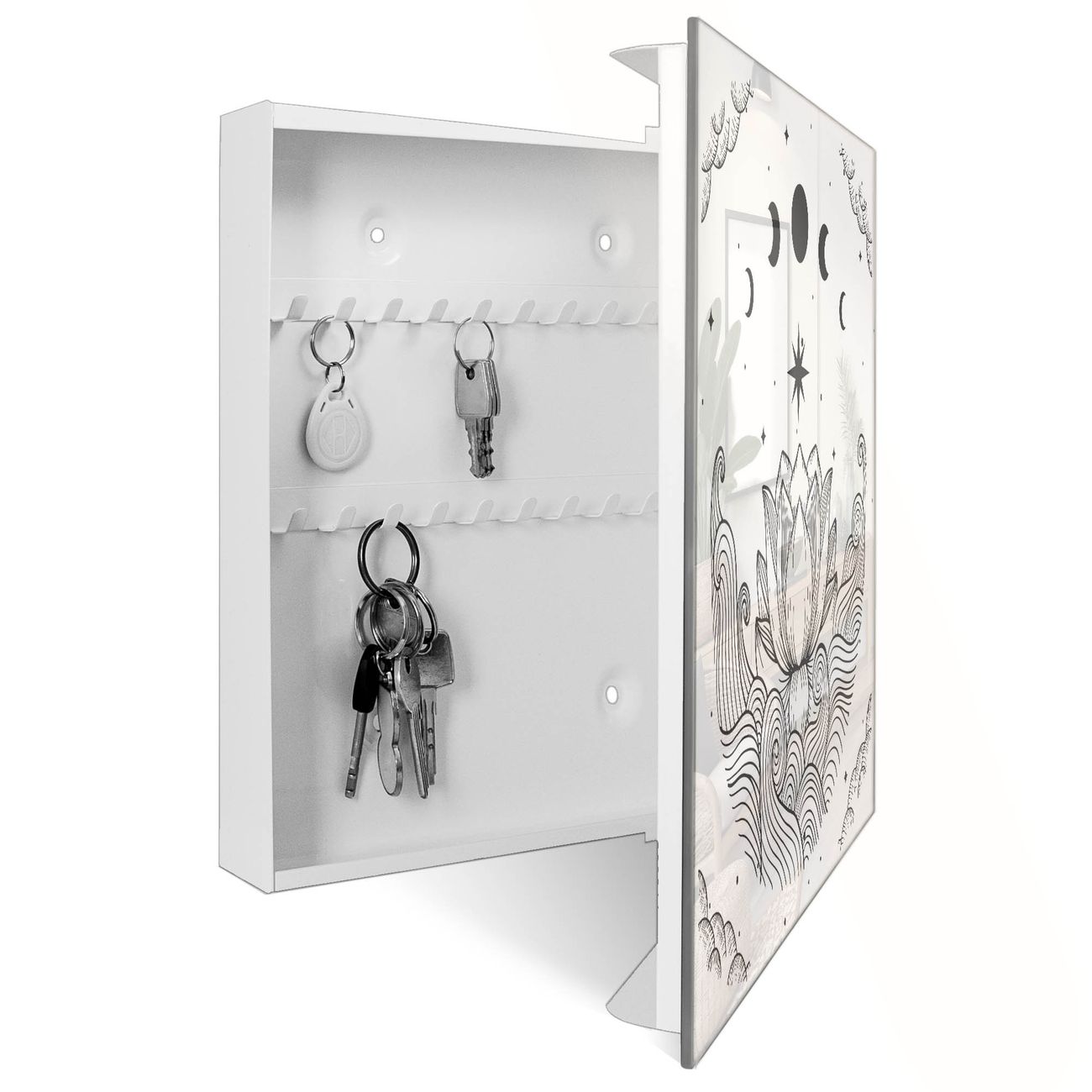 Bringe Ordnung und Eleganz in deinen Eingangsbereich mit dem banjado Schlüsselkasten Motiv Motiv Lotus und Mondphasen 2. Die moderne Schlüsselbox kombiniert funktionales Design mit hochwertiger Verarbeitung und wird so zu einem echten Hingucker in Flur, Büro oder Ferienwohnung. ✅ Stilvolle Schlüsselaufbewahrung mit Glasfront im Motiv Motiv Lotus und Mondphasen 2 Der Design-Schlüsselkasten Motiv Motiv Lotus und Mondphasen 2 bietet Platz für bis zu 50 Schlüssel, die auf 5 stabilen Reihen mit je 10 Haken übersichtlich verstaut werden. Mit seinen kompakten Maßen von 30 x 30 x 5 cm passt die Schlüsselbox perfekt auch in kleinere Räume. Der weiß lackierte Stahlkorpus mit rechts angeschlagenem Türscharnier harmoniert mit der Glasfront und fügt sich nahtlos in jedes Wohnambiente ein. Ob als Schlüsselorganizer für Zuhause oder als praktische Lösung für Büros, Praxen und Gewerbe, der banjado Schlüsselkasten sorgt für Ordnung und Übersicht. Dank der magnetischen, mit Kreidestiften beschreibbaren Glasfront kannst du Notizen anheften oder Termine direkt auf der Oberfläche festhalten. Die Schlüsselbox Motiv Motiv Lotus und Mondphasen 2 zur Wandmontage wird inklusive Befestigungsmaterial geliefert und ist schnell angebracht. So hast du deine Schlüssel jederzeit griffbereit und zugleich stilvoll verstaut. Mit diesem banjado Schlüsselkasten Motiv Motiv Lotus und Mondphasen 2 kombinierst du praktische Aufbewahrung mit stilvollem Wohndesign. Ob privat oder geschäftlich, die Schlüsselbox sorgt für mehr Ordnung, Übersicht und ein wohnliches Ambiente.Vorteile im Überblick