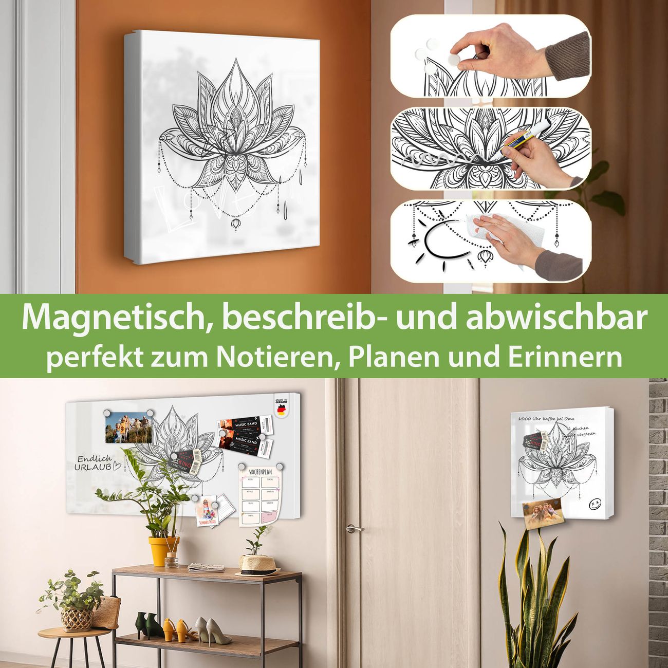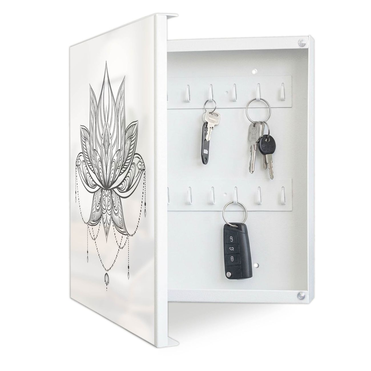 Bringe Ordnung und Eleganz in deinen Eingangsbereich mit dem banjado Schlüsselkasten Motiv Motiv Lotusblüte 7. Die moderne Schlüsselbox kombiniert funktionales Design mit hochwertiger Verarbeitung und wird so zu einem echten Hingucker in Flur, Büro oder Ferienwohnung. ✅ Stilvolle Schlüsselaufbewahrung mit Motiv Motiv Lotusblüte 7 Der Design-Schlüsselkasten Motiv Motiv Lotusblüte 7 bietet Platz für bis zu 32 Schlüssel, die auf 4 stabilen Reihen mit je 8 Haken übersichtlich verstaut werden. Mit seinen kompakten Maßen von 30 x 30 x 5 cm passt die Schlüsselbox perfekt auch in kleinere Räume. Der weiß lackierte Stahlkorpus mit links angeschlagenem Türscharnier harmoniert mit gedruckten Folie auf der Front und fügt sich nahtlos in jedes Wohnambiente ein. Ob als Schlüsselorganizer für Zuhause oder als praktische Lösung für Büros, Praxen und Gewerbe, der banjado Schlüsselkasten sorgt für Ordnung und Übersicht. Dank der magnetischen, mit Kreidestiften beschreibbaren Folie auf der Front kannst du Notizen anheften oder Termine direkt auf der Oberfläche festhalten. Die Schlüsselbox Motiv Motiv Lotusblüte 7 zur Wandmontage wird inklusive Befestigungsmaterial geliefert und ist schnell angebracht. So hast du deine Schlüssel jederzeit griffbereit und zugleich stilvoll verstaut. Mit diesem banjado Schlüsselkasten Motiv Motiv Lotusblüte 7 kombinierst du praktische Aufbewahrung mit stilvollem Wohndesign. Ob privat oder geschäftlich, die Schlüsselbox sorgt für mehr Ordnung, Übersicht und ein wohnliches Ambiente.Vorteile im Überblick