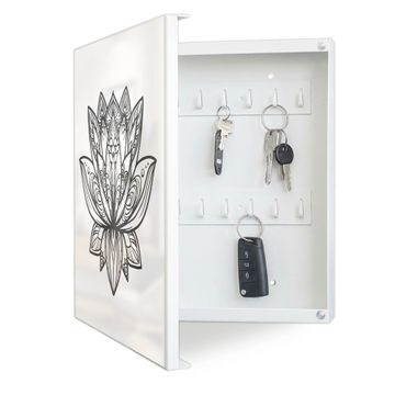 Bringe Ordnung und Eleganz in deinen Eingangsbereich mit dem banjado Schlüsselkasten Motiv Motiv Lotusblüte 8. Die moderne Schlüsselbox kombiniert funktionales Design mit hochwertiger Verarbeitung und wird so zu einem echten Hingucker in Flur, Büro oder Ferienwohnung. ✅ Stilvolle Schlüsselaufbewahrung mit Motiv Motiv Lotusblüte 8 Der Design-Schlüsselkasten Motiv Motiv Lotusblüte 8 bietet Platz für bis zu 32 Schlüssel, die auf 4 stabilen Reihen mit je 8 Haken übersichtlich verstaut werden. Mit seinen kompakten Maßen von 30 x 30 x 5 cm passt die Schlüsselbox perfekt auch in kleinere Räume. Der weiß lackierte Stahlkorpus mit links angeschlagenem Türscharnier harmoniert mit gedruckten Folie auf der Front und fügt sich nahtlos in jedes Wohnambiente ein. Ob als Schlüsselorganizer für Zuhause oder als praktische Lösung für Büros, Praxen und Gewerbe, der banjado Schlüsselkasten sorgt für Ordnung und Übersicht. Dank der magnetischen, mit Kreidestiften beschreibbaren Folie auf der Front kannst du Notizen anheften oder Termine direkt auf der Oberfläche festhalten. Die Schlüsselbox Motiv Motiv Lotusblüte 8 zur Wandmontage wird inklusive Befestigungsmaterial geliefert und ist schnell angebracht. So hast du deine Schlüssel jederzeit griffbereit und zugleich stilvoll verstaut. Mit diesem banjado Schlüsselkasten Motiv Motiv Lotusblüte 8 kombinierst du praktische Aufbewahrung mit stilvollem Wohndesign. Ob privat oder geschäftlich, die Schlüsselbox sorgt für mehr Ordnung, Übersicht und ein wohnliches Ambiente.Vorteile im Überblick