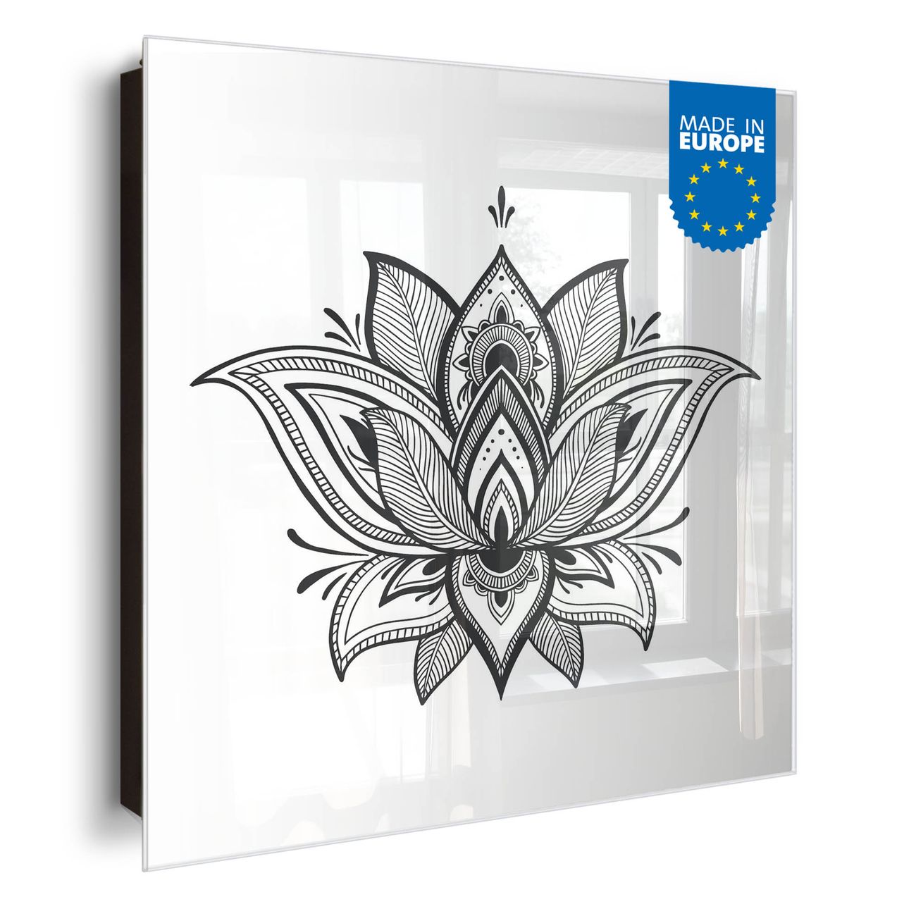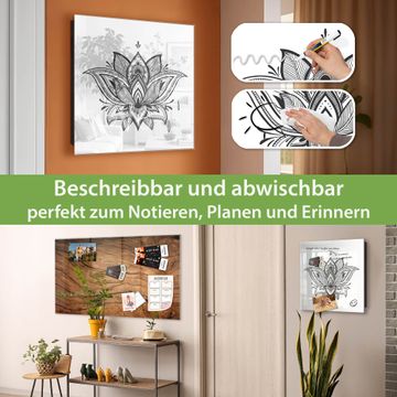 Bringe Ordnung und Eleganz in deinen Eingangsbereich mit dem banjado Schlüsselkasten Motiv Motiv Lotusblüte 9. Die moderne Schlüsselbox kombiniert funktionales Design mit hochwertiger Verarbeitung und wird so zu einem echten Hingucker in Flur, Büro oder Ferienwohnung. ✅ Stilvolle Schlüsselaufbewahrung mit Glasfront im Motiv Motiv Lotusblüte 9 Der Design-Schlüsselkasten Motiv Motiv Lotusblüte 9 bietet Platz für bis zu 50 Schlüssel, die auf 5 stabilen Reihen mit je 10 Haken übersichtlich verstaut werden. Mit seinen kompakten Maßen von 30 x 30 x 5 cm passt die Schlüsselbox perfekt auch in kleinere Räume. Der schwarz lackierte Stahlkorpus mit rechts angeschlagenem Türscharnier harmoniert mit der Glasfront und fügt sich nahtlos in jedes Wohnambiente ein. Ob als Schlüsselorganizer für Zuhause oder als praktische Lösung für Büros, Praxen und Gewerbe, der banjado Schlüsselkasten sorgt für Ordnung und Übersicht. Dank der magnetischen, mit Kreidestiften beschreibbaren Glasfront kannst du Notizen anheften oder Termine direkt auf der Oberfläche festhalten. Die Schlüsselbox Motiv Motiv Lotusblüte 9 zur Wandmontage wird inklusive Befestigungsmaterial geliefert und ist schnell angebracht. So hast du deine Schlüssel jederzeit griffbereit und zugleich stilvoll verstaut. Mit diesem banjado Schlüsselkasten Motiv Motiv Lotusblüte 9 kombinierst du praktische Aufbewahrung mit stilvollem Wohndesign. Ob privat oder geschäftlich, die Schlüsselbox sorgt für mehr Ordnung, Übersicht und ein wohnliches Ambiente.Vorteile im Überblick