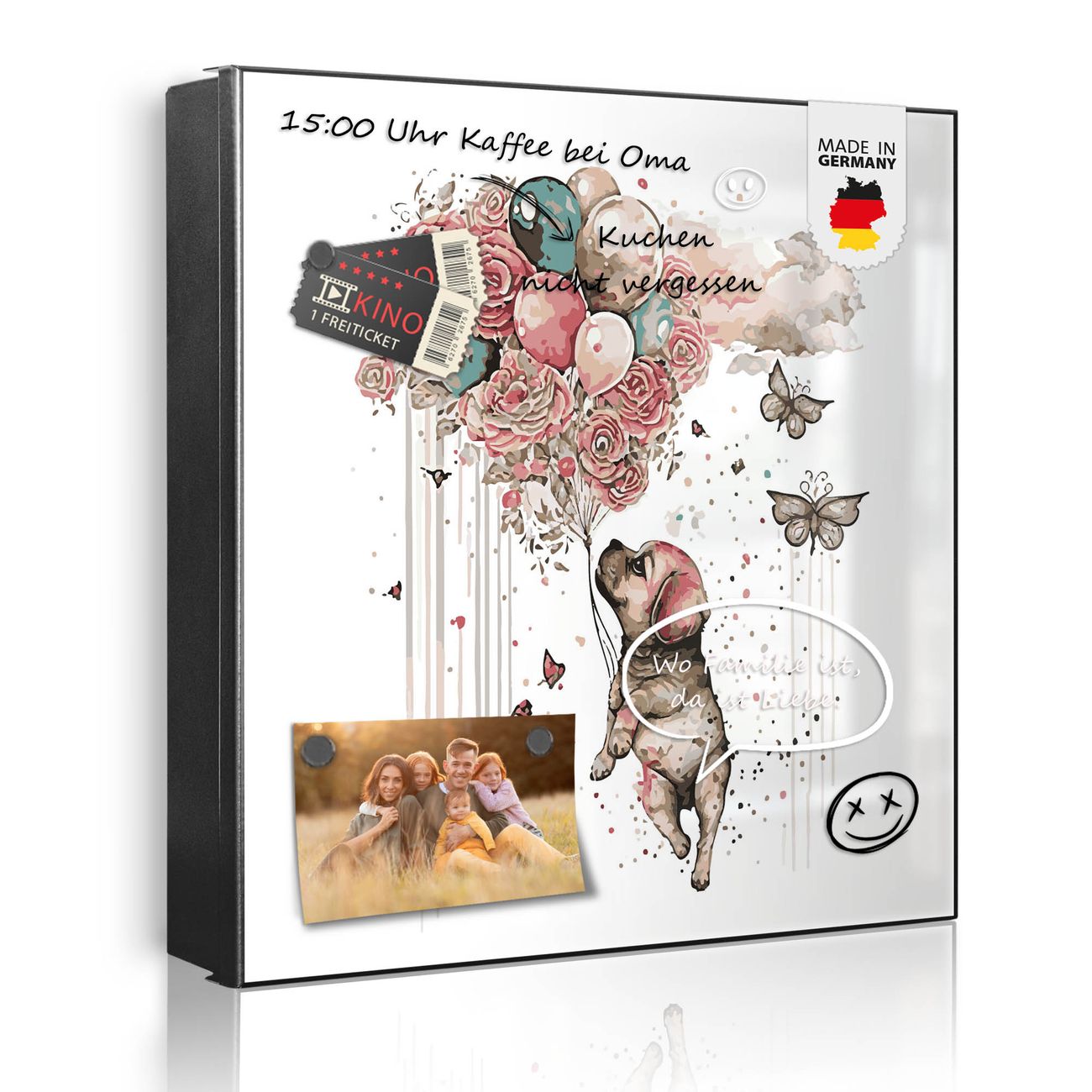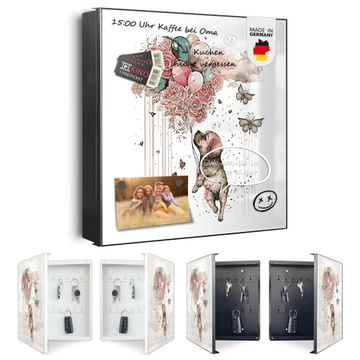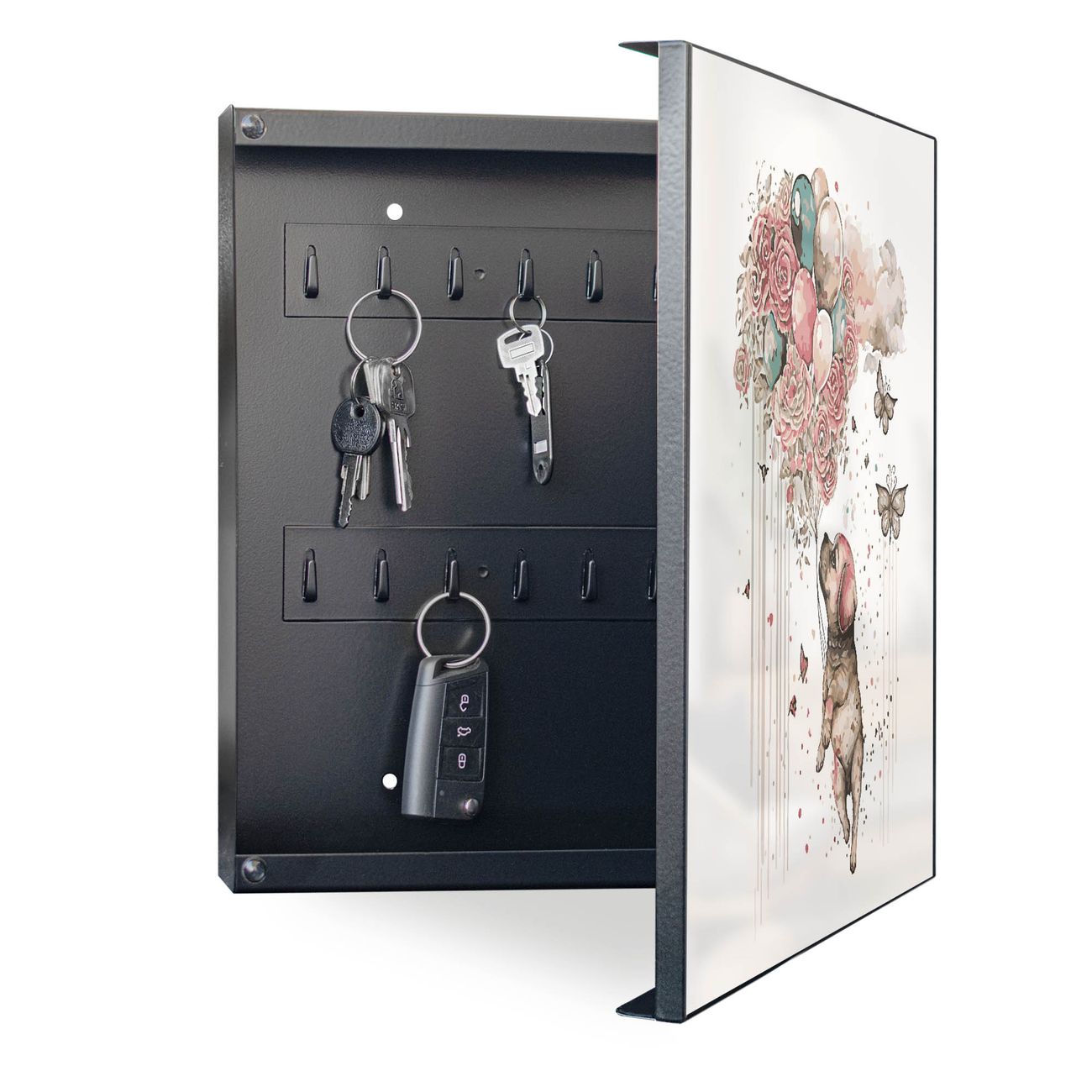 Bringe Ordnung und Eleganz in deinen Eingangsbereich mit dem banjado Schlüsselkasten Motiv Motiv Fliegender Welpe. Die moderne Schlüsselbox kombiniert funktionales Design mit hochwertiger Verarbeitung und wird so zu einem echten Hingucker in Flur, Büro oder Ferienwohnung. ✅ Stilvolle Schlüsselaufbewahrung mit Motiv Motiv Fliegender Welpe Der Design-Schlüsselkasten Motiv Motiv Fliegender Welpe bietet Platz für bis zu 32 Schlüssel, die auf 4 stabilen Reihen mit je 8 Haken übersichtlich verstaut werden. Mit seinen kompakten Maßen von 30 x 30 x 5 cm passt die Schlüsselbox perfekt auch in kleinere Räume. Der schwarz lackierte Stahlkorpus mit rechts angeschlagenem Türscharnier harmoniert mit gedruckten Folie auf der Front und fügt sich nahtlos in jedes Wohnambiente ein. Ob als Schlüsselorganizer für Zuhause oder als praktische Lösung für Büros, Praxen und Gewerbe, der banjado Schlüsselkasten sorgt für Ordnung und Übersicht. Dank der magnetischen, mit Kreidestiften beschreibbaren Folie auf der Front kannst du Notizen anheften oder Termine direkt auf der Oberfläche festhalten. Die Schlüsselbox Motiv Motiv Fliegender Welpe zur Wandmontage wird inklusive Befestigungsmaterial geliefert und ist schnell angebracht. So hast du deine Schlüssel jederzeit griffbereit und zugleich stilvoll verstaut. Mit diesem banjado Schlüsselkasten Motiv Motiv Fliegender Welpe kombinierst du praktische Aufbewahrung mit stilvollem Wohndesign. Ob privat oder geschäftlich, die Schlüsselbox sorgt für mehr Ordnung, Übersicht und ein wohnliches Ambiente.Vorteile im Überblick