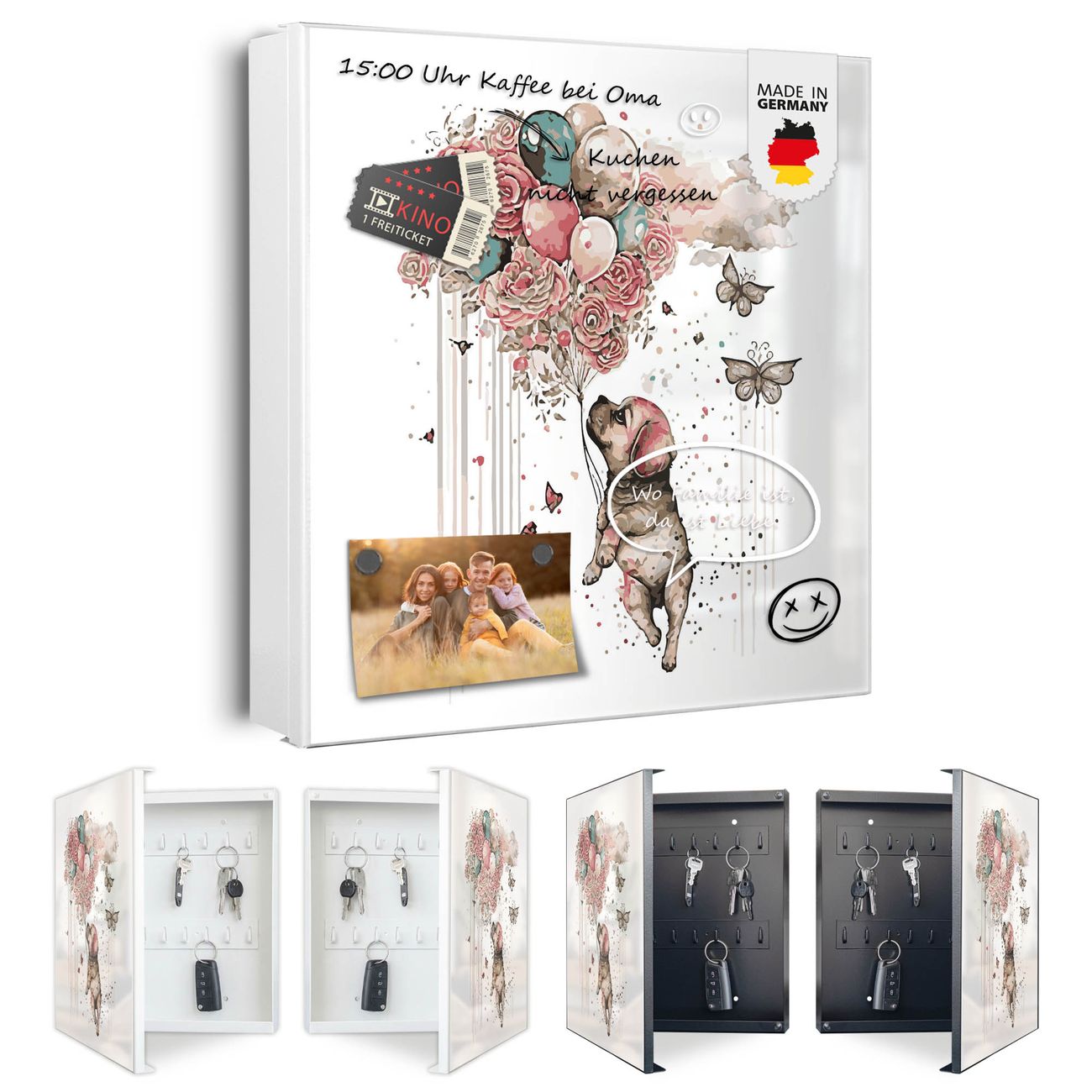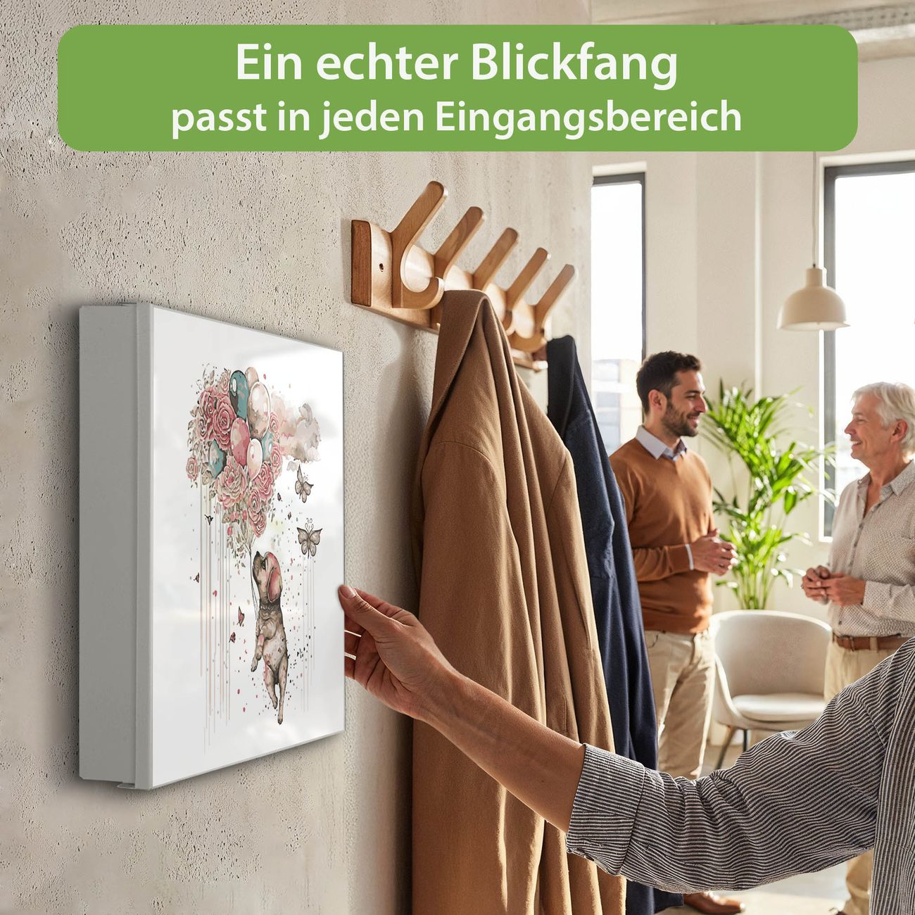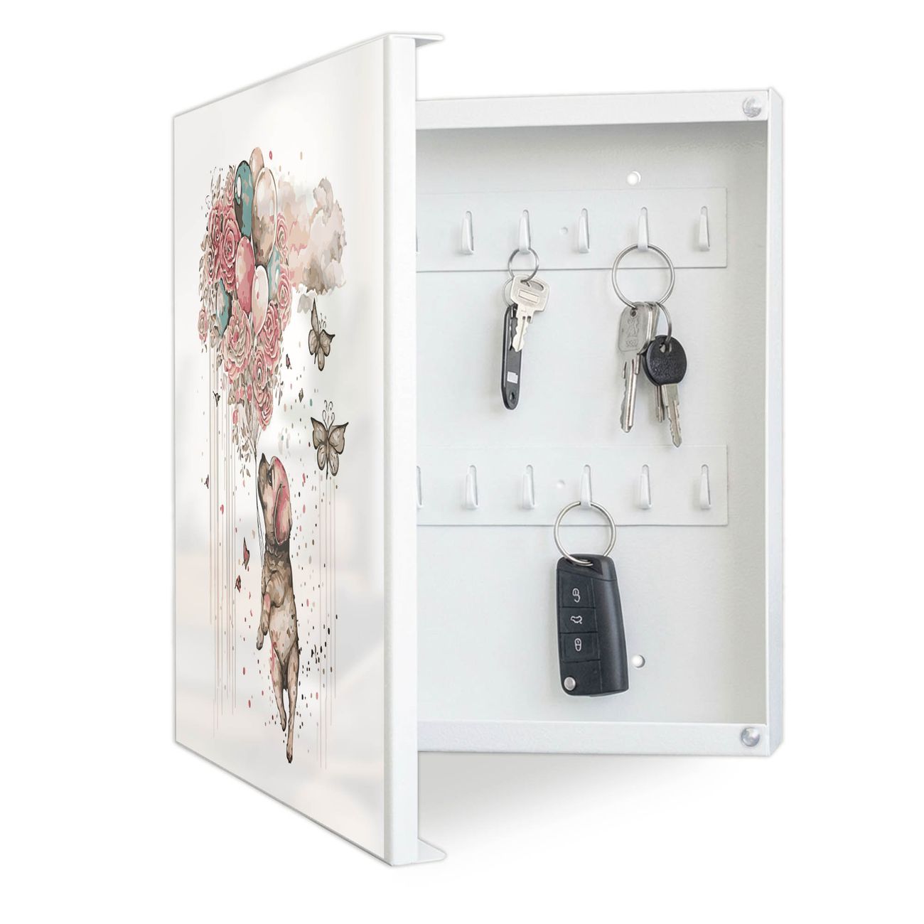 Bringe Ordnung und Eleganz in deinen Eingangsbereich mit dem banjado Schlüsselkasten Motiv Motiv Fliegender Welpe. Die moderne Schlüsselbox kombiniert funktionales Design mit hochwertiger Verarbeitung und wird so zu einem echten Hingucker in Flur, Büro oder Ferienwohnung. ✅ Stilvolle Schlüsselaufbewahrung mit Motiv Motiv Fliegender Welpe Der Design-Schlüsselkasten Motiv Motiv Fliegender Welpe bietet Platz für bis zu 32 Schlüssel, die auf 4 stabilen Reihen mit je 8 Haken übersichtlich verstaut werden. Mit seinen kompakten Maßen von 30 x 30 x 5 cm passt die Schlüsselbox perfekt auch in kleinere Räume. Der weiß lackierte Stahlkorpus mit links angeschlagenem Türscharnier harmoniert mit gedruckten Folie auf der Front und fügt sich nahtlos in jedes Wohnambiente ein. Ob als Schlüsselorganizer für Zuhause oder als praktische Lösung für Büros, Praxen und Gewerbe, der banjado Schlüsselkasten sorgt für Ordnung und Übersicht. Dank der magnetischen, mit Kreidestiften beschreibbaren Folie auf der Front kannst du Notizen anheften oder Termine direkt auf der Oberfläche festhalten. Die Schlüsselbox Motiv Motiv Fliegender Welpe zur Wandmontage wird inklusive Befestigungsmaterial geliefert und ist schnell angebracht. So hast du deine Schlüssel jederzeit griffbereit und zugleich stilvoll verstaut. Mit diesem banjado Schlüsselkasten Motiv Motiv Fliegender Welpe kombinierst du praktische Aufbewahrung mit stilvollem Wohndesign. Ob privat oder geschäftlich, die Schlüsselbox sorgt für mehr Ordnung, Übersicht und ein wohnliches Ambiente.Vorteile im Überblick