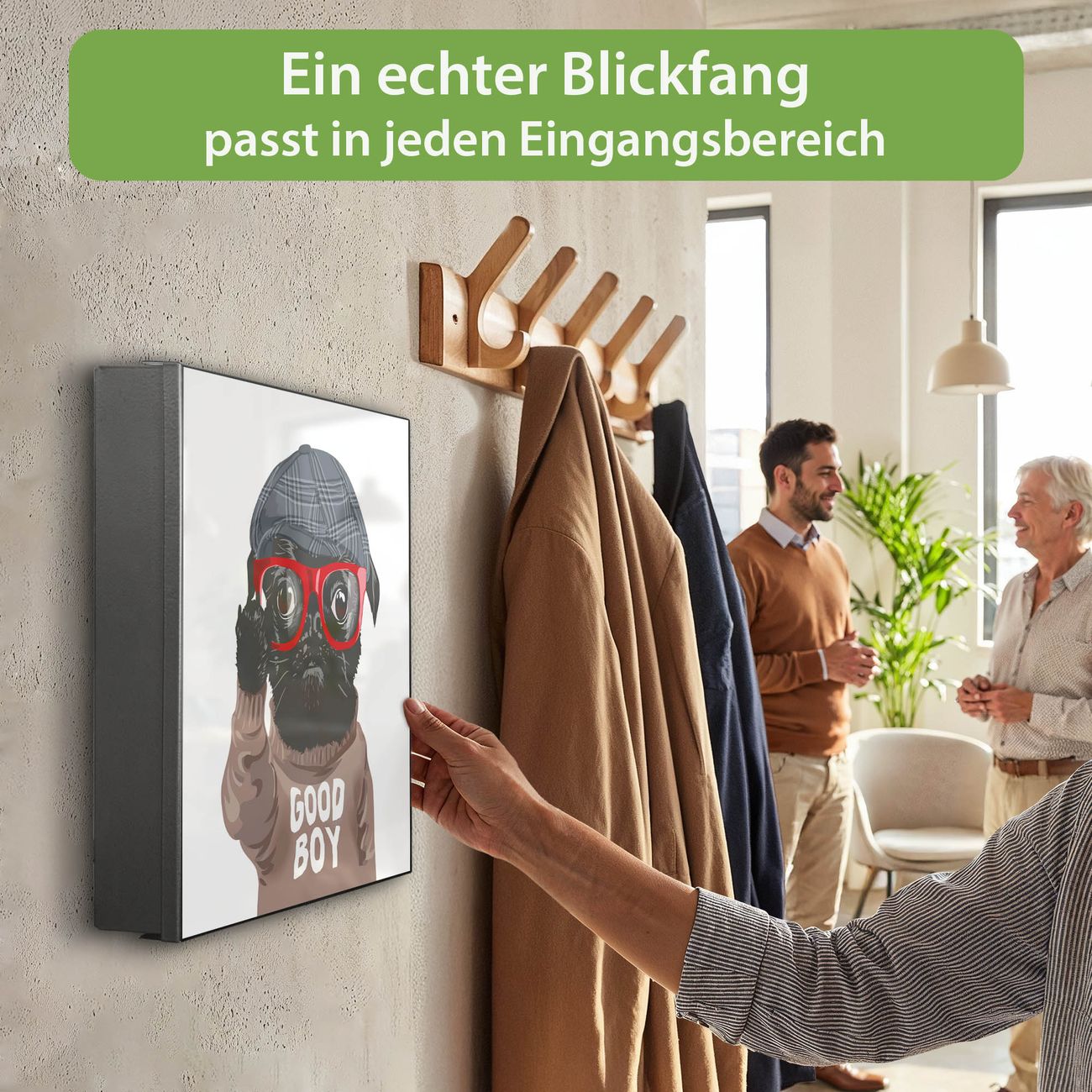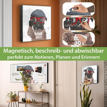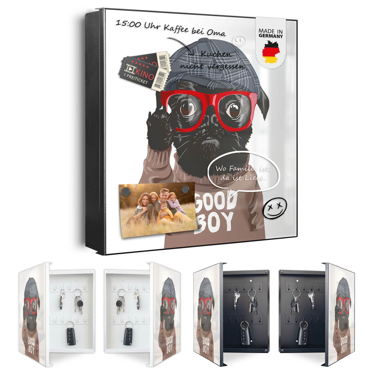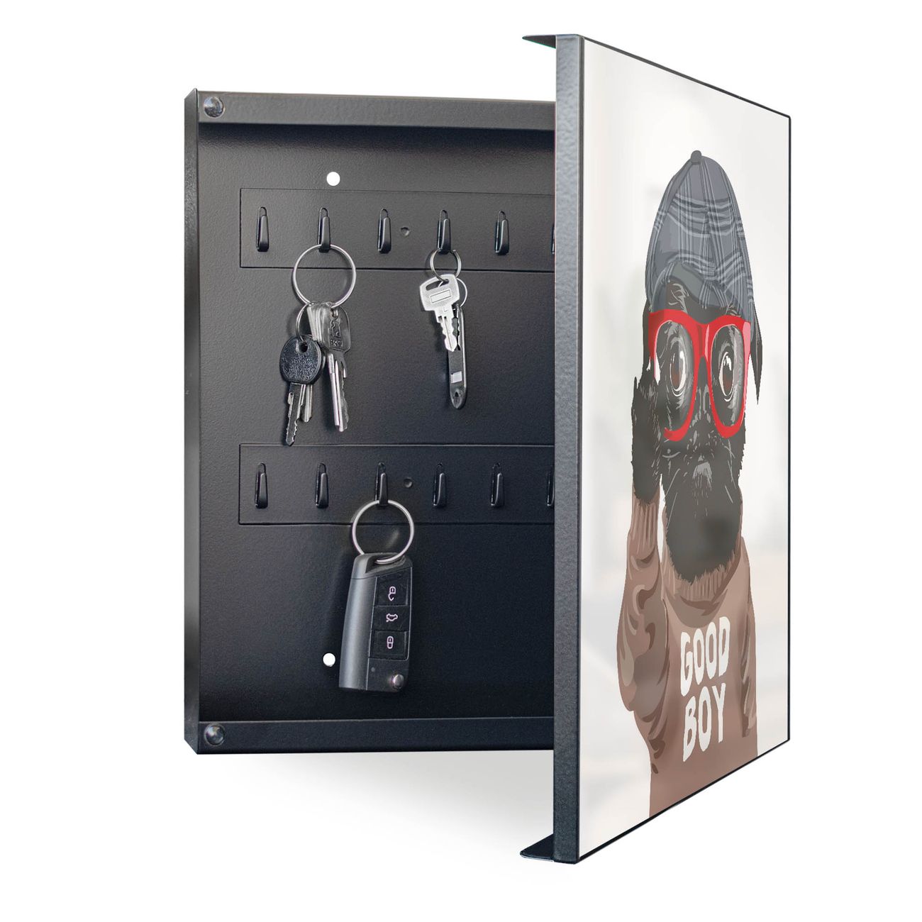 Bringe Ordnung und Eleganz in deinen Eingangsbereich mit dem banjado Schlüsselkasten Motiv Motiv Lustiger Mops mit Brille. Die moderne Schlüsselbox kombiniert funktionales Design mit hochwertiger Verarbeitung und wird so zu einem echten Hingucker in Flur, Büro oder Ferienwohnung. ✅ Stilvolle Schlüsselaufbewahrung mit Motiv Motiv Lustiger Mops mit Brille Der Design-Schlüsselkasten Motiv Motiv Lustiger Mops mit Brille bietet Platz für bis zu 32 Schlüssel, die auf 4 stabilen Reihen mit je 8 Haken übersichtlich verstaut werden. Mit seinen kompakten Maßen von 30 x 30 x 5 cm passt die Schlüsselbox perfekt auch in kleinere Räume. Der schwarz lackierte Stahlkorpus mit rechts angeschlagenem Türscharnier harmoniert mit gedruckten Folie auf der Front und fügt sich nahtlos in jedes Wohnambiente ein. Ob als Schlüsselorganizer für Zuhause oder als praktische Lösung für Büros, Praxen und Gewerbe, der banjado Schlüsselkasten sorgt für Ordnung und Übersicht. Dank der magnetischen, mit Kreidestiften beschreibbaren Folie auf der Front kannst du Notizen anheften oder Termine direkt auf der Oberfläche festhalten. Die Schlüsselbox Motiv Motiv Lustiger Mops mit Brille zur Wandmontage wird inklusive Befestigungsmaterial geliefert und ist schnell angebracht. So hast du deine Schlüssel jederzeit griffbereit und zugleich stilvoll verstaut. Mit diesem banjado Schlüsselkasten Motiv Motiv Lustiger Mops mit Brille kombinierst du praktische Aufbewahrung mit stilvollem Wohndesign. Ob privat oder geschäftlich, die Schlüsselbox sorgt für mehr Ordnung, Übersicht und ein wohnliches Ambiente.Vorteile im Überblick