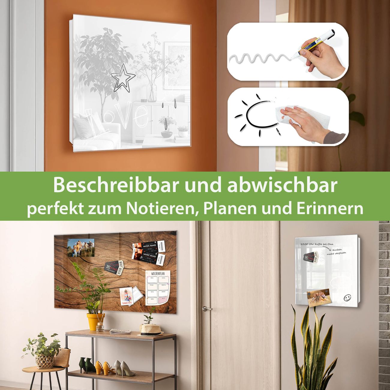 ✅ Magnetisch und mit Kreidestift beschreibbar, gehärtetes Glas, links angeschlagene TürOrdnung und Design in einem