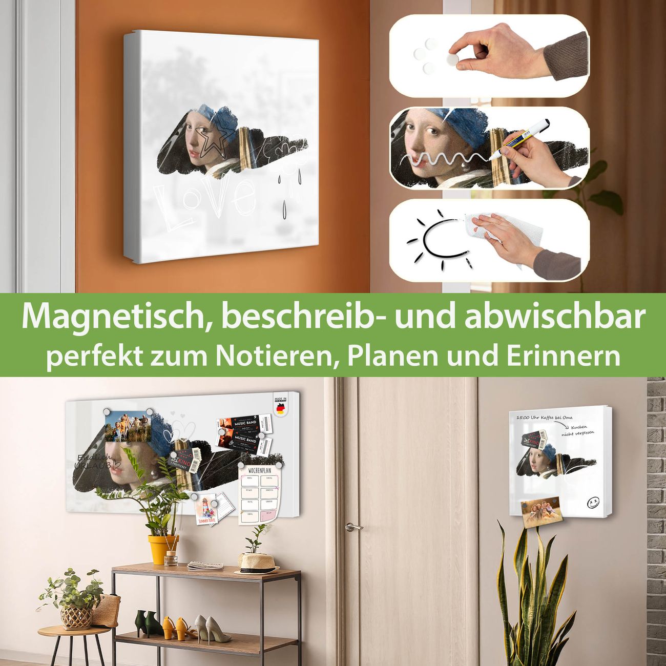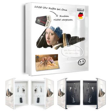 Bringe Ordnung und Eleganz in deinen Eingangsbereich mit dem banjado Schlüsselkasten Motiv Motiv Mädchen mit dem Perlenohrring. Die moderne Schlüsselbox kombiniert funktionales Design mit hochwertiger Verarbeitung und wird so zu einem echten Hingucker in Flur, Büro oder Ferienwohnung. ✅ Stilvolle Schlüsselaufbewahrung mit Motiv Motiv Mädchen mit dem Perlenohrring Der Design-Schlüsselkasten Motiv Motiv Mädchen mit dem Perlenohrring bietet Platz für bis zu 32 Schlüssel, die auf 4 stabilen Reihen mit je 8 Haken übersichtlich verstaut werden. Mit seinen kompakten Maßen von 30 x 30 x 5 cm passt die Schlüsselbox perfekt auch in kleinere Räume. Der weiß lackierte Stahlkorpus mit links angeschlagenem Türscharnier harmoniert mit gedruckten Folie auf der Front und fügt sich nahtlos in jedes Wohnambiente ein. Ob als Schlüsselorganizer für Zuhause oder als praktische Lösung für Büros, Praxen und Gewerbe, der banjado Schlüsselkasten sorgt für Ordnung und Übersicht. Dank der magnetischen, mit Kreidestiften beschreibbaren Folie auf der Front kannst du Notizen anheften oder Termine direkt auf der Oberfläche festhalten. Die Schlüsselbox Motiv Motiv Mädchen mit dem Perlenohrring zur Wandmontage wird inklusive Befestigungsmaterial geliefert und ist schnell angebracht. So hast du deine Schlüssel jederzeit griffbereit und zugleich stilvoll verstaut. Mit diesem banjado Schlüsselkasten Motiv Motiv Mädchen mit dem Perlenohrring kombinierst du praktische Aufbewahrung mit stilvollem Wohndesign. Ob privat oder geschäftlich, die Schlüsselbox sorgt für mehr Ordnung, Übersicht und ein wohnliches Ambiente.Vorteile im Überblick