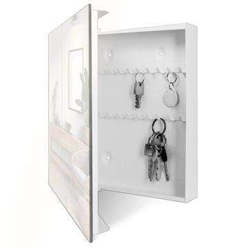 Bringe Ordnung und Eleganz in deinen Eingangsbereich mit dem banjado Schlüsselkasten Motiv Motiv Mädchen mit dem Perlenohrring. Die moderne Schlüsselbox kombiniert funktionales Design mit hochwertiger Verarbeitung und wird so zu einem echten Hingucker in Flur, Büro oder Ferienwohnung. ✅ Stilvolle Schlüsselaufbewahrung mit Glasfront im Motiv Motiv Mädchen mit dem Perlenohrring Der Design-Schlüsselkasten Motiv Motiv Mädchen mit dem Perlenohrring bietet Platz für bis zu 50 Schlüssel, die auf 5 stabilen Reihen mit je 10 Haken übersichtlich verstaut werden. Mit seinen kompakten Maßen von 30 x 30 x 5 cm passt die Schlüsselbox perfekt auch in kleinere Räume. Der weiß lackierte Stahlkorpus mit rechts angeschlagenem Türscharnier harmoniert mit der Glasfront und fügt sich nahtlos in jedes Wohnambiente ein. Ob als Schlüsselorganizer für Zuhause oder als praktische Lösung für Büros, Praxen und Gewerbe, der banjado Schlüsselkasten sorgt für Ordnung und Übersicht. Dank der magnetischen, mit Kreidestiften beschreibbaren Glasfront kannst du Notizen anheften oder Termine direkt auf der Oberfläche festhalten. Die Schlüsselbox Motiv Motiv Mädchen mit dem Perlenohrring zur Wandmontage wird inklusive Befestigungsmaterial geliefert und ist schnell angebracht. So hast du deine Schlüssel jederzeit griffbereit und zugleich stilvoll verstaut. Mit diesem banjado Schlüsselkasten Motiv Motiv Mädchen mit dem Perlenohrring kombinierst du praktische Aufbewahrung mit stilvollem Wohndesign. Ob privat oder geschäftlich, die Schlüsselbox sorgt für mehr Ordnung, Übersicht und ein wohnliches Ambiente.Vorteile im Überblick