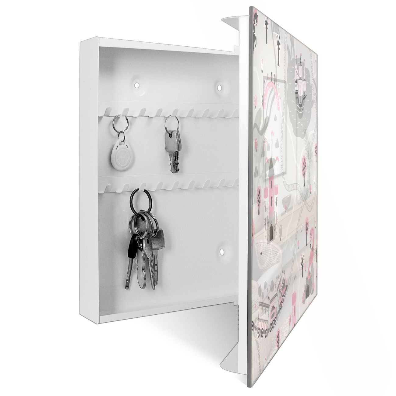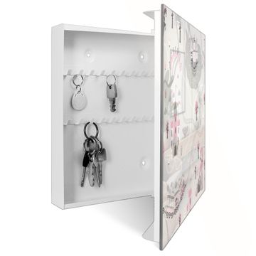 Bringe Ordnung und Eleganz in deinen Eingangsbereich mit dem banjado Schlüsselkasten Motiv Motiv Märchendorf 1. Die moderne Schlüsselbox kombiniert funktionales Design mit hochwertiger Verarbeitung und wird so zu einem echten Hingucker in Flur, Büro oder Ferienwohnung. ✅ Stilvolle Schlüsselaufbewahrung mit Glasfront im Motiv Motiv Märchendorf 1 Der Design-Schlüsselkasten Motiv Motiv Märchendorf 1 bietet Platz für bis zu 50 Schlüssel, die auf 5 stabilen Reihen mit je 10 Haken übersichtlich verstaut werden. Mit seinen kompakten Maßen von 30 x 30 x 5 cm passt die Schlüsselbox perfekt auch in kleinere Räume. Der weiß lackierte Stahlkorpus mit rechts angeschlagenem Türscharnier harmoniert mit der Glasfront und fügt sich nahtlos in jedes Wohnambiente ein. Ob als Schlüsselorganizer für Zuhause oder als praktische Lösung für Büros, Praxen und Gewerbe, der banjado Schlüsselkasten sorgt für Ordnung und Übersicht. Dank der magnetischen, mit Kreidestiften beschreibbaren Glasfront kannst du Notizen anheften oder Termine direkt auf der Oberfläche festhalten. Die Schlüsselbox Motiv Motiv Märchendorf 1 zur Wandmontage wird inklusive Befestigungsmaterial geliefert und ist schnell angebracht. So hast du deine Schlüssel jederzeit griffbereit und zugleich stilvoll verstaut. Mit diesem banjado Schlüsselkasten Motiv Motiv Märchendorf 1 kombinierst du praktische Aufbewahrung mit stilvollem Wohndesign. Ob privat oder geschäftlich, die Schlüsselbox sorgt für mehr Ordnung, Übersicht und ein wohnliches Ambiente.Vorteile im Überblick