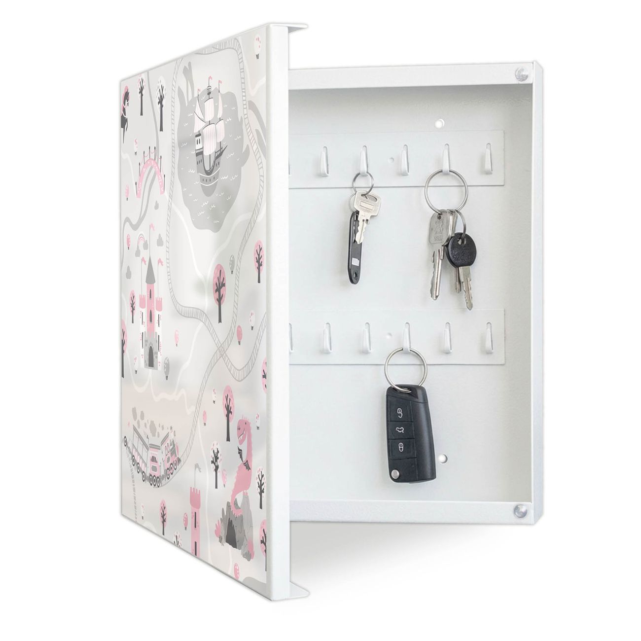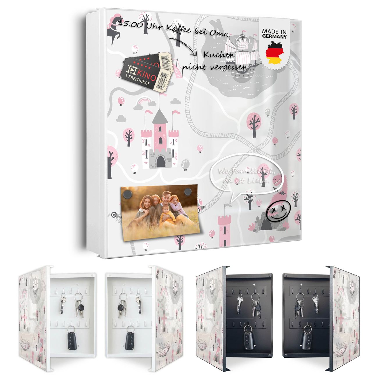 Bringe Ordnung und Eleganz in deinen Eingangsbereich mit dem banjado Schlüsselkasten Motiv Motiv Märchendorf 1. Die moderne Schlüsselbox kombiniert funktionales Design mit hochwertiger Verarbeitung und wird so zu einem echten Hingucker in Flur, Büro oder Ferienwohnung. ✅ Stilvolle Schlüsselaufbewahrung mit Motiv Motiv Märchendorf 1 Der Design-Schlüsselkasten Motiv Motiv Märchendorf 1 bietet Platz für bis zu 32 Schlüssel, die auf 4 stabilen Reihen mit je 8 Haken übersichtlich verstaut werden. Mit seinen kompakten Maßen von 30 x 30 x 5 cm passt die Schlüsselbox perfekt auch in kleinere Räume. Der weiß lackierte Stahlkorpus mit links angeschlagenem Türscharnier harmoniert mit gedruckten Folie auf der Front und fügt sich nahtlos in jedes Wohnambiente ein. Ob als Schlüsselorganizer für Zuhause oder als praktische Lösung für Büros, Praxen und Gewerbe, der banjado Schlüsselkasten sorgt für Ordnung und Übersicht. Dank der magnetischen, mit Kreidestiften beschreibbaren Folie auf der Front kannst du Notizen anheften oder Termine direkt auf der Oberfläche festhalten. Die Schlüsselbox Motiv Motiv Märchendorf 1 zur Wandmontage wird inklusive Befestigungsmaterial geliefert und ist schnell angebracht. So hast du deine Schlüssel jederzeit griffbereit und zugleich stilvoll verstaut. Mit diesem banjado Schlüsselkasten Motiv Motiv Märchendorf 1 kombinierst du praktische Aufbewahrung mit stilvollem Wohndesign. Ob privat oder geschäftlich, die Schlüsselbox sorgt für mehr Ordnung, Übersicht und ein wohnliches Ambiente.Vorteile im Überblick