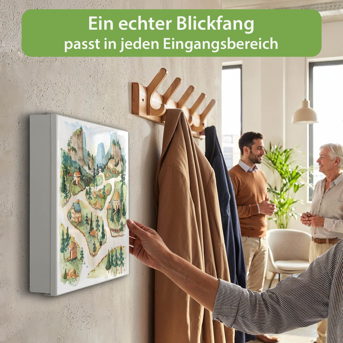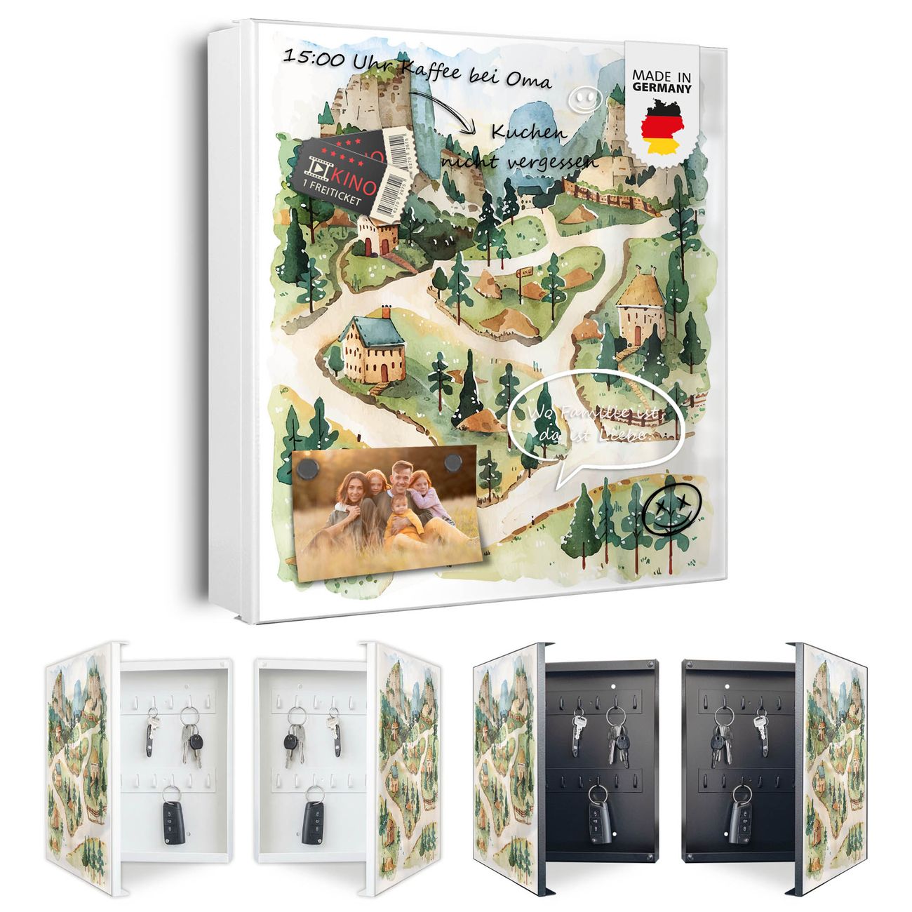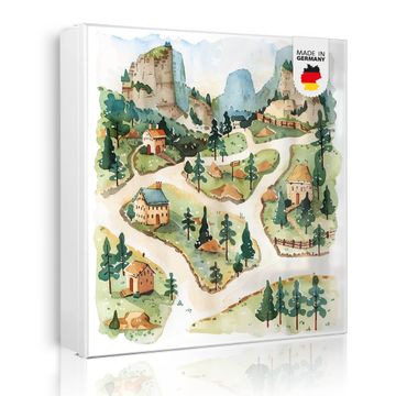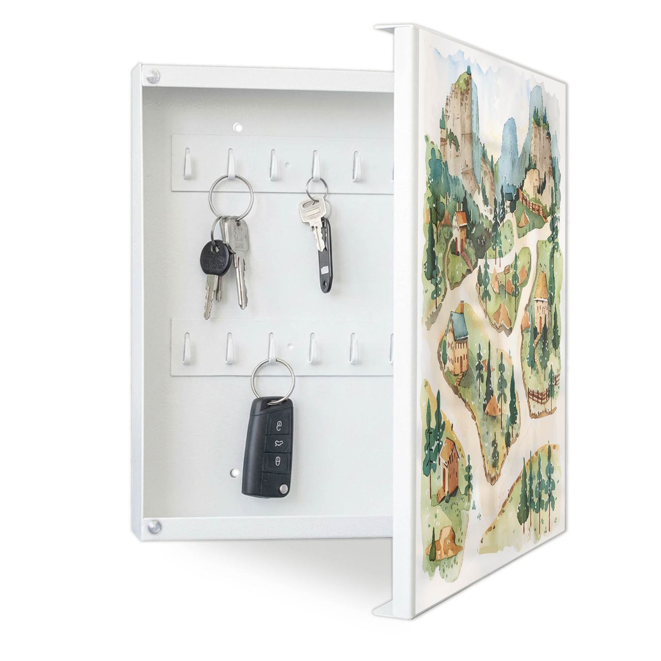Bringe Ordnung und Eleganz in deinen Eingangsbereich mit dem banjado Schlüsselkasten Motiv Motiv Märchendorf 3. Die moderne Schlüsselbox kombiniert funktionales Design mit hochwertiger Verarbeitung und wird so zu einem echten Hingucker in Flur, Büro oder Ferienwohnung. ✅ Stilvolle Schlüsselaufbewahrung mit Motiv Motiv Märchendorf 3 Der Design-Schlüsselkasten Motiv Motiv Märchendorf 3 bietet Platz für bis zu 32 Schlüssel, die auf 4 stabilen Reihen mit je 8 Haken übersichtlich verstaut werden. Mit seinen kompakten Maßen von 30 x 30 x 5 cm passt die Schlüsselbox perfekt auch in kleinere Räume. Der weiß lackierte Stahlkorpus mit rechts angeschlagenem Türscharnier harmoniert mit gedruckten Folie auf der Front und fügt sich nahtlos in jedes Wohnambiente ein. Ob als Schlüsselorganizer für Zuhause oder als praktische Lösung für Büros, Praxen und Gewerbe, der banjado Schlüsselkasten sorgt für Ordnung und Übersicht. Dank der magnetischen, mit Kreidestiften beschreibbaren Folie auf der Front kannst du Notizen anheften oder Termine direkt auf der Oberfläche festhalten. Die Schlüsselbox Motiv Motiv Märchendorf 3 zur Wandmontage wird inklusive Befestigungsmaterial geliefert und ist schnell angebracht. So hast du deine Schlüssel jederzeit griffbereit und zugleich stilvoll verstaut. Mit diesem banjado Schlüsselkasten Motiv Motiv Märchendorf 3 kombinierst du praktische Aufbewahrung mit stilvollem Wohndesign. Ob privat oder geschäftlich, die Schlüsselbox sorgt für mehr Ordnung, Übersicht und ein wohnliches Ambiente.Vorteile im Überblick