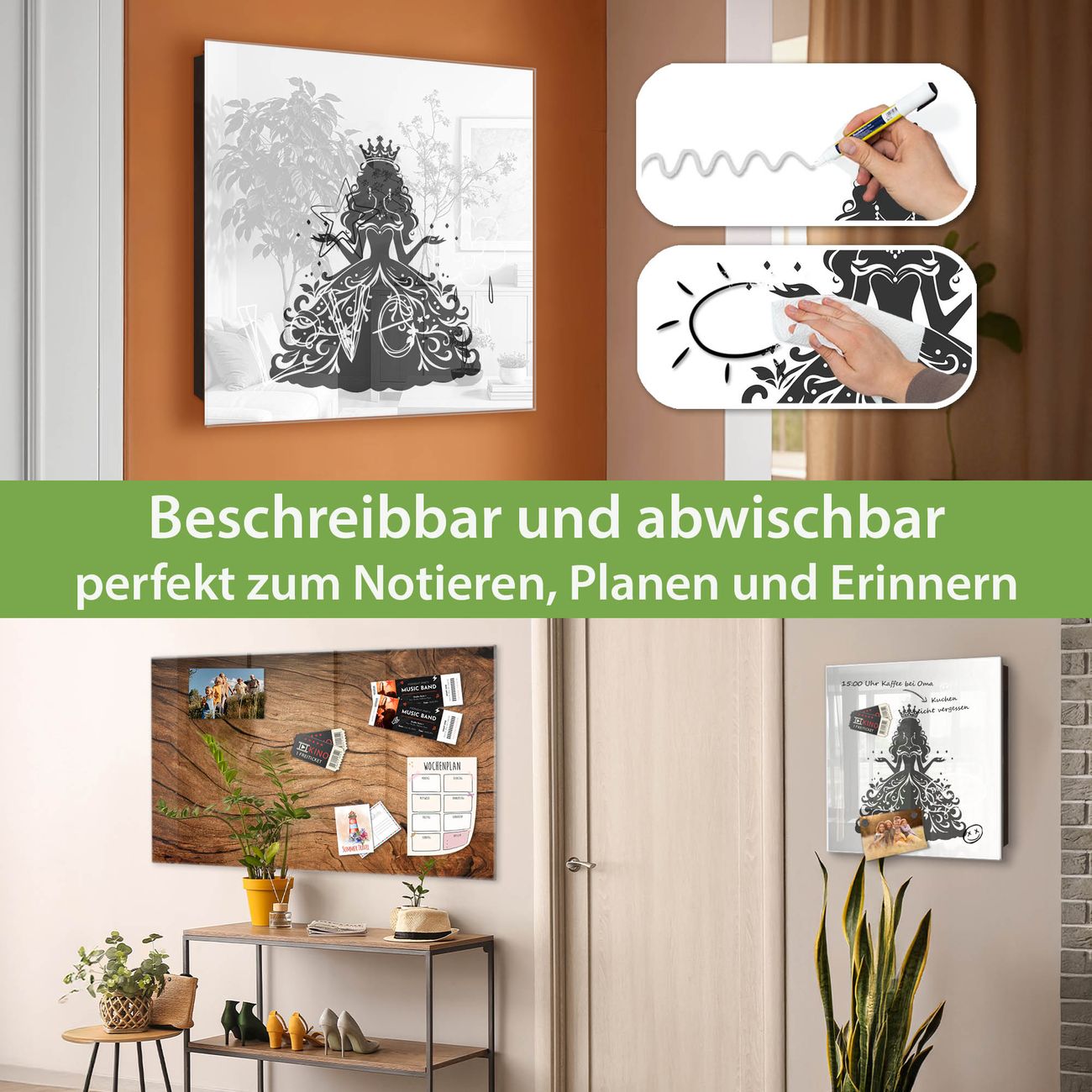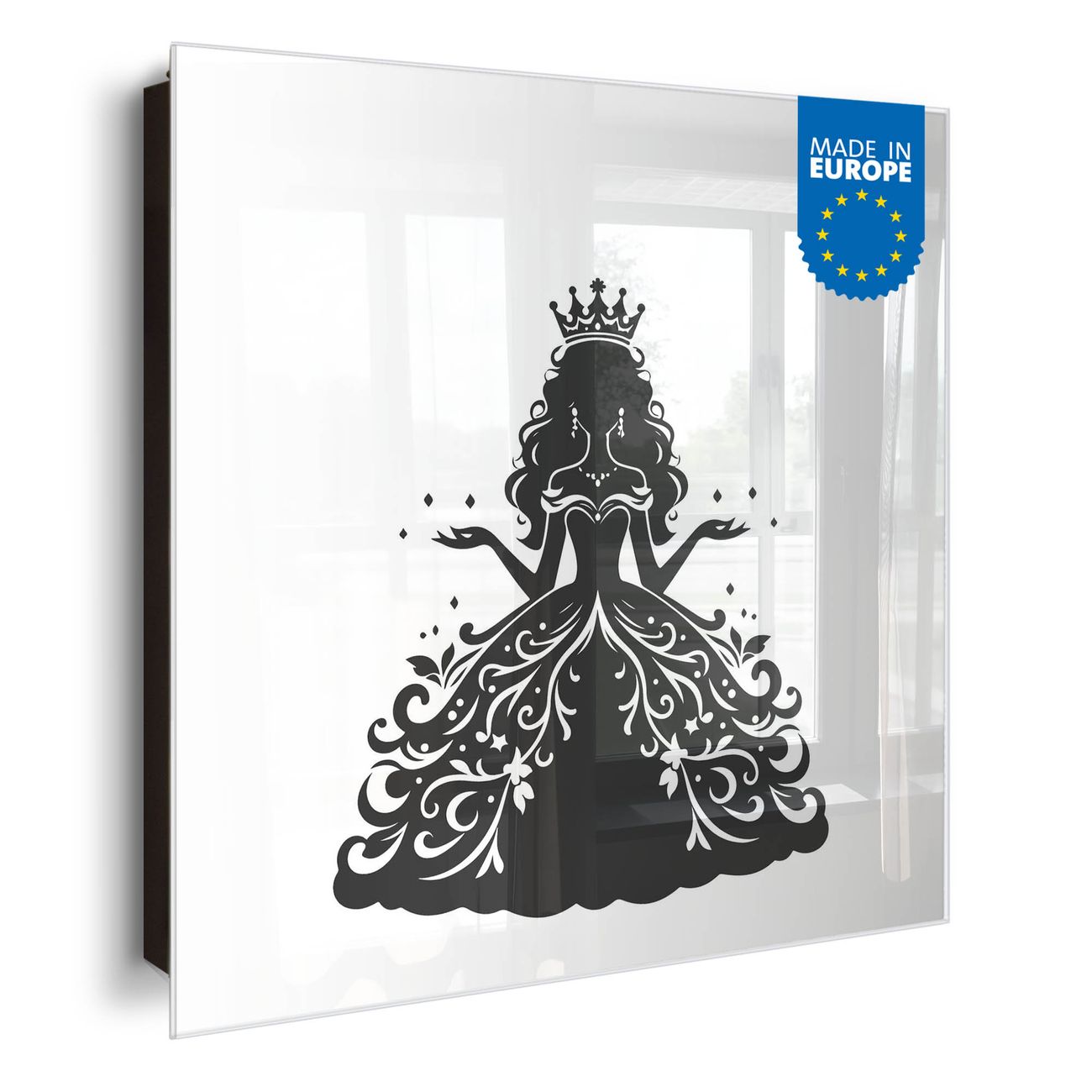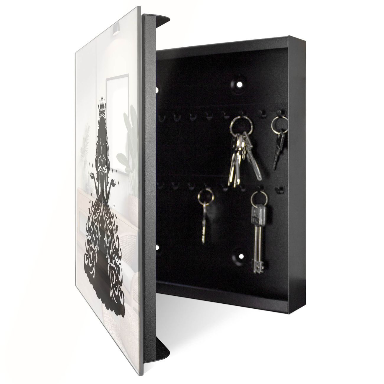 Bringe Ordnung und Eleganz in deinen Eingangsbereich mit dem banjado Schlüsselkasten Motiv Motiv Märchenprinzessin. Die moderne Schlüsselbox kombiniert funktionales Design mit hochwertiger Verarbeitung und wird so zu einem echten Hingucker in Flur, Büro oder Ferienwohnung. ✅ Stilvolle Schlüsselaufbewahrung mit Glasfront im Motiv Motiv Märchenprinzessin Der Design-Schlüsselkasten Motiv Motiv Märchenprinzessin bietet Platz für bis zu 50 Schlüssel, die auf 5 stabilen Reihen mit je 10 Haken übersichtlich verstaut werden. Mit seinen kompakten Maßen von 30 x 30 x 5 cm passt die Schlüsselbox perfekt auch in kleinere Räume. Der schwarz lackierte Stahlkorpus mit rechts angeschlagenem Türscharnier harmoniert mit der Glasfront und fügt sich nahtlos in jedes Wohnambiente ein. Ob als Schlüsselorganizer für Zuhause oder als praktische Lösung für Büros, Praxen und Gewerbe, der banjado Schlüsselkasten sorgt für Ordnung und Übersicht. Dank der magnetischen, mit Kreidestiften beschreibbaren Glasfront kannst du Notizen anheften oder Termine direkt auf der Oberfläche festhalten. Die Schlüsselbox Motiv Motiv Märchenprinzessin zur Wandmontage wird inklusive Befestigungsmaterial geliefert und ist schnell angebracht. So hast du deine Schlüssel jederzeit griffbereit und zugleich stilvoll verstaut. Mit diesem banjado Schlüsselkasten Motiv Motiv Märchenprinzessin kombinierst du praktische Aufbewahrung mit stilvollem Wohndesign. Ob privat oder geschäftlich, die Schlüsselbox sorgt für mehr Ordnung, Übersicht und ein wohnliches Ambiente.Vorteile im Überblick