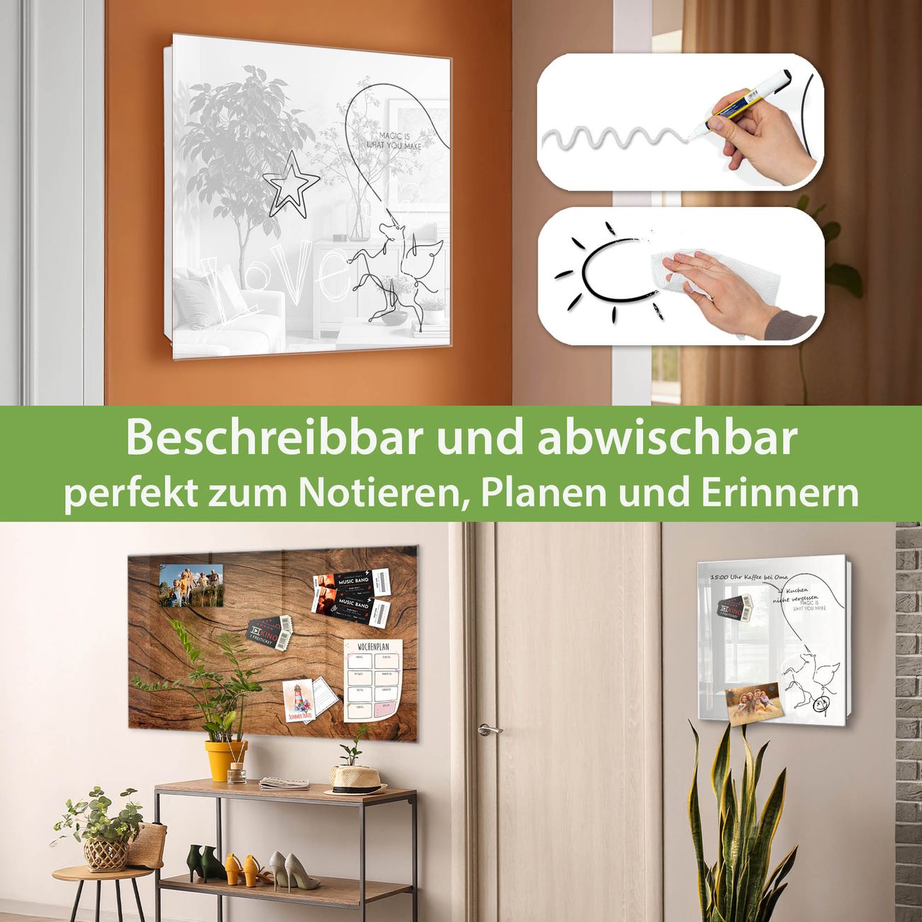 ✅ Magnetisch und mit Kreidestift beschreibbar, gehärtetes Glas, rechts angeschlagene TürOrdnung und Design in einem