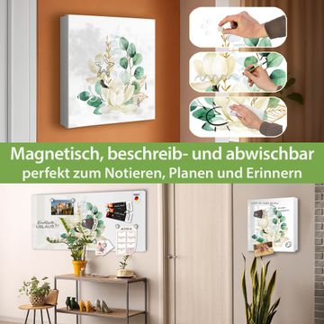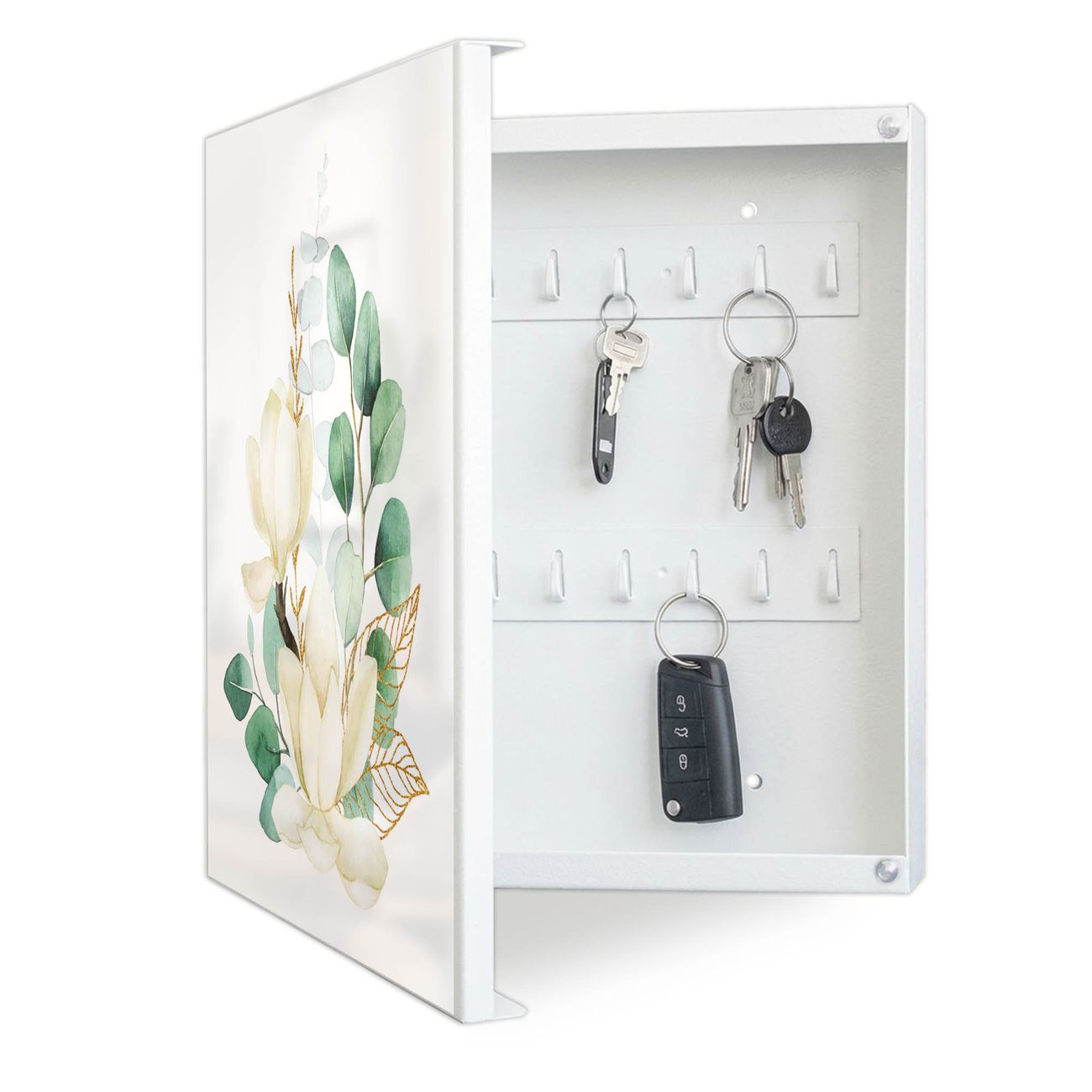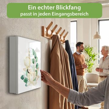 Bringe Ordnung und Eleganz in deinen Eingangsbereich mit dem banjado Schlüsselkasten Motiv Motiv Magnolienkomposition. Die moderne Schlüsselbox kombiniert funktionales Design mit hochwertiger Verarbeitung und wird so zu einem echten Hingucker in Flur, Büro oder Ferienwohnung. ✅ Stilvolle Schlüsselaufbewahrung mit Motiv Motiv Magnolienkomposition Der Design-Schlüsselkasten Motiv Motiv Magnolienkomposition bietet Platz für bis zu 32 Schlüssel, die auf 4 stabilen Reihen mit je 8 Haken übersichtlich verstaut werden. Mit seinen kompakten Maßen von 30 x 30 x 5 cm passt die Schlüsselbox perfekt auch in kleinere Räume. Der weiß lackierte Stahlkorpus mit links angeschlagenem Türscharnier harmoniert mit gedruckten Folie auf der Front und fügt sich nahtlos in jedes Wohnambiente ein. Ob als Schlüsselorganizer für Zuhause oder als praktische Lösung für Büros, Praxen und Gewerbe, der banjado Schlüsselkasten sorgt für Ordnung und Übersicht. Dank der magnetischen, mit Kreidestiften beschreibbaren Folie auf der Front kannst du Notizen anheften oder Termine direkt auf der Oberfläche festhalten. Die Schlüsselbox Motiv Motiv Magnolienkomposition zur Wandmontage wird inklusive Befestigungsmaterial geliefert und ist schnell angebracht. So hast du deine Schlüssel jederzeit griffbereit und zugleich stilvoll verstaut. Mit diesem banjado Schlüsselkasten Motiv Motiv Magnolienkomposition kombinierst du praktische Aufbewahrung mit stilvollem Wohndesign. Ob privat oder geschäftlich, die Schlüsselbox sorgt für mehr Ordnung, Übersicht und ein wohnliches Ambiente.Vorteile im Überblick