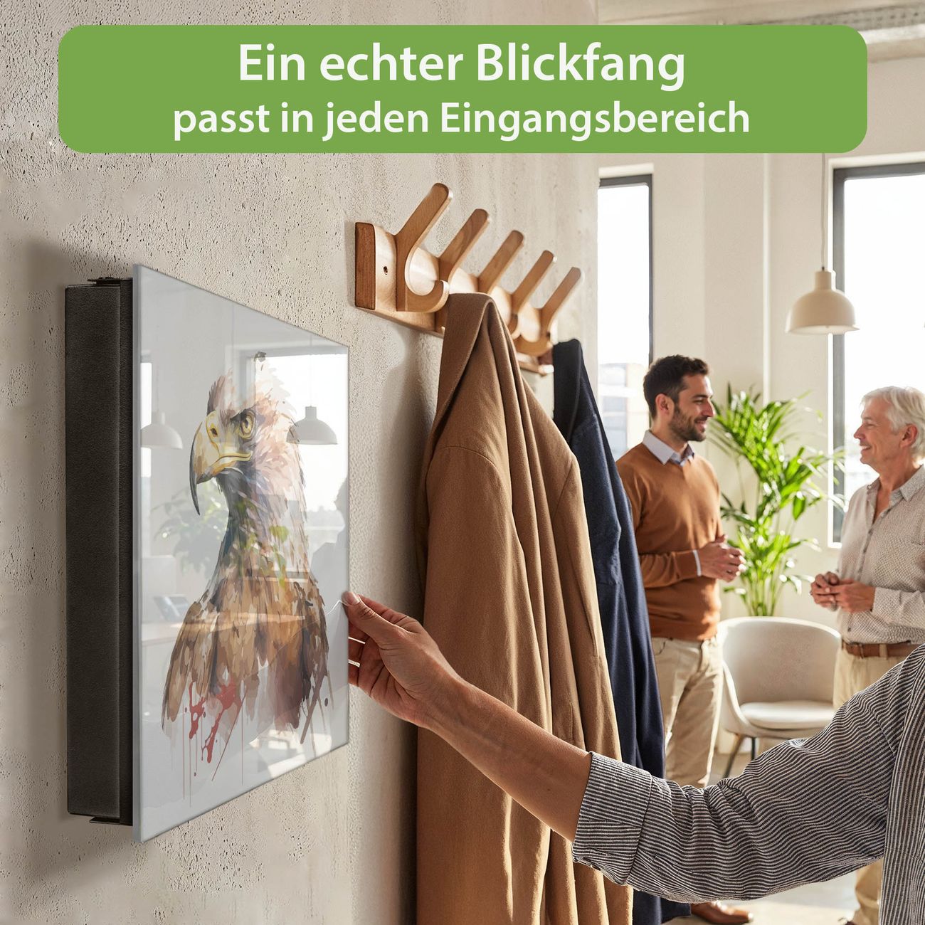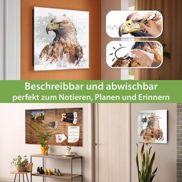 Bringe Ordnung und Eleganz in deinen Eingangsbereich mit dem banjado Schlüsselkasten Motiv Motiv Majestätischer Adler. Die moderne Schlüsselbox kombiniert funktionales Design mit hochwertiger Verarbeitung und wird so zu einem echten Hingucker in Flur, Büro oder Ferienwohnung. ✅ Stilvolle Schlüsselaufbewahrung mit Glasfront im Motiv Motiv Majestätischer Adler Der Design-Schlüsselkasten Motiv Motiv Majestätischer Adler bietet Platz für bis zu 50 Schlüssel, die auf 5 stabilen Reihen mit je 10 Haken übersichtlich verstaut werden. Mit seinen kompakten Maßen von 30 x 30 x 5 cm passt die Schlüsselbox perfekt auch in kleinere Räume. Der schwarz lackierte Stahlkorpus mit rechts angeschlagenem Türscharnier harmoniert mit der Glasfront und fügt sich nahtlos in jedes Wohnambiente ein. Ob als Schlüsselorganizer für Zuhause oder als praktische Lösung für Büros, Praxen und Gewerbe, der banjado Schlüsselkasten sorgt für Ordnung und Übersicht. Dank der magnetischen, mit Kreidestiften beschreibbaren Glasfront kannst du Notizen anheften oder Termine direkt auf der Oberfläche festhalten. Die Schlüsselbox Motiv Motiv Majestätischer Adler zur Wandmontage wird inklusive Befestigungsmaterial geliefert und ist schnell angebracht. So hast du deine Schlüssel jederzeit griffbereit und zugleich stilvoll verstaut. Mit diesem banjado Schlüsselkasten Motiv Motiv Majestätischer Adler kombinierst du praktische Aufbewahrung mit stilvollem Wohndesign. Ob privat oder geschäftlich, die Schlüsselbox sorgt für mehr Ordnung, Übersicht und ein wohnliches Ambiente.Vorteile im Überblick
