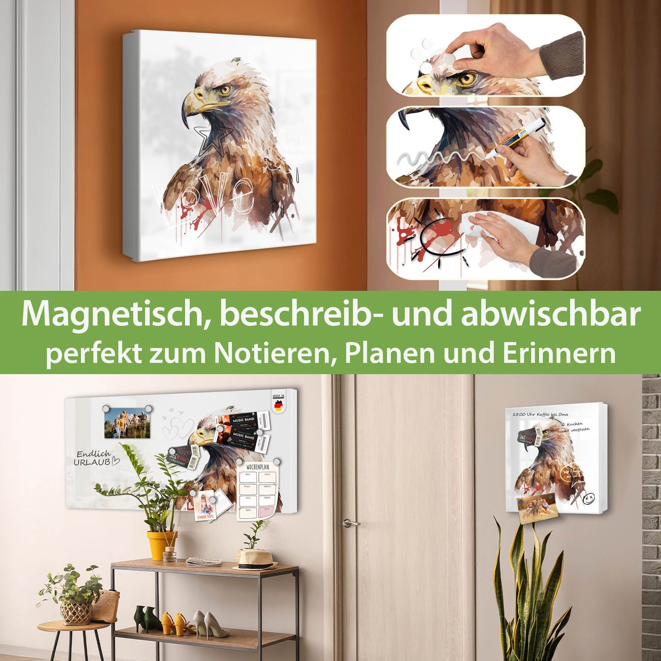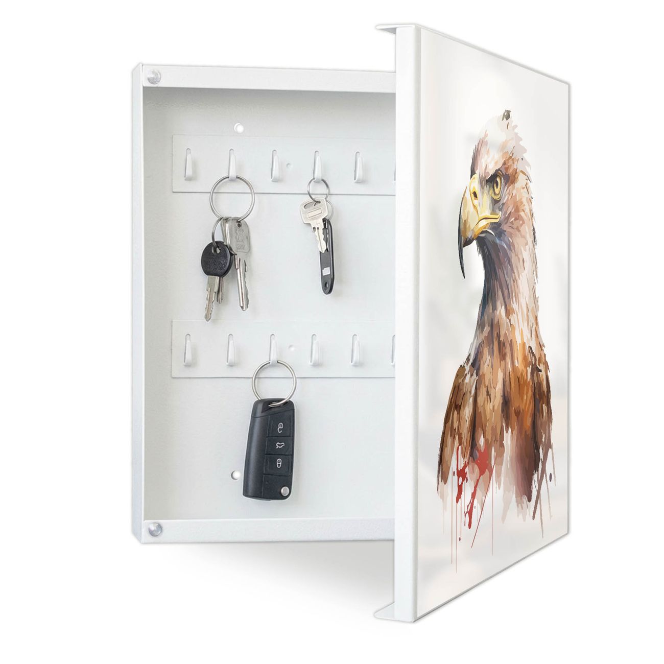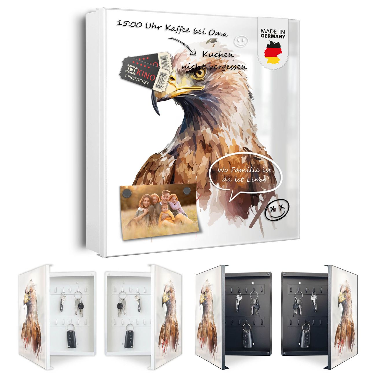 Bringe Ordnung und Eleganz in deinen Eingangsbereich mit dem banjado Schlüsselkasten Motiv Motiv Majestätischer Adler. Die moderne Schlüsselbox kombiniert funktionales Design mit hochwertiger Verarbeitung und wird so zu einem echten Hingucker in Flur, Büro oder Ferienwohnung. ✅ Stilvolle Schlüsselaufbewahrung mit Motiv Motiv Majestätischer Adler Der Design-Schlüsselkasten Motiv Motiv Majestätischer Adler bietet Platz für bis zu 32 Schlüssel, die auf 4 stabilen Reihen mit je 8 Haken übersichtlich verstaut werden. Mit seinen kompakten Maßen von 30 x 30 x 5 cm passt die Schlüsselbox perfekt auch in kleinere Räume. Der weiß lackierte Stahlkorpus mit rechts angeschlagenem Türscharnier harmoniert mit gedruckten Folie auf der Front und fügt sich nahtlos in jedes Wohnambiente ein. Ob als Schlüsselorganizer für Zuhause oder als praktische Lösung für Büros, Praxen und Gewerbe, der banjado Schlüsselkasten sorgt für Ordnung und Übersicht. Dank der magnetischen, mit Kreidestiften beschreibbaren Folie auf der Front kannst du Notizen anheften oder Termine direkt auf der Oberfläche festhalten. Die Schlüsselbox Motiv Motiv Majestätischer Adler zur Wandmontage wird inklusive Befestigungsmaterial geliefert und ist schnell angebracht. So hast du deine Schlüssel jederzeit griffbereit und zugleich stilvoll verstaut. Mit diesem banjado Schlüsselkasten Motiv Motiv Majestätischer Adler kombinierst du praktische Aufbewahrung mit stilvollem Wohndesign. Ob privat oder geschäftlich, die Schlüsselbox sorgt für mehr Ordnung, Übersicht und ein wohnliches Ambiente.Vorteile im Überblick