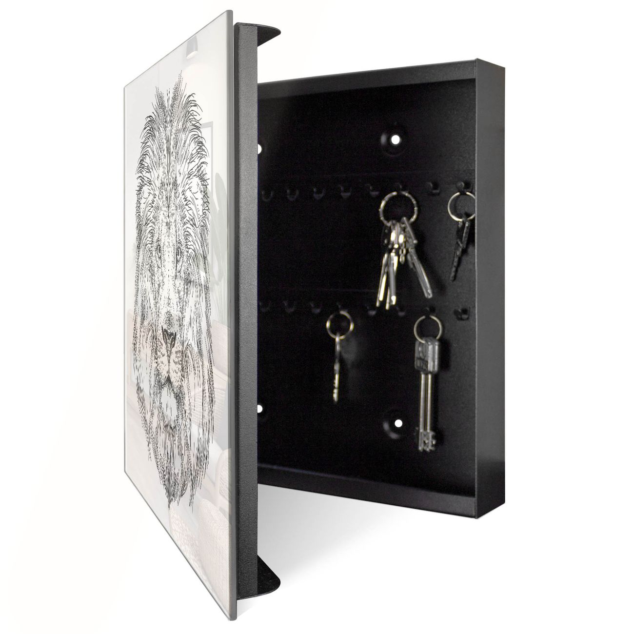 Bringe Ordnung und Eleganz in deinen Eingangsbereich mit dem banjado Schlüsselkasten Motiv Motiv Majestätischer Löwe. Die moderne Schlüsselbox kombiniert funktionales Design mit hochwertiger Verarbeitung und wird so zu einem echten Hingucker in Flur, Büro oder Ferienwohnung. ✅ Stilvolle Schlüsselaufbewahrung mit Glasfront im Motiv Motiv Majestätischer Löwe Der Design-Schlüsselkasten Motiv Motiv Majestätischer Löwe bietet Platz für bis zu 50 Schlüssel, die auf 5 stabilen Reihen mit je 10 Haken übersichtlich verstaut werden. Mit seinen kompakten Maßen von 30 x 30 x 5 cm passt die Schlüsselbox perfekt auch in kleinere Räume. Der schwarz lackierte Stahlkorpus mit rechts angeschlagenem Türscharnier harmoniert mit der Glasfront und fügt sich nahtlos in jedes Wohnambiente ein. Ob als Schlüsselorganizer für Zuhause oder als praktische Lösung für Büros, Praxen und Gewerbe, der banjado Schlüsselkasten sorgt für Ordnung und Übersicht. Dank der magnetischen, mit Kreidestiften beschreibbaren Glasfront kannst du Notizen anheften oder Termine direkt auf der Oberfläche festhalten. Die Schlüsselbox Motiv Motiv Majestätischer Löwe zur Wandmontage wird inklusive Befestigungsmaterial geliefert und ist schnell angebracht. So hast du deine Schlüssel jederzeit griffbereit und zugleich stilvoll verstaut. Mit diesem banjado Schlüsselkasten Motiv Motiv Majestätischer Löwe kombinierst du praktische Aufbewahrung mit stilvollem Wohndesign. Ob privat oder geschäftlich, die Schlüsselbox sorgt für mehr Ordnung, Übersicht und ein wohnliches Ambiente.Vorteile im Überblick