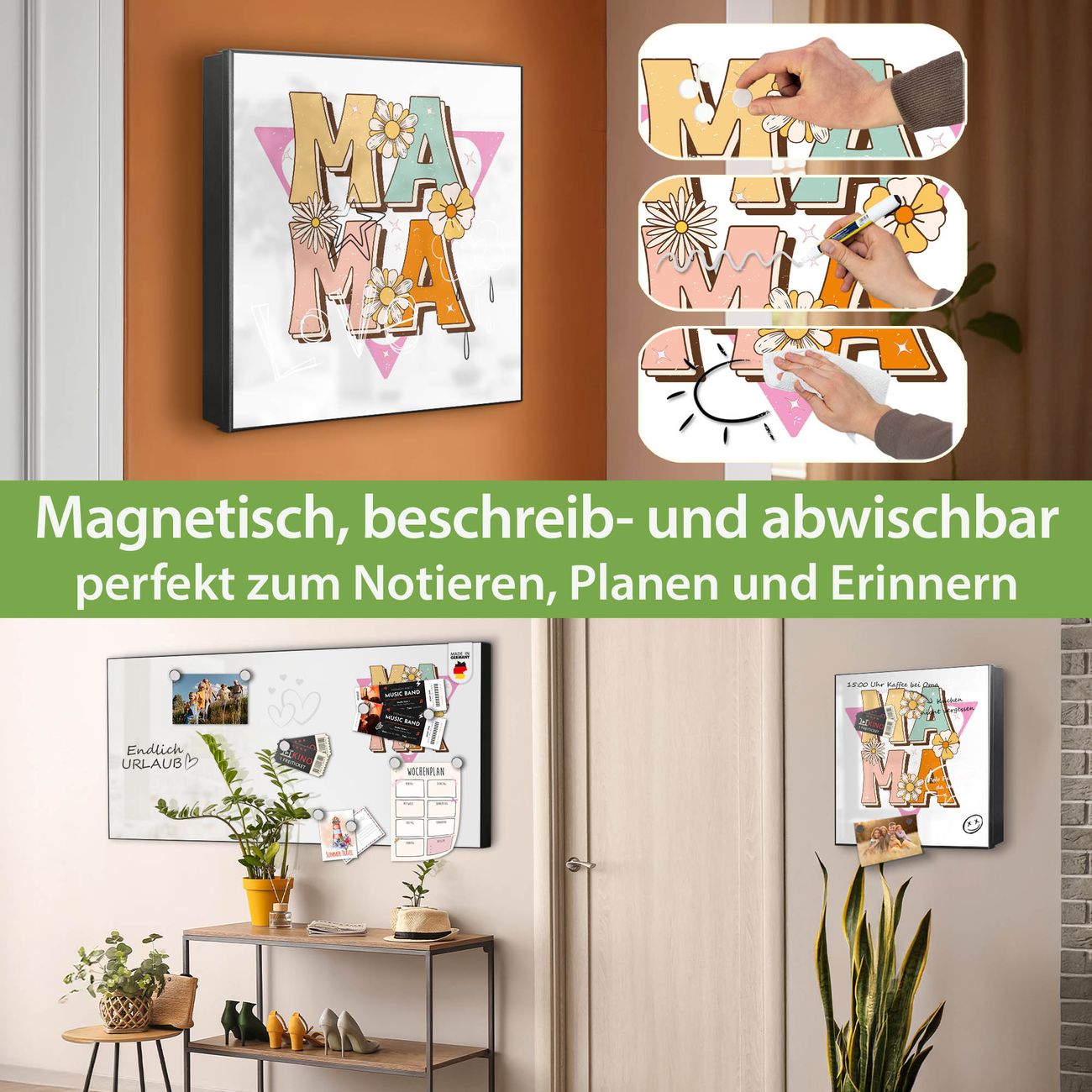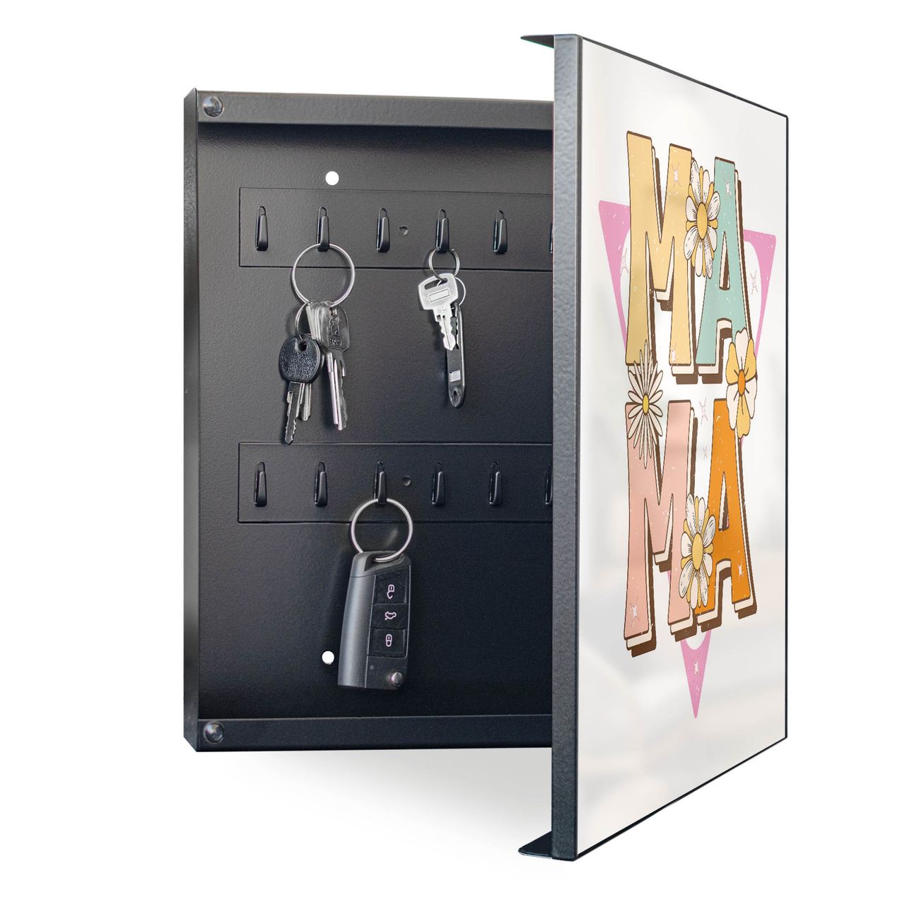 Bringe Ordnung und Eleganz in deinen Eingangsbereich mit dem banjado Schlüsselkasten Motiv Motiv Mama Liebe Retro. Die moderne Schlüsselbox kombiniert funktionales Design mit hochwertiger Verarbeitung und wird so zu einem echten Hingucker in Flur, Büro oder Ferienwohnung. ✅ Stilvolle Schlüsselaufbewahrung mit Motiv Motiv Mama Liebe Retro Der Design-Schlüsselkasten Motiv Motiv Mama Liebe Retro bietet Platz für bis zu 32 Schlüssel, die auf 4 stabilen Reihen mit je 8 Haken übersichtlich verstaut werden. Mit seinen kompakten Maßen von 30 x 30 x 5 cm passt die Schlüsselbox perfekt auch in kleinere Räume. Der schwarz lackierte Stahlkorpus mit rechts angeschlagenem Türscharnier harmoniert mit gedruckten Folie auf der Front und fügt sich nahtlos in jedes Wohnambiente ein. Ob als Schlüsselorganizer für Zuhause oder als praktische Lösung für Büros, Praxen und Gewerbe, der banjado Schlüsselkasten sorgt für Ordnung und Übersicht. Dank der magnetischen, mit Kreidestiften beschreibbaren Folie auf der Front kannst du Notizen anheften oder Termine direkt auf der Oberfläche festhalten. Die Schlüsselbox Motiv Motiv Mama Liebe Retro zur Wandmontage wird inklusive Befestigungsmaterial geliefert und ist schnell angebracht. So hast du deine Schlüssel jederzeit griffbereit und zugleich stilvoll verstaut. Mit diesem banjado Schlüsselkasten Motiv Motiv Mama Liebe Retro kombinierst du praktische Aufbewahrung mit stilvollem Wohndesign. Ob privat oder geschäftlich, die Schlüsselbox sorgt für mehr Ordnung, Übersicht und ein wohnliches Ambiente.Vorteile im Überblick