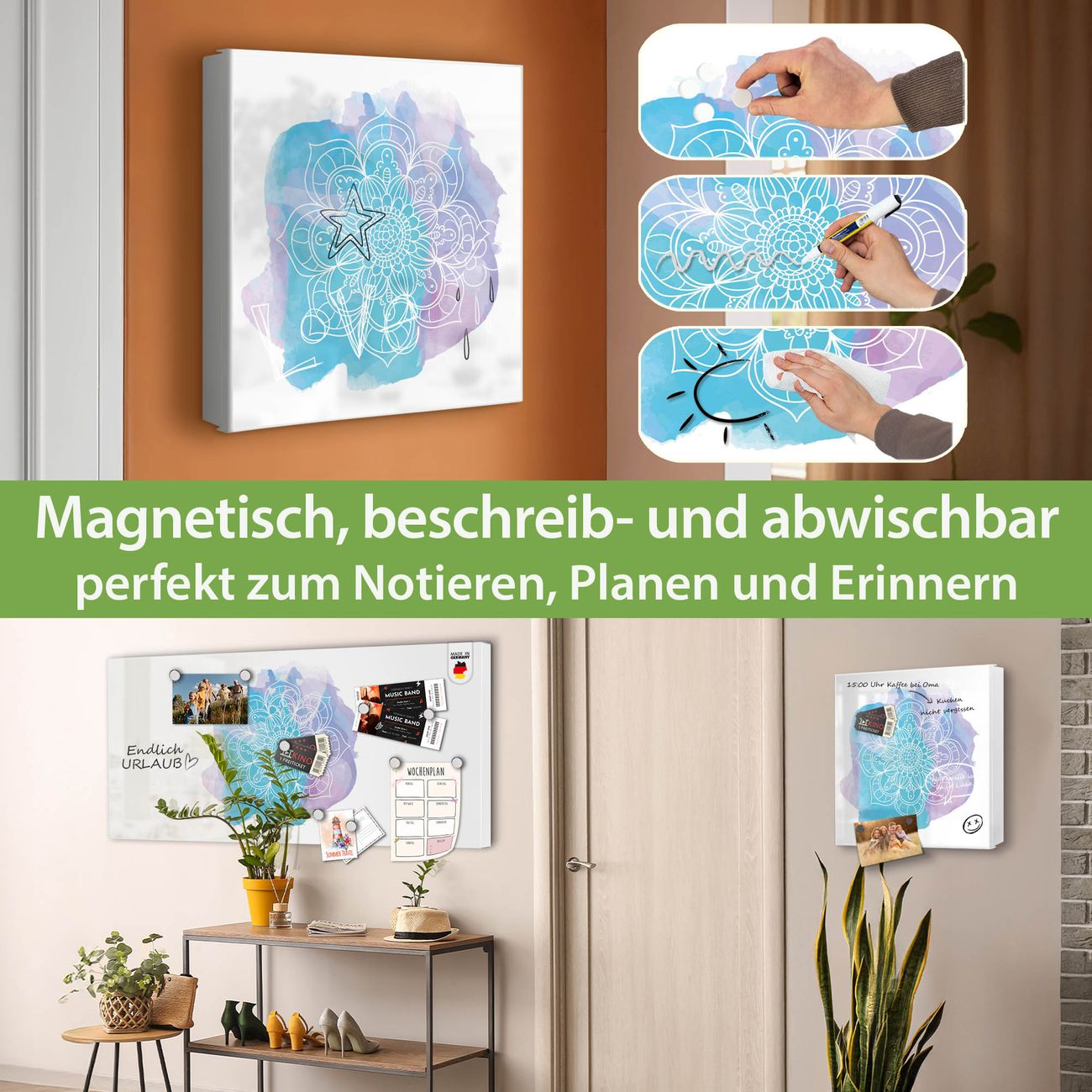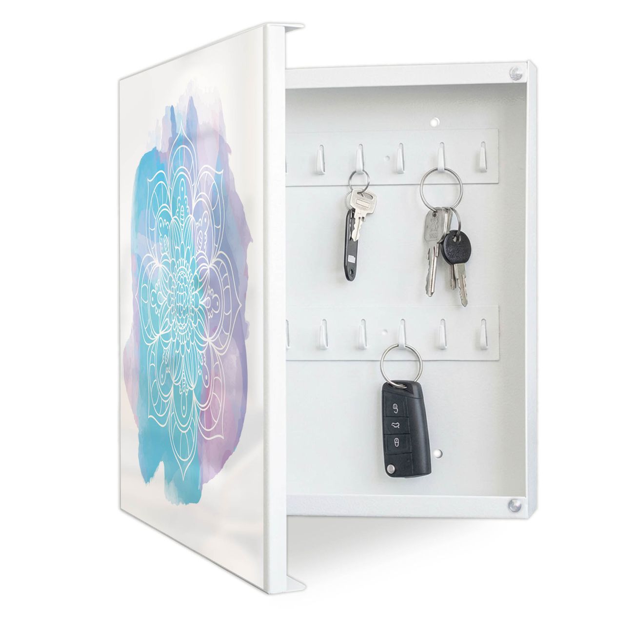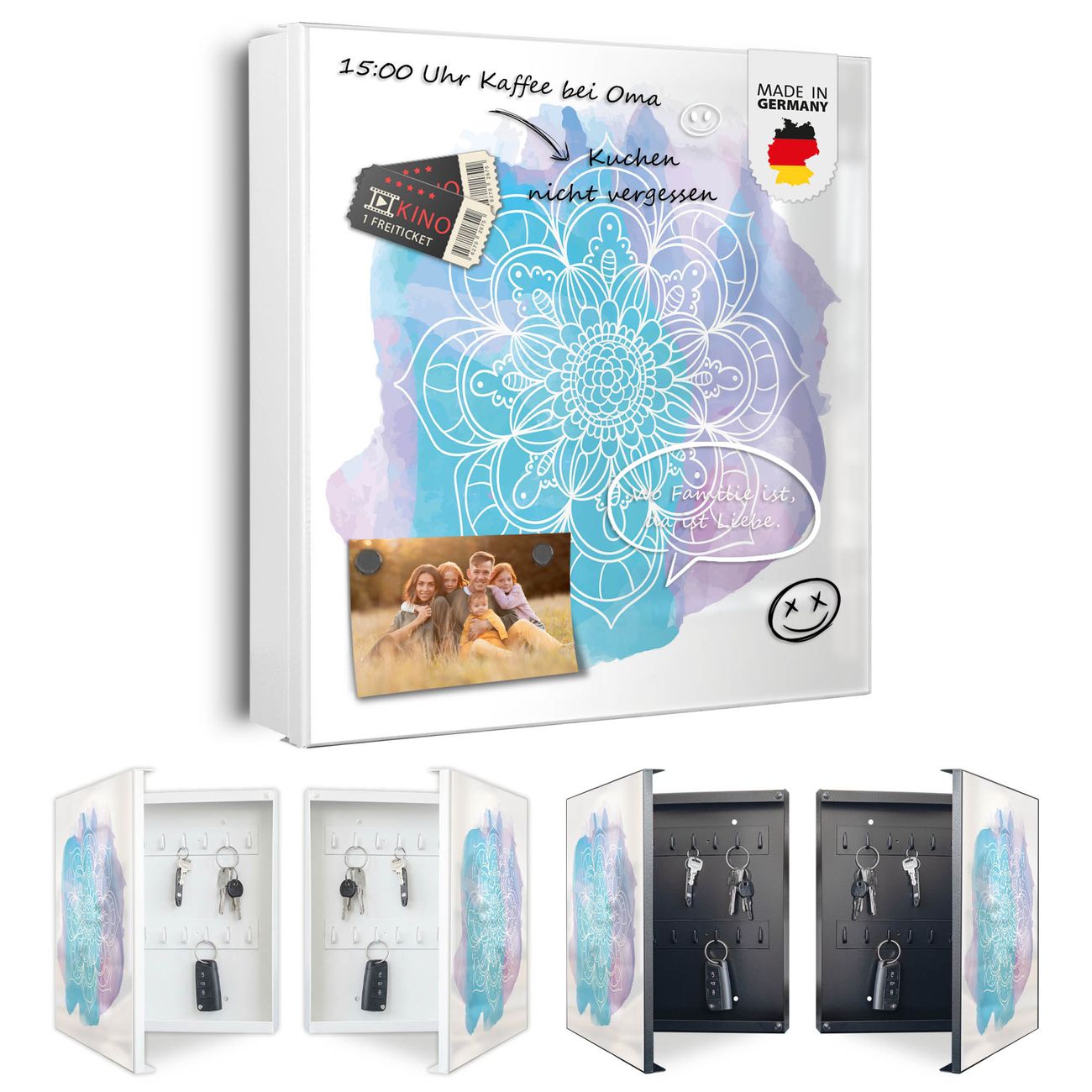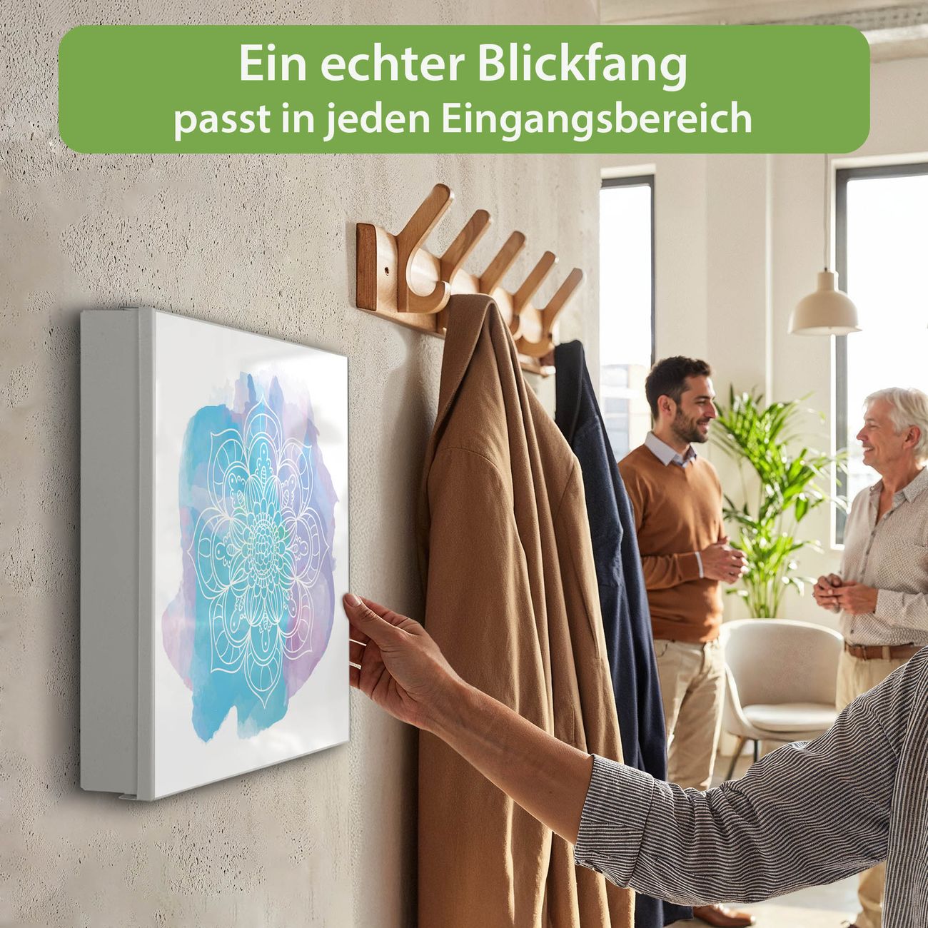 Bringe Ordnung und Eleganz in deinen Eingangsbereich mit dem banjado Schlüsselkasten Motiv Motiv Mandala Tranquility. Die moderne Schlüsselbox kombiniert funktionales Design mit hochwertiger Verarbeitung und wird so zu einem echten Hingucker in Flur, Büro oder Ferienwohnung. ✅ Stilvolle Schlüsselaufbewahrung mit Motiv Motiv Mandala Tranquility Der Design-Schlüsselkasten Motiv Motiv Mandala Tranquility bietet Platz für bis zu 32 Schlüssel, die auf 4 stabilen Reihen mit je 8 Haken übersichtlich verstaut werden. Mit seinen kompakten Maßen von 30 x 30 x 5 cm passt die Schlüsselbox perfekt auch in kleinere Räume. Der weiß lackierte Stahlkorpus mit links angeschlagenem Türscharnier harmoniert mit gedruckten Folie auf der Front und fügt sich nahtlos in jedes Wohnambiente ein. Ob als Schlüsselorganizer für Zuhause oder als praktische Lösung für Büros, Praxen und Gewerbe, der banjado Schlüsselkasten sorgt für Ordnung und Übersicht. Dank der magnetischen, mit Kreidestiften beschreibbaren Folie auf der Front kannst du Notizen anheften oder Termine direkt auf der Oberfläche festhalten. Die Schlüsselbox Motiv Motiv Mandala Tranquility zur Wandmontage wird inklusive Befestigungsmaterial geliefert und ist schnell angebracht. So hast du deine Schlüssel jederzeit griffbereit und zugleich stilvoll verstaut. Mit diesem banjado Schlüsselkasten Motiv Motiv Mandala Tranquility kombinierst du praktische Aufbewahrung mit stilvollem Wohndesign. Ob privat oder geschäftlich, die Schlüsselbox sorgt für mehr Ordnung, Übersicht und ein wohnliches Ambiente.Vorteile im Überblick