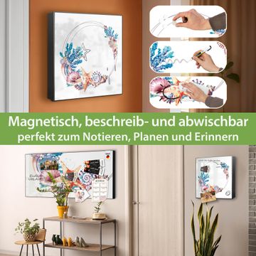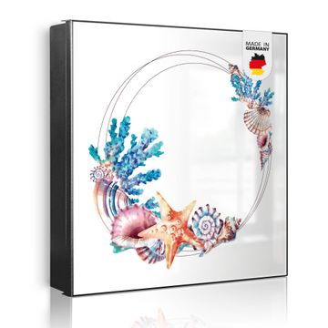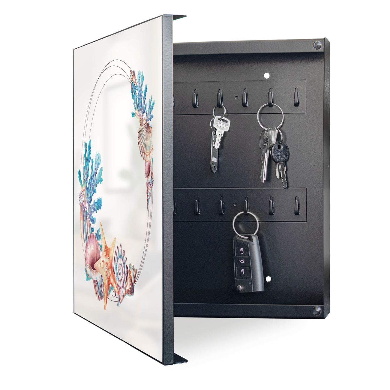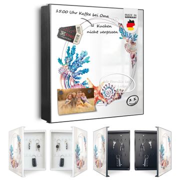 Bringe Ordnung und Eleganz in deinen Eingangsbereich mit dem banjado Schlüsselkasten Motiv Motiv Maritime Eleganz. Die moderne Schlüsselbox kombiniert funktionales Design mit hochwertiger Verarbeitung und wird so zu einem echten Hingucker in Flur, Büro oder Ferienwohnung. ✅ Stilvolle Schlüsselaufbewahrung mit Motiv Motiv Maritime Eleganz Der Design-Schlüsselkasten Motiv Motiv Maritime Eleganz bietet Platz für bis zu 32 Schlüssel, die auf 4 stabilen Reihen mit je 8 Haken übersichtlich verstaut werden. Mit seinen kompakten Maßen von 30 x 30 x 5 cm passt die Schlüsselbox perfekt auch in kleinere Räume. Der schwarz lackierte Stahlkorpus mit links angeschlagenem Türscharnier harmoniert mit gedruckten Folie auf der Front und fügt sich nahtlos in jedes Wohnambiente ein. Ob als Schlüsselorganizer für Zuhause oder als praktische Lösung für Büros, Praxen und Gewerbe, der banjado Schlüsselkasten sorgt für Ordnung und Übersicht. Dank der magnetischen, mit Kreidestiften beschreibbaren Folie auf der Front kannst du Notizen anheften oder Termine direkt auf der Oberfläche festhalten. Die Schlüsselbox Motiv Motiv Maritime Eleganz zur Wandmontage wird inklusive Befestigungsmaterial geliefert und ist schnell angebracht. So hast du deine Schlüssel jederzeit griffbereit und zugleich stilvoll verstaut. Mit diesem banjado Schlüsselkasten Motiv Motiv Maritime Eleganz kombinierst du praktische Aufbewahrung mit stilvollem Wohndesign. Ob privat oder geschäftlich, die Schlüsselbox sorgt für mehr Ordnung, Übersicht und ein wohnliches Ambiente.Vorteile im Überblick