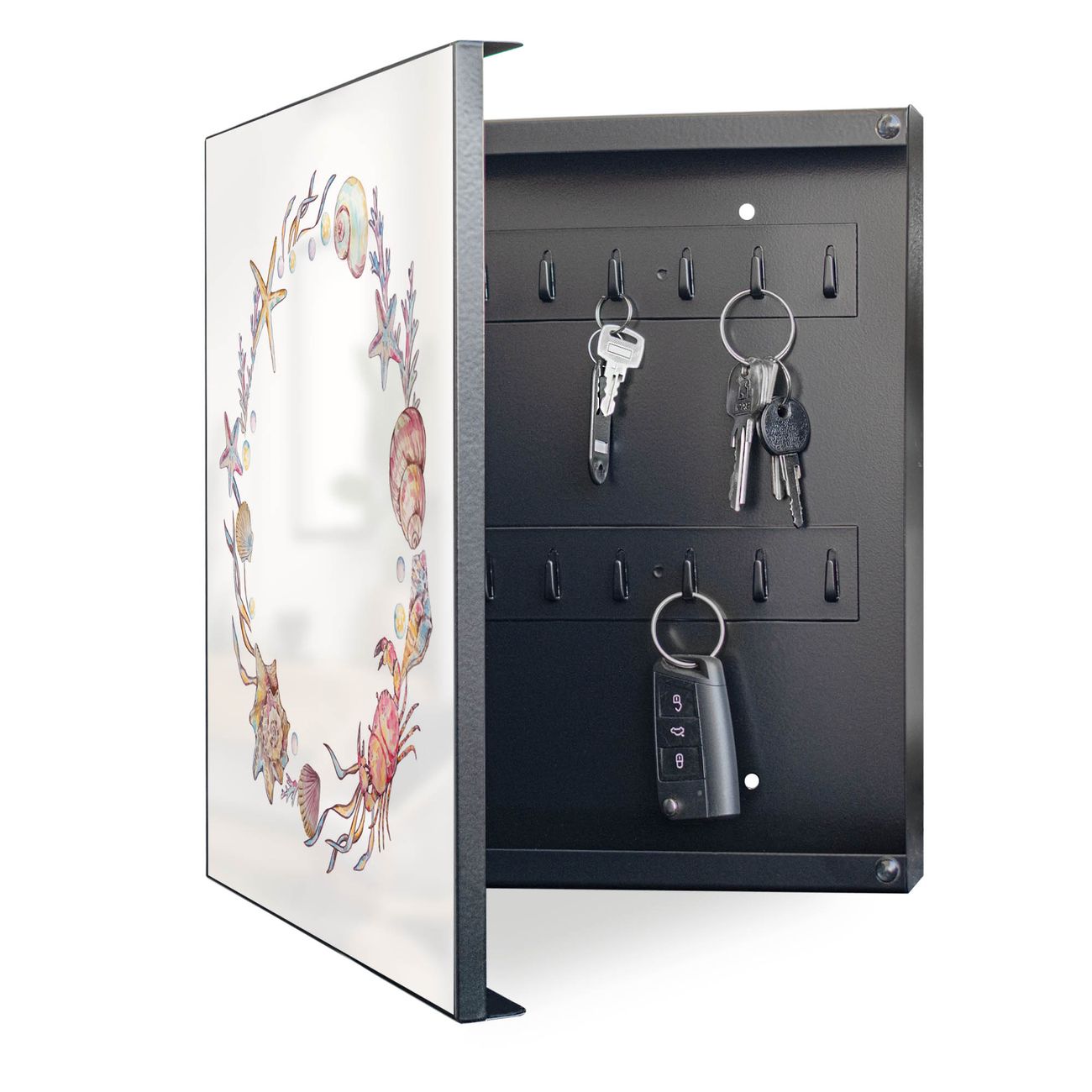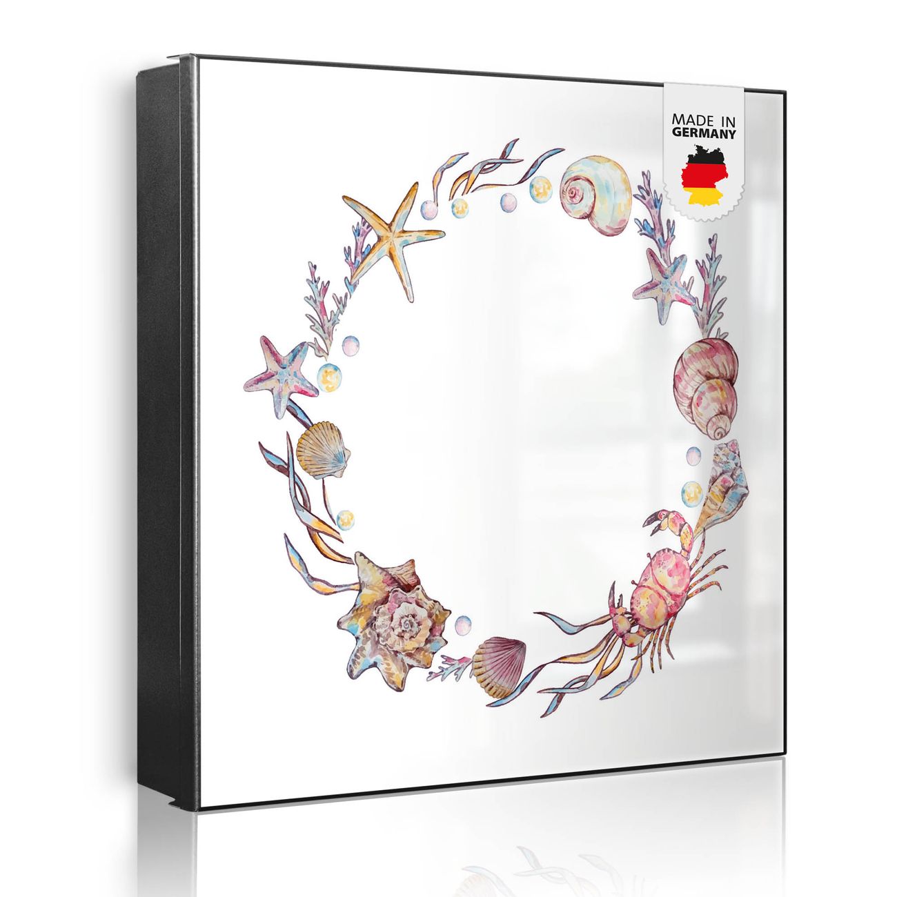 Bringe Ordnung und Eleganz in deinen Eingangsbereich mit dem banjado Schlüsselkasten Motiv Motiv Maritimer Kranz. Die moderne Schlüsselbox kombiniert funktionales Design mit hochwertiger Verarbeitung und wird so zu einem echten Hingucker in Flur, Büro oder Ferienwohnung. ✅ Stilvolle Schlüsselaufbewahrung mit Motiv Motiv Maritimer Kranz Der Design-Schlüsselkasten Motiv Motiv Maritimer Kranz bietet Platz für bis zu 32 Schlüssel, die auf 4 stabilen Reihen mit je 8 Haken übersichtlich verstaut werden. Mit seinen kompakten Maßen von 30 x 30 x 5 cm passt die Schlüsselbox perfekt auch in kleinere Räume. Der schwarz lackierte Stahlkorpus mit links angeschlagenem Türscharnier harmoniert mit gedruckten Folie auf der Front und fügt sich nahtlos in jedes Wohnambiente ein. Ob als Schlüsselorganizer für Zuhause oder als praktische Lösung für Büros, Praxen und Gewerbe, der banjado Schlüsselkasten sorgt für Ordnung und Übersicht. Dank der magnetischen, mit Kreidestiften beschreibbaren Folie auf der Front kannst du Notizen anheften oder Termine direkt auf der Oberfläche festhalten. Die Schlüsselbox Motiv Motiv Maritimer Kranz zur Wandmontage wird inklusive Befestigungsmaterial geliefert und ist schnell angebracht. So hast du deine Schlüssel jederzeit griffbereit und zugleich stilvoll verstaut. Mit diesem banjado Schlüsselkasten Motiv Motiv Maritimer Kranz kombinierst du praktische Aufbewahrung mit stilvollem Wohndesign. Ob privat oder geschäftlich, die Schlüsselbox sorgt für mehr Ordnung, Übersicht und ein wohnliches Ambiente.Vorteile im Überblick