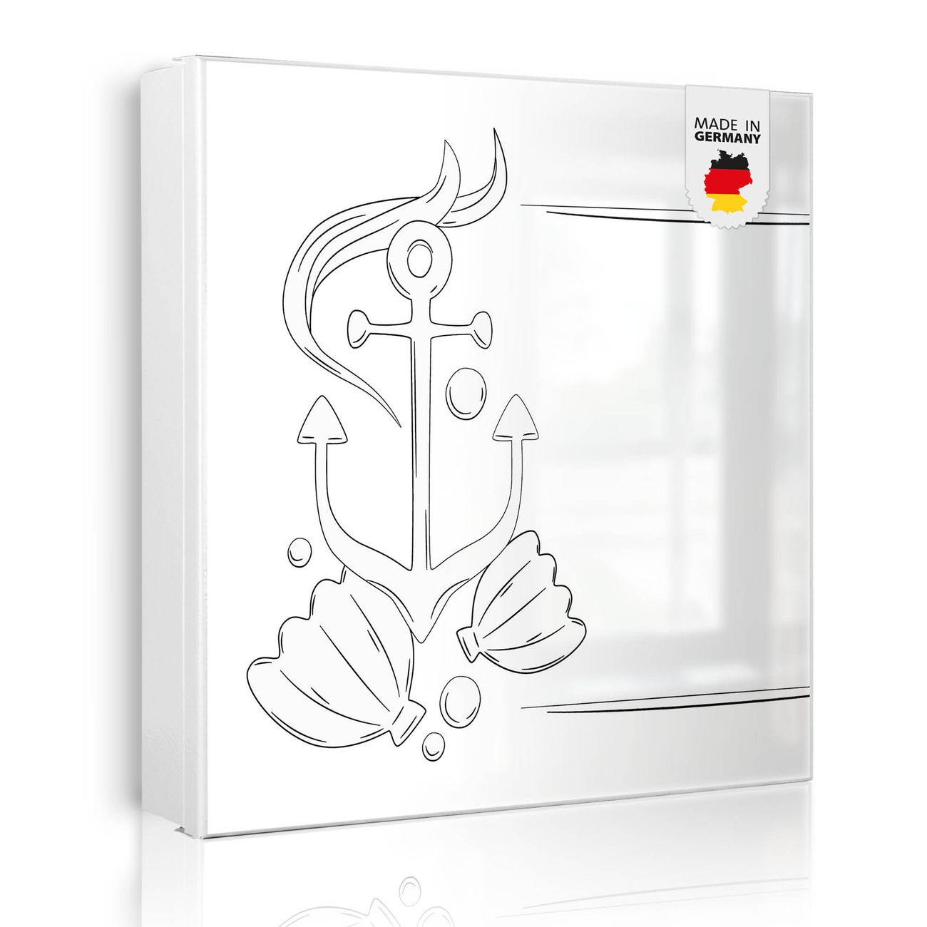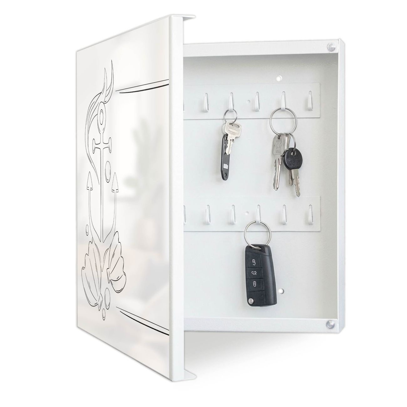 Bringe Ordnung und Eleganz in deinen Eingangsbereich mit dem banjado Schlüsselkasten Motiv Motiv Maritimer Anker. Die moderne Schlüsselbox kombiniert funktionales Design mit hochwertiger Verarbeitung und wird so zu einem echten Hingucker in Flur, Büro oder Ferienwohnung. ✅ Stilvolle Schlüsselaufbewahrung mit Motiv Motiv Maritimer Anker Der Design-Schlüsselkasten Motiv Motiv Maritimer Anker bietet Platz für bis zu 32 Schlüssel, die auf 4 stabilen Reihen mit je 8 Haken übersichtlich verstaut werden. Mit seinen kompakten Maßen von 30 x 30 x 5 cm passt die Schlüsselbox perfekt auch in kleinere Räume. Der weiß lackierte Stahlkorpus mit links angeschlagenem Türscharnier harmoniert mit gedruckten Folie auf der Front und fügt sich nahtlos in jedes Wohnambiente ein. Ob als Schlüsselorganizer für Zuhause oder als praktische Lösung für Büros, Praxen und Gewerbe, der banjado Schlüsselkasten sorgt für Ordnung und Übersicht. Dank der magnetischen, mit Kreidestiften beschreibbaren Folie auf der Front kannst du Notizen anheften oder Termine direkt auf der Oberfläche festhalten. Die Schlüsselbox Motiv Motiv Maritimer Anker zur Wandmontage wird inklusive Befestigungsmaterial geliefert und ist schnell angebracht. So hast du deine Schlüssel jederzeit griffbereit und zugleich stilvoll verstaut. Mit diesem banjado Schlüsselkasten Motiv Motiv Maritimer Anker kombinierst du praktische Aufbewahrung mit stilvollem Wohndesign. Ob privat oder geschäftlich, die Schlüsselbox sorgt für mehr Ordnung, Übersicht und ein wohnliches Ambiente.Vorteile im Überblick