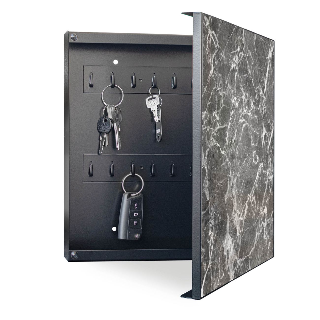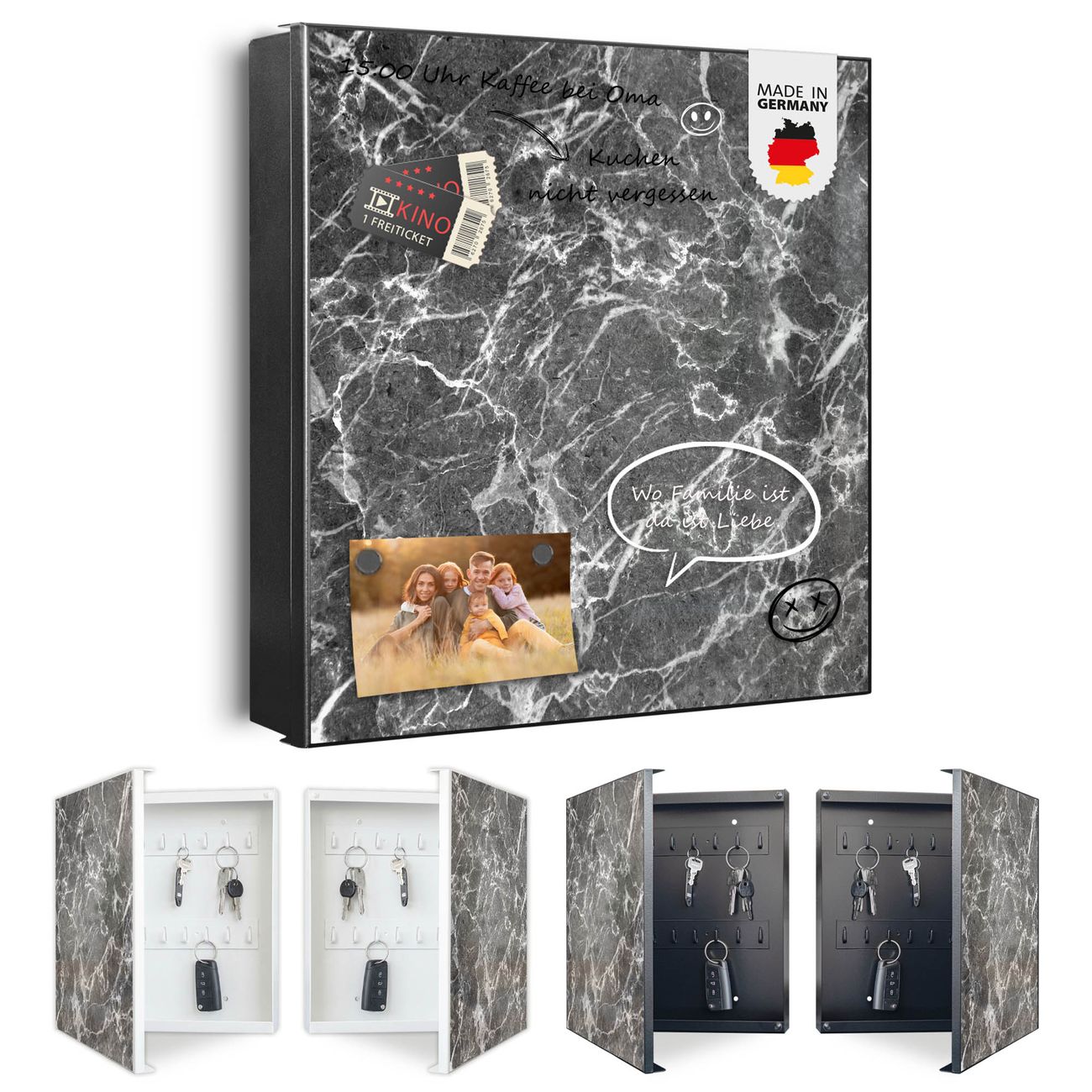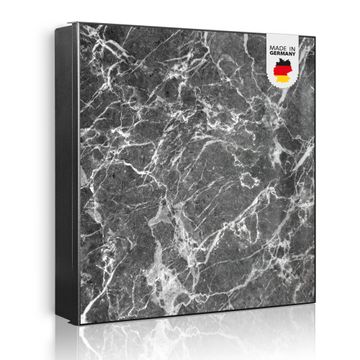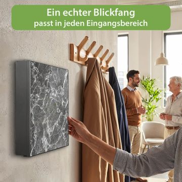 Bringe Ordnung und Eleganz in deinen Eingangsbereich mit dem banjado Schlüsselkasten Motiv Motiv Marmorstein. Die moderne Schlüsselbox kombiniert funktionales Design mit hochwertiger Verarbeitung und wird so zu einem echten Hingucker in Flur, Büro oder Ferienwohnung. ✅ Stilvolle Schlüsselaufbewahrung mit Motiv Motiv Marmorstein Der Design-Schlüsselkasten Motiv Motiv Marmorstein bietet Platz für bis zu 32 Schlüssel, die auf 4 stabilen Reihen mit je 8 Haken übersichtlich verstaut werden. Mit seinen kompakten Maßen von 30 x 30 x 5 cm passt die Schlüsselbox perfekt auch in kleinere Räume. Der schwarz lackierte Stahlkorpus mit rechts angeschlagenem Türscharnier harmoniert mit gedruckten Folie auf der Front und fügt sich nahtlos in jedes Wohnambiente ein. Ob als Schlüsselorganizer für Zuhause oder als praktische Lösung für Büros, Praxen und Gewerbe, der banjado Schlüsselkasten sorgt für Ordnung und Übersicht. Dank der magnetischen, mit Kreidestiften beschreibbaren Folie auf der Front kannst du Notizen anheften oder Termine direkt auf der Oberfläche festhalten. Die Schlüsselbox Motiv Motiv Marmorstein zur Wandmontage wird inklusive Befestigungsmaterial geliefert und ist schnell angebracht. So hast du deine Schlüssel jederzeit griffbereit und zugleich stilvoll verstaut. Mit diesem banjado Schlüsselkasten Motiv Motiv Marmorstein kombinierst du praktische Aufbewahrung mit stilvollem Wohndesign. Ob privat oder geschäftlich, die Schlüsselbox sorgt für mehr Ordnung, Übersicht und ein wohnliches Ambiente.Vorteile im Überblick