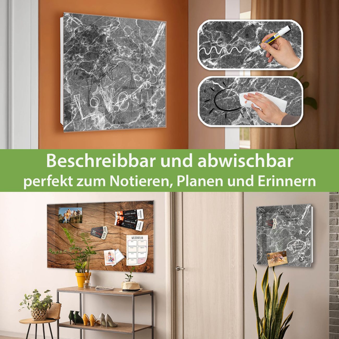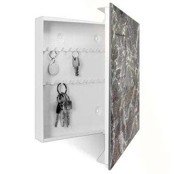 Bringe Ordnung und Eleganz in deinen Eingangsbereich mit dem banjado Schlüsselkasten Motiv Marmorstein. Die moderne Schlüsselbox kombiniert funktionales Design mit hochwertiger Verarbeitung und wird so zu einem echten Hingucker in Flur, Büro oder Ferienwohnung. ✅ Stilvolle Schlüsselaufbewahrung mit Glasfront im Motiv Motiv Marmorstein Der Design-Schlüsselkasten Motiv Marmorstein bietet Platz für bis zu 50 Schlüssel, die auf 5 stabilen Reihen mit je 10 Haken übersichtlich verstaut werden. Mit seinen kompakten Maßen von 30 x 30 x 5 cm passt die Schlüsselbox perfekt auch in kleinere Räume. Der weiß lackierte Stahlkorpus mit rechts angeschlagenem Türscharnier harmoniert mit der Glasfront und fügt sich nahtlos in jedes Wohnambiente ein. Ob als Schlüsselorganizer für Zuhause oder als praktische Lösung für Büros, Praxen und Gewerbe, der banjado Schlüsselkasten sorgt für Ordnung und Übersicht. Dank der magnetischen, mit Kreidestiften beschreibbaren Glasfront kannst du Notizen anheften oder Termine direkt auf der Oberfläche festhalten. Die Schlüsselbox Motiv Marmorstein zur Wandmontage wird inklusive Befestigungsmaterial geliefert und ist schnell angebracht. So hast du deine Schlüssel jederzeit griffbereit und zugleich stilvoll verstaut. Mit diesem banjado Schlüsselkasten Motiv Marmorstein kombinierst du praktische Aufbewahrung mit stilvollem Wohndesign. Ob privat oder geschäftlich, die Schlüsselbox sorgt für mehr Ordnung, Übersicht und ein wohnliches Ambiente.Vorteile im Überblick