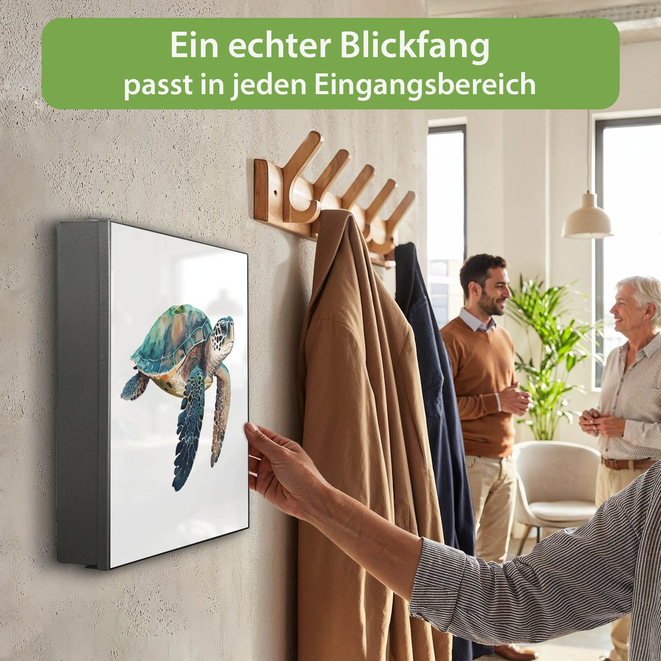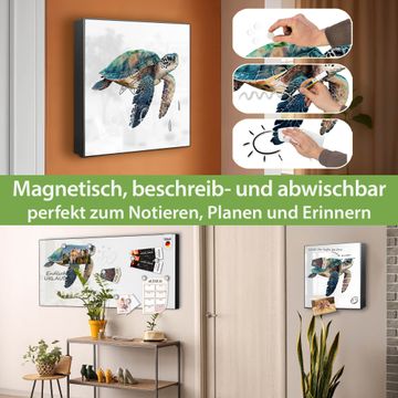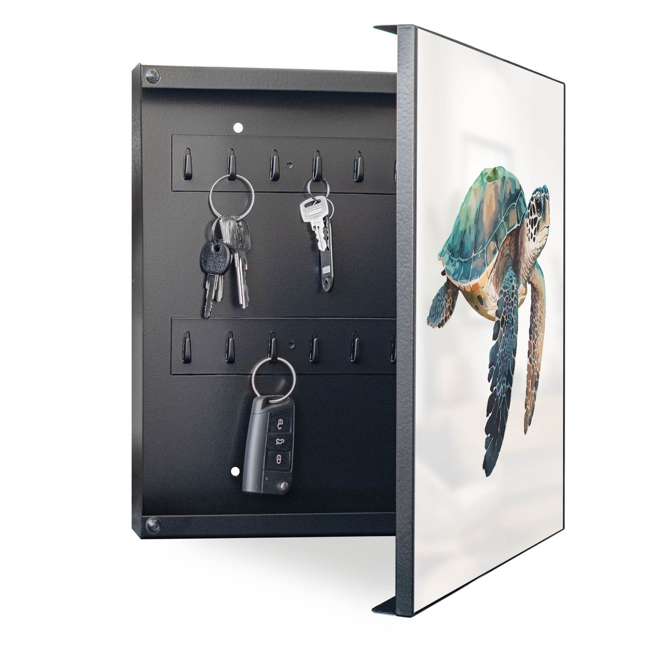 Bringe Ordnung und Eleganz in deinen Eingangsbereich mit dem banjado Schlüsselkasten Motiv Motiv Meeresschildkröte Aquarell. Die moderne Schlüsselbox kombiniert funktionales Design mit hochwertiger Verarbeitung und wird so zu einem echten Hingucker in Flur, Büro oder Ferienwohnung. ✅ Stilvolle Schlüsselaufbewahrung mit Motiv Motiv Meeresschildkröte Aquarell Der Design-Schlüsselkasten Motiv Motiv Meeresschildkröte Aquarell bietet Platz für bis zu 32 Schlüssel, die auf 4 stabilen Reihen mit je 8 Haken übersichtlich verstaut werden. Mit seinen kompakten Maßen von 30 x 30 x 5 cm passt die Schlüsselbox perfekt auch in kleinere Räume. Der schwarz lackierte Stahlkorpus mit rechts angeschlagenem Türscharnier harmoniert mit gedruckten Folie auf der Front und fügt sich nahtlos in jedes Wohnambiente ein. Ob als Schlüsselorganizer für Zuhause oder als praktische Lösung für Büros, Praxen und Gewerbe, der banjado Schlüsselkasten sorgt für Ordnung und Übersicht. Dank der magnetischen, mit Kreidestiften beschreibbaren Folie auf der Front kannst du Notizen anheften oder Termine direkt auf der Oberfläche festhalten. Die Schlüsselbox Motiv Motiv Meeresschildkröte Aquarell zur Wandmontage wird inklusive Befestigungsmaterial geliefert und ist schnell angebracht. So hast du deine Schlüssel jederzeit griffbereit und zugleich stilvoll verstaut. Mit diesem banjado Schlüsselkasten Motiv Motiv Meeresschildkröte Aquarell kombinierst du praktische Aufbewahrung mit stilvollem Wohndesign. Ob privat oder geschäftlich, die Schlüsselbox sorgt für mehr Ordnung, Übersicht und ein wohnliches Ambiente.Vorteile im Überblick