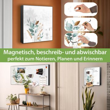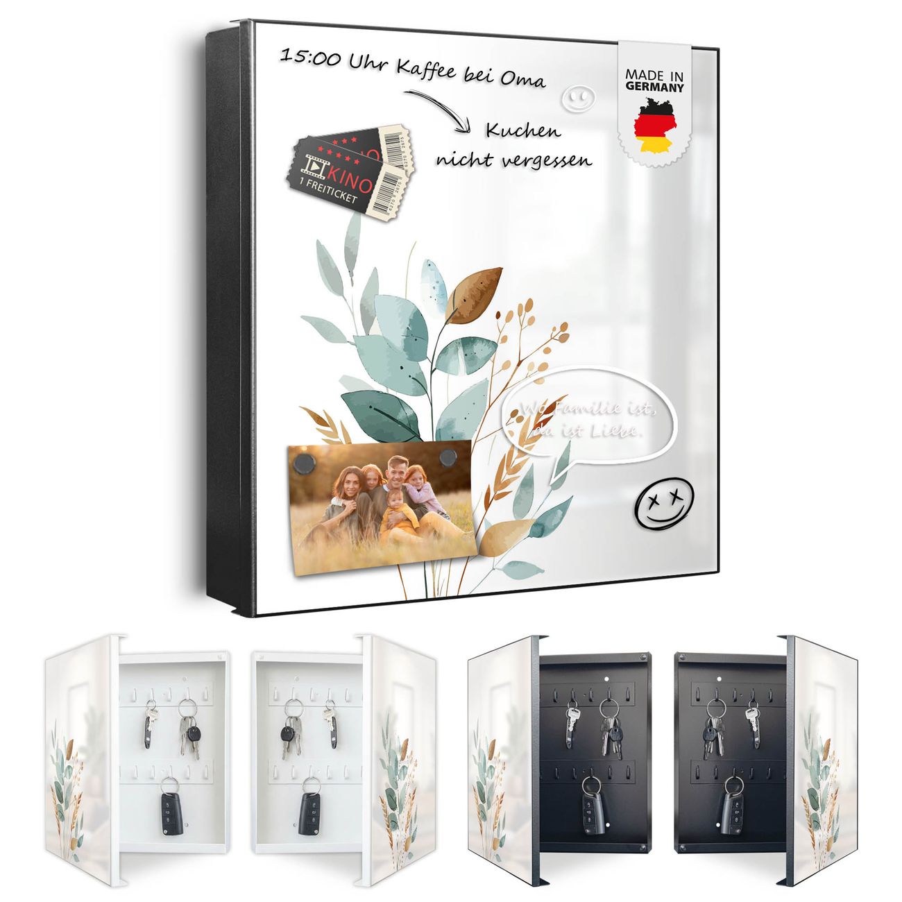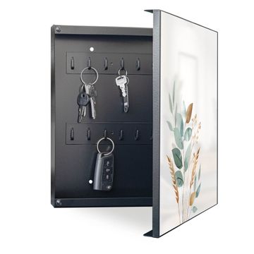 Bringe Ordnung und Eleganz in deinen Eingangsbereich mit dem banjado Schlüsselkasten Motiv Motiv Minimalistische Blätter. Die moderne Schlüsselbox kombiniert funktionales Design mit hochwertiger Verarbeitung und wird so zu einem echten Hingucker in Flur, Büro oder Ferienwohnung. ✅ Stilvolle Schlüsselaufbewahrung mit Motiv Motiv Minimalistische Blätter Der Design-Schlüsselkasten Motiv Motiv Minimalistische Blätter bietet Platz für bis zu 32 Schlüssel, die auf 4 stabilen Reihen mit je 8 Haken übersichtlich verstaut werden. Mit seinen kompakten Maßen von 30 x 30 x 5 cm passt die Schlüsselbox perfekt auch in kleinere Räume. Der schwarz lackierte Stahlkorpus mit rechts angeschlagenem Türscharnier harmoniert mit gedruckten Folie auf der Front und fügt sich nahtlos in jedes Wohnambiente ein. Ob als Schlüsselorganizer für Zuhause oder als praktische Lösung für Büros, Praxen und Gewerbe, der banjado Schlüsselkasten sorgt für Ordnung und Übersicht. Dank der magnetischen, mit Kreidestiften beschreibbaren Folie auf der Front kannst du Notizen anheften oder Termine direkt auf der Oberfläche festhalten. Die Schlüsselbox Motiv Motiv Minimalistische Blätter zur Wandmontage wird inklusive Befestigungsmaterial geliefert und ist schnell angebracht. So hast du deine Schlüssel jederzeit griffbereit und zugleich stilvoll verstaut. Mit diesem banjado Schlüsselkasten Motiv Motiv Minimalistische Blätter kombinierst du praktische Aufbewahrung mit stilvollem Wohndesign. Ob privat oder geschäftlich, die Schlüsselbox sorgt für mehr Ordnung, Übersicht und ein wohnliches Ambiente.Vorteile im Überblick