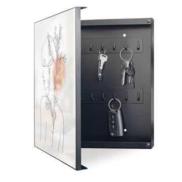 Bringe Ordnung und Eleganz in deinen Eingangsbereich mit dem banjado Schlüsselkasten Motiv Motiv Feminin Floral Lineart. Die moderne Schlüsselbox kombiniert funktionales Design mit hochwertiger Verarbeitung und wird so zu einem echten Hingucker in Flur, Büro oder Ferienwohnung. ✅ Stilvolle Schlüsselaufbewahrung mit Motiv Motiv Feminin Floral Lineart Der Design-Schlüsselkasten Motiv Motiv Feminin Floral Lineart bietet Platz für bis zu 32 Schlüssel, die auf 4 stabilen Reihen mit je 8 Haken übersichtlich verstaut werden. Mit seinen kompakten Maßen von 30 x 30 x 5 cm passt die Schlüsselbox perfekt auch in kleinere Räume. Der schwarz lackierte Stahlkorpus mit links angeschlagenem Türscharnier harmoniert mit gedruckten Folie auf der Front und fügt sich nahtlos in jedes Wohnambiente ein. Ob als Schlüsselorganizer für Zuhause oder als praktische Lösung für Büros, Praxen und Gewerbe, der banjado Schlüsselkasten sorgt für Ordnung und Übersicht. Dank der magnetischen, mit Kreidestiften beschreibbaren Folie auf der Front kannst du Notizen anheften oder Termine direkt auf der Oberfläche festhalten. Die Schlüsselbox Motiv Motiv Feminin Floral Lineart zur Wandmontage wird inklusive Befestigungsmaterial geliefert und ist schnell angebracht. So hast du deine Schlüssel jederzeit griffbereit und zugleich stilvoll verstaut. Mit diesem banjado Schlüsselkasten Motiv Motiv Feminin Floral Lineart kombinierst du praktische Aufbewahrung mit stilvollem Wohndesign. Ob privat oder geschäftlich, die Schlüsselbox sorgt für mehr Ordnung, Übersicht und ein wohnliches Ambiente.Vorteile im Überblick