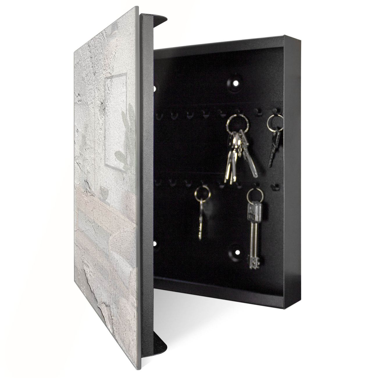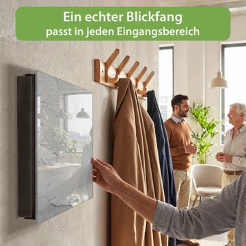 Bringe Ordnung und Eleganz in deinen Eingangsbereich mit dem banjado Schlüsselkasten Motiv Minimalistische Struktur Grau. Die moderne Schlüsselbox kombiniert funktionales Design mit hochwertiger Verarbeitung und wird so zu einem echten Hingucker in Flur, Büro oder Ferienwohnung. ✅ Stilvolle Schlüsselaufbewahrung mit Glasfront im Motiv Motiv Minimalistische Struktur Grau Der Design-Schlüsselkasten Motiv Minimalistische Struktur Grau bietet Platz für bis zu 50 Schlüssel, die auf 5 stabilen Reihen mit je 10 Haken übersichtlich verstaut werden. Mit seinen kompakten Maßen von 30 x 30 x 5 cm passt die Schlüsselbox perfekt auch in kleinere Räume. Der schwarz lackierte Stahlkorpus mit rechts angeschlagenem Türscharnier harmoniert mit der Glasfront und fügt sich nahtlos in jedes Wohnambiente ein. Ob als Schlüsselorganizer für Zuhause oder als praktische Lösung für Büros, Praxen und Gewerbe, der banjado Schlüsselkasten sorgt für Ordnung und Übersicht. Dank der magnetischen, mit Kreidestiften beschreibbaren Glasfront kannst du Notizen anheften oder Termine direkt auf der Oberfläche festhalten. Die Schlüsselbox Motiv Minimalistische Struktur Grau zur Wandmontage wird inklusive Befestigungsmaterial geliefert und ist schnell angebracht. So hast du deine Schlüssel jederzeit griffbereit und zugleich stilvoll verstaut. Mit diesem banjado Schlüsselkasten Motiv Minimalistische Struktur Grau kombinierst du praktische Aufbewahrung mit stilvollem Wohndesign. Ob privat oder geschäftlich, die Schlüsselbox sorgt für mehr Ordnung, Übersicht und ein wohnliches Ambiente.Vorteile im Überblick