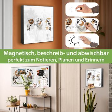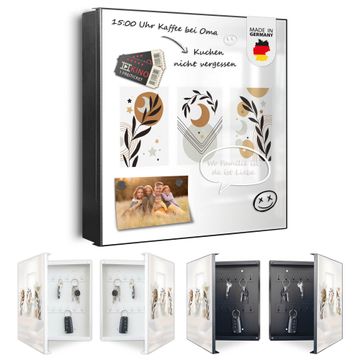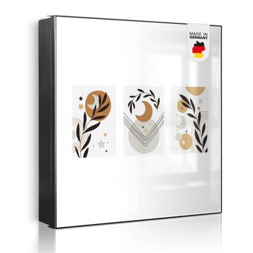 Bringe Ordnung und Eleganz in deinen Eingangsbereich mit dem banjado Schlüsselkasten Motiv Motiv Mond und Blätter Komposition. Die moderne Schlüsselbox kombiniert funktionales Design mit hochwertiger Verarbeitung und wird so zu einem echten Hingucker in Flur, Büro oder Ferienwohnung. ✅ Stilvolle Schlüsselaufbewahrung mit Motiv Motiv Mond und Blätter Komposition Der Design-Schlüsselkasten Motiv Motiv Mond und Blätter Komposition bietet Platz für bis zu 32 Schlüssel, die auf 4 stabilen Reihen mit je 8 Haken übersichtlich verstaut werden. Mit seinen kompakten Maßen von 30 x 30 x 5 cm passt die Schlüsselbox perfekt auch in kleinere Räume. Der schwarz lackierte Stahlkorpus mit links angeschlagenem Türscharnier harmoniert mit gedruckten Folie auf der Front und fügt sich nahtlos in jedes Wohnambiente ein. Ob als Schlüsselorganizer für Zuhause oder als praktische Lösung für Büros, Praxen und Gewerbe, der banjado Schlüsselkasten sorgt für Ordnung und Übersicht. Dank der magnetischen, mit Kreidestiften beschreibbaren Folie auf der Front kannst du Notizen anheften oder Termine direkt auf der Oberfläche festhalten. Die Schlüsselbox Motiv Motiv Mond und Blätter Komposition zur Wandmontage wird inklusive Befestigungsmaterial geliefert und ist schnell angebracht. So hast du deine Schlüssel jederzeit griffbereit und zugleich stilvoll verstaut. Mit diesem banjado Schlüsselkasten Motiv Motiv Mond und Blätter Komposition kombinierst du praktische Aufbewahrung mit stilvollem Wohndesign. Ob privat oder geschäftlich, die Schlüsselbox sorgt für mehr Ordnung, Übersicht und ein wohnliches Ambiente.Vorteile im Überblick
