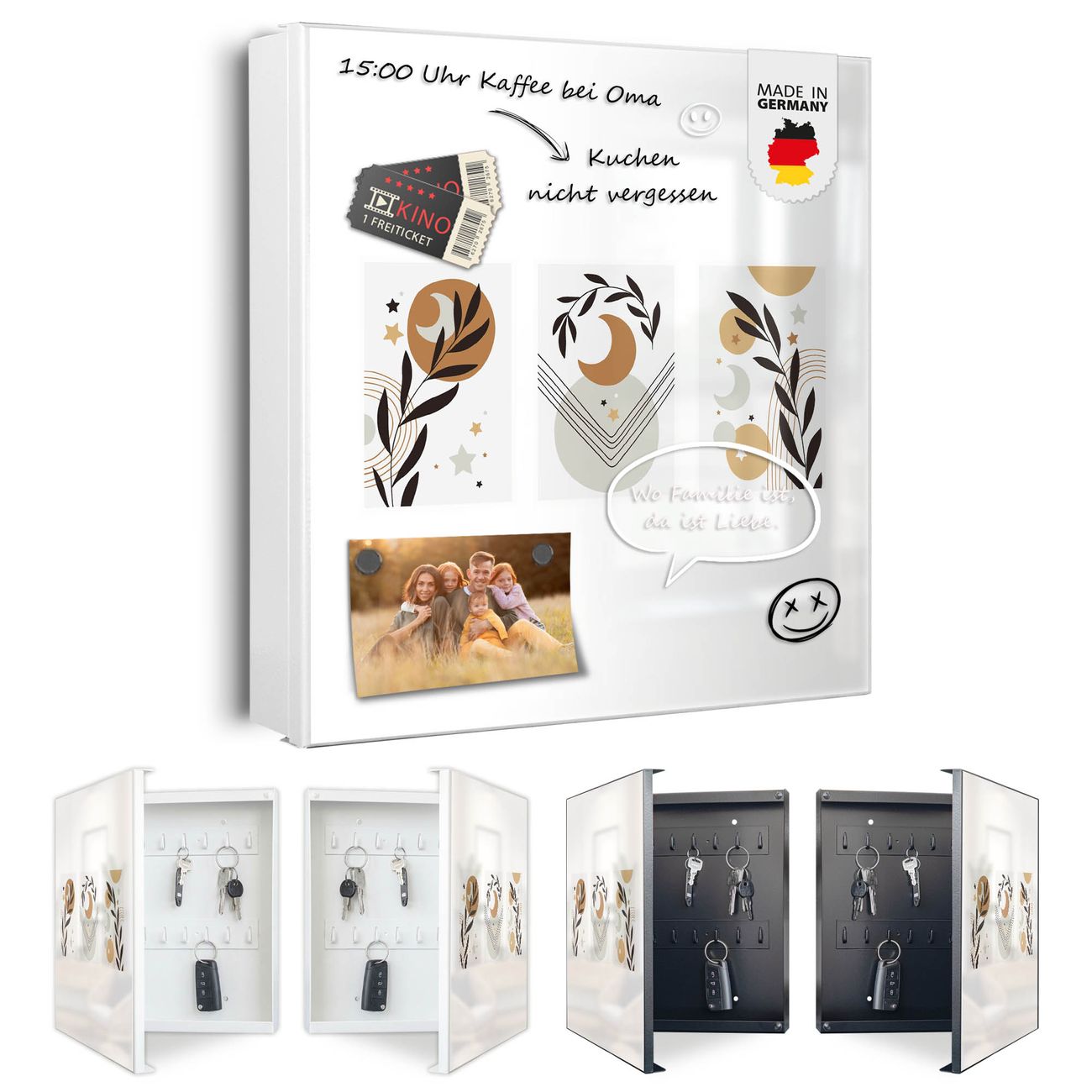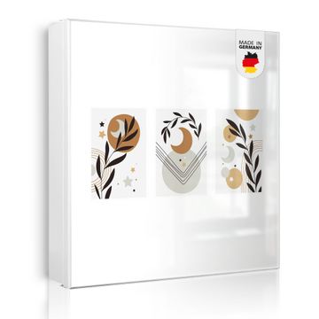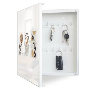 Bringe Ordnung und Eleganz in deinen Eingangsbereich mit dem banjado Schlüsselkasten Motiv Motiv Mond und Blätter Komposition. Die moderne Schlüsselbox kombiniert funktionales Design mit hochwertiger Verarbeitung und wird so zu einem echten Hingucker in Flur, Büro oder Ferienwohnung. ✅ Stilvolle Schlüsselaufbewahrung mit Motiv Motiv Mond und Blätter Komposition Der Design-Schlüsselkasten Motiv Motiv Mond und Blätter Komposition bietet Platz für bis zu 32 Schlüssel, die auf 4 stabilen Reihen mit je 8 Haken übersichtlich verstaut werden. Mit seinen kompakten Maßen von 30 x 30 x 5 cm passt die Schlüsselbox perfekt auch in kleinere Räume. Der weiß lackierte Stahlkorpus mit links angeschlagenem Türscharnier harmoniert mit gedruckten Folie auf der Front und fügt sich nahtlos in jedes Wohnambiente ein. Ob als Schlüsselorganizer für Zuhause oder als praktische Lösung für Büros, Praxen und Gewerbe, der banjado Schlüsselkasten sorgt für Ordnung und Übersicht. Dank der magnetischen, mit Kreidestiften beschreibbaren Folie auf der Front kannst du Notizen anheften oder Termine direkt auf der Oberfläche festhalten. Die Schlüsselbox Motiv Motiv Mond und Blätter Komposition zur Wandmontage wird inklusive Befestigungsmaterial geliefert und ist schnell angebracht. So hast du deine Schlüssel jederzeit griffbereit und zugleich stilvoll verstaut. Mit diesem banjado Schlüsselkasten Motiv Motiv Mond und Blätter Komposition kombinierst du praktische Aufbewahrung mit stilvollem Wohndesign. Ob privat oder geschäftlich, die Schlüsselbox sorgt für mehr Ordnung, Übersicht und ein wohnliches Ambiente.Vorteile im Überblick