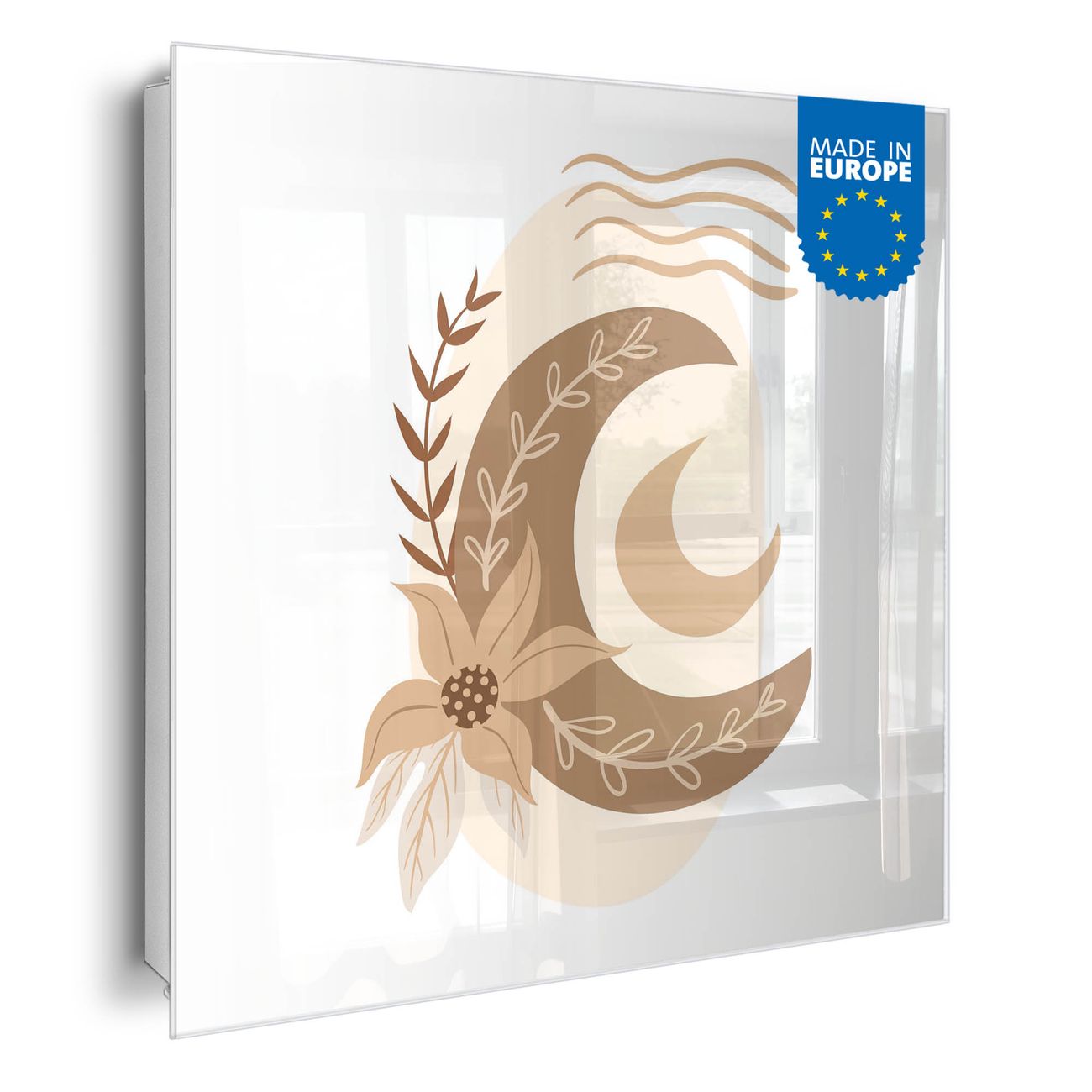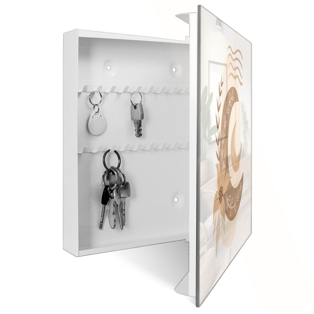 Bringe Ordnung und Eleganz in deinen Eingangsbereich mit dem banjado Schlüsselkasten Motiv Motiv Mondblume. Die moderne Schlüsselbox kombiniert funktionales Design mit hochwertiger Verarbeitung und wird so zu einem echten Hingucker in Flur, Büro oder Ferienwohnung. ✅ Stilvolle Schlüsselaufbewahrung mit Glasfront im Motiv Motiv Mondblume Der Design-Schlüsselkasten Motiv Motiv Mondblume bietet Platz für bis zu 50 Schlüssel, die auf 5 stabilen Reihen mit je 10 Haken übersichtlich verstaut werden. Mit seinen kompakten Maßen von 30 x 30 x 5 cm passt die Schlüsselbox perfekt auch in kleinere Räume. Der weiß lackierte Stahlkorpus mit rechts angeschlagenem Türscharnier harmoniert mit der Glasfront und fügt sich nahtlos in jedes Wohnambiente ein. Ob als Schlüsselorganizer für Zuhause oder als praktische Lösung für Büros, Praxen und Gewerbe, der banjado Schlüsselkasten sorgt für Ordnung und Übersicht. Dank der magnetischen, mit Kreidestiften beschreibbaren Glasfront kannst du Notizen anheften oder Termine direkt auf der Oberfläche festhalten. Die Schlüsselbox Motiv Motiv Mondblume zur Wandmontage wird inklusive Befestigungsmaterial geliefert und ist schnell angebracht. So hast du deine Schlüssel jederzeit griffbereit und zugleich stilvoll verstaut. Mit diesem banjado Schlüsselkasten Motiv Motiv Mondblume kombinierst du praktische Aufbewahrung mit stilvollem Wohndesign. Ob privat oder geschäftlich, die Schlüsselbox sorgt für mehr Ordnung, Übersicht und ein wohnliches Ambiente.Vorteile im Überblick