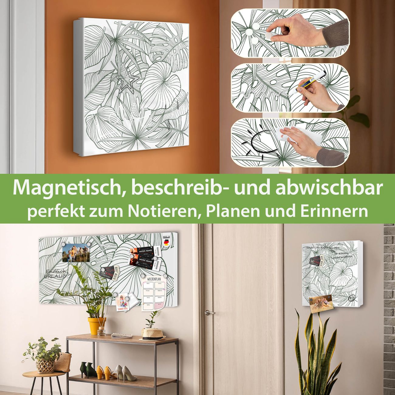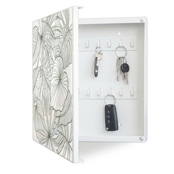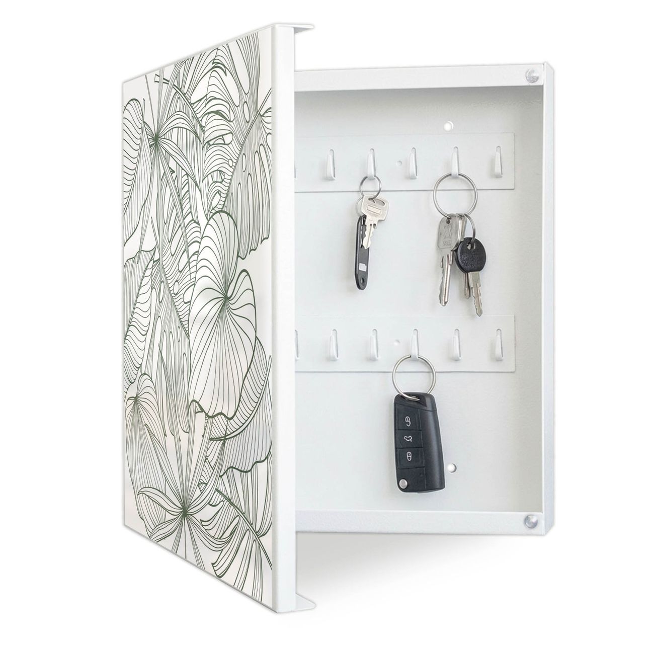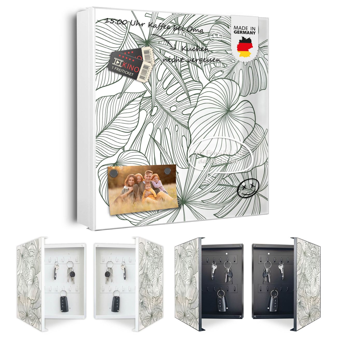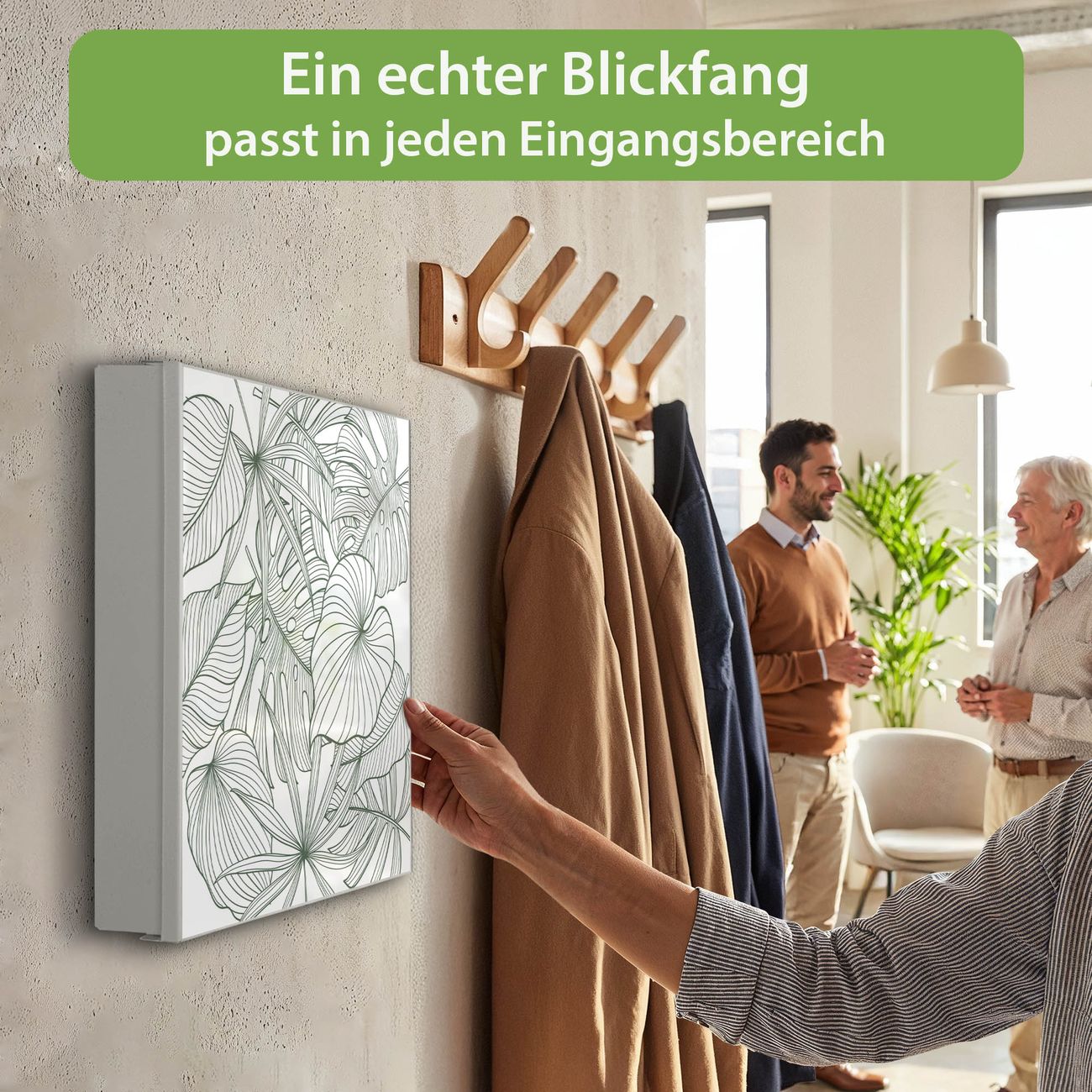 Bringe Ordnung und Eleganz in deinen Eingangsbereich mit dem banjado Schlüsselkasten Motiv Motiv Monstera 2. Die moderne Schlüsselbox kombiniert funktionales Design mit hochwertiger Verarbeitung und wird so zu einem echten Hingucker in Flur, Büro oder Ferienwohnung. ✅ Stilvolle Schlüsselaufbewahrung mit Motiv Motiv Monstera 2 Der Design-Schlüsselkasten Motiv Motiv Monstera 2 bietet Platz für bis zu 32 Schlüssel, die auf 4 stabilen Reihen mit je 8 Haken übersichtlich verstaut werden. Mit seinen kompakten Maßen von 30 x 30 x 5 cm passt die Schlüsselbox perfekt auch in kleinere Räume. Der weiß lackierte Stahlkorpus mit links angeschlagenem Türscharnier harmoniert mit gedruckten Folie auf der Front und fügt sich nahtlos in jedes Wohnambiente ein. Ob als Schlüsselorganizer für Zuhause oder als praktische Lösung für Büros, Praxen und Gewerbe, der banjado Schlüsselkasten sorgt für Ordnung und Übersicht. Dank der magnetischen, mit Kreidestiften beschreibbaren Folie auf der Front kannst du Notizen anheften oder Termine direkt auf der Oberfläche festhalten. Die Schlüsselbox Motiv Motiv Monstera 2 zur Wandmontage wird inklusive Befestigungsmaterial geliefert und ist schnell angebracht. So hast du deine Schlüssel jederzeit griffbereit und zugleich stilvoll verstaut. Mit diesem banjado Schlüsselkasten Motiv Motiv Monstera 2 kombinierst du praktische Aufbewahrung mit stilvollem Wohndesign. Ob privat oder geschäftlich, die Schlüsselbox sorgt für mehr Ordnung, Übersicht und ein wohnliches Ambiente.Vorteile im Überblick