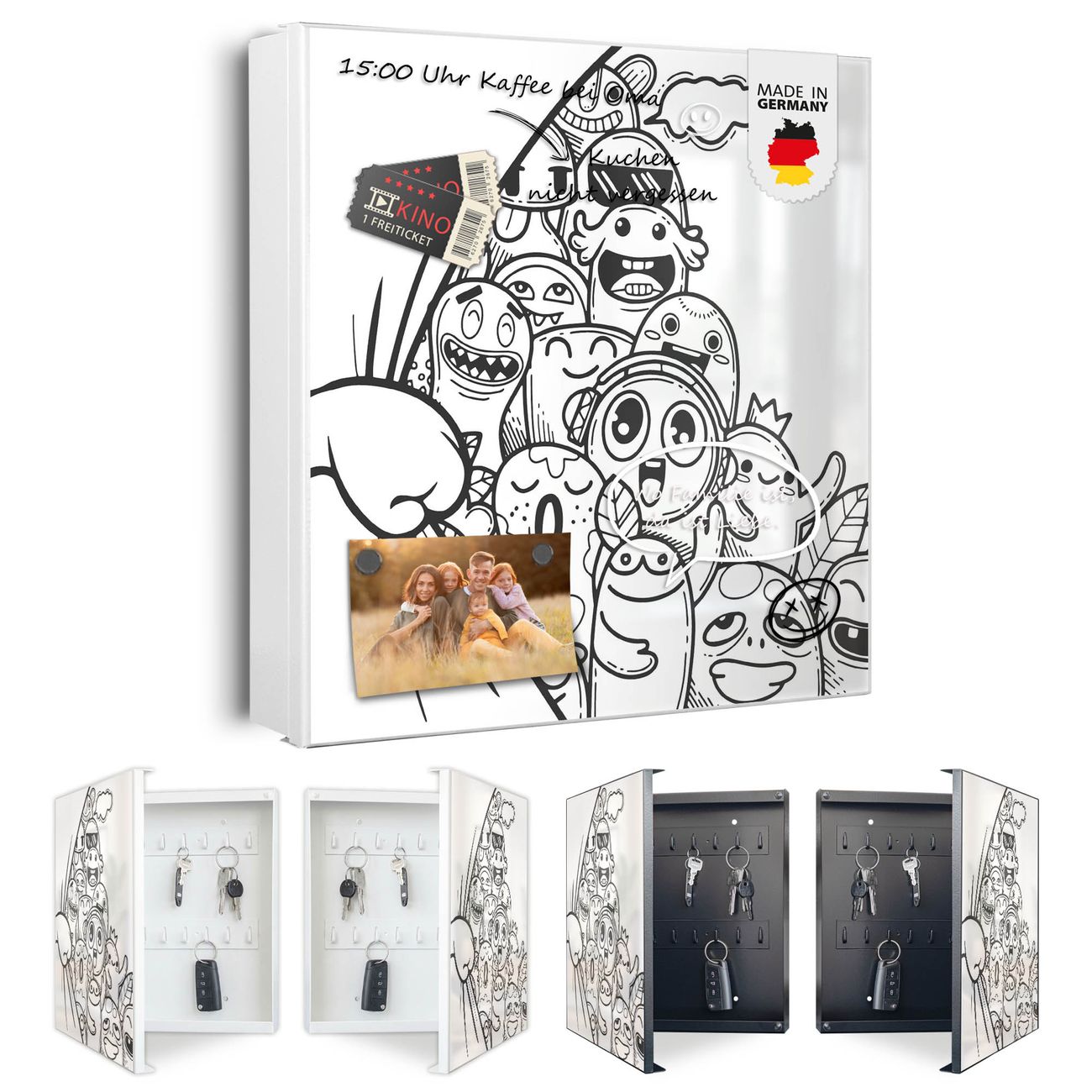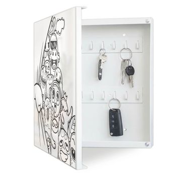 Bringe Ordnung und Eleganz in deinen Eingangsbereich mit dem banjado Schlüsselkasten Motiv Motiv Monsterparty. Die moderne Schlüsselbox kombiniert funktionales Design mit hochwertiger Verarbeitung und wird so zu einem echten Hingucker in Flur, Büro oder Ferienwohnung. ✅ Stilvolle Schlüsselaufbewahrung mit Motiv Motiv Monsterparty Der Design-Schlüsselkasten Motiv Motiv Monsterparty bietet Platz für bis zu 32 Schlüssel, die auf 4 stabilen Reihen mit je 8 Haken übersichtlich verstaut werden. Mit seinen kompakten Maßen von 30 x 30 x 5 cm passt die Schlüsselbox perfekt auch in kleinere Räume. Der weiß lackierte Stahlkorpus mit links angeschlagenem Türscharnier harmoniert mit gedruckten Folie auf der Front und fügt sich nahtlos in jedes Wohnambiente ein. Ob als Schlüsselorganizer für Zuhause oder als praktische Lösung für Büros, Praxen und Gewerbe, der banjado Schlüsselkasten sorgt für Ordnung und Übersicht. Dank der magnetischen, mit Kreidestiften beschreibbaren Folie auf der Front kannst du Notizen anheften oder Termine direkt auf der Oberfläche festhalten. Die Schlüsselbox Motiv Motiv Monsterparty zur Wandmontage wird inklusive Befestigungsmaterial geliefert und ist schnell angebracht. So hast du deine Schlüssel jederzeit griffbereit und zugleich stilvoll verstaut. Mit diesem banjado Schlüsselkasten Motiv Motiv Monsterparty kombinierst du praktische Aufbewahrung mit stilvollem Wohndesign. Ob privat oder geschäftlich, die Schlüsselbox sorgt für mehr Ordnung, Übersicht und ein wohnliches Ambiente.Vorteile im Überblick