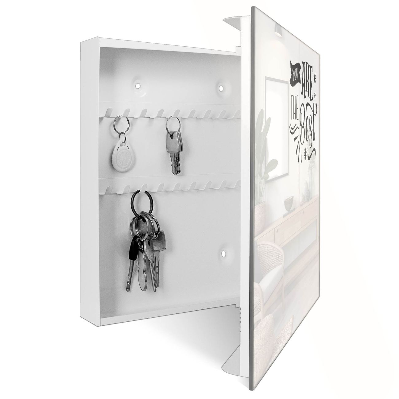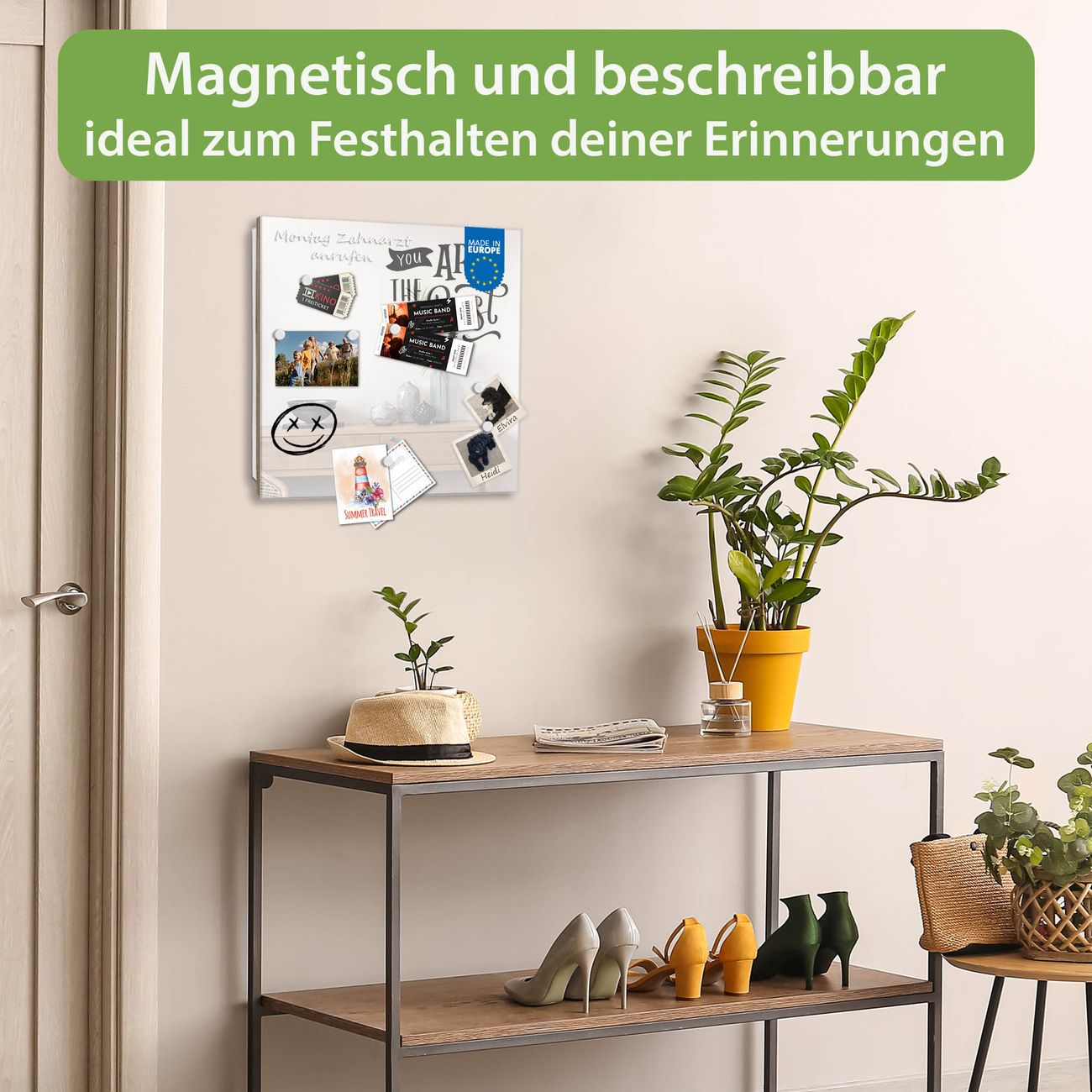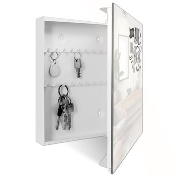 Bringe Ordnung und Eleganz in deinen Eingangsbereich mit dem banjado Schlüsselkasten Motiv Motiv Motivationsspruch. Die moderne Schlüsselbox kombiniert funktionales Design mit hochwertiger Verarbeitung und wird so zu einem echten Hingucker in Flur, Büro oder Ferienwohnung. ✅ Stilvolle Schlüsselaufbewahrung mit Glasfront im Motiv Motiv Motivationsspruch Der Design-Schlüsselkasten Motiv Motiv Motivationsspruch bietet Platz für bis zu 50 Schlüssel, die auf 5 stabilen Reihen mit je 10 Haken übersichtlich verstaut werden. Mit seinen kompakten Maßen von 30 x 30 x 5 cm passt die Schlüsselbox perfekt auch in kleinere Räume. Der weiß lackierte Stahlkorpus mit rechts angeschlagenem Türscharnier harmoniert mit der Glasfront und fügt sich nahtlos in jedes Wohnambiente ein. Ob als Schlüsselorganizer für Zuhause oder als praktische Lösung für Büros, Praxen und Gewerbe, der banjado Schlüsselkasten sorgt für Ordnung und Übersicht. Dank der magnetischen, mit Kreidestiften beschreibbaren Glasfront kannst du Notizen anheften oder Termine direkt auf der Oberfläche festhalten. Die Schlüsselbox Motiv Motiv Motivationsspruch zur Wandmontage wird inklusive Befestigungsmaterial geliefert und ist schnell angebracht. So hast du deine Schlüssel jederzeit griffbereit und zugleich stilvoll verstaut. Mit diesem banjado Schlüsselkasten Motiv Motiv Motivationsspruch kombinierst du praktische Aufbewahrung mit stilvollem Wohndesign. Ob privat oder geschäftlich, die Schlüsselbox sorgt für mehr Ordnung, Übersicht und ein wohnliches Ambiente.Vorteile im Überblick