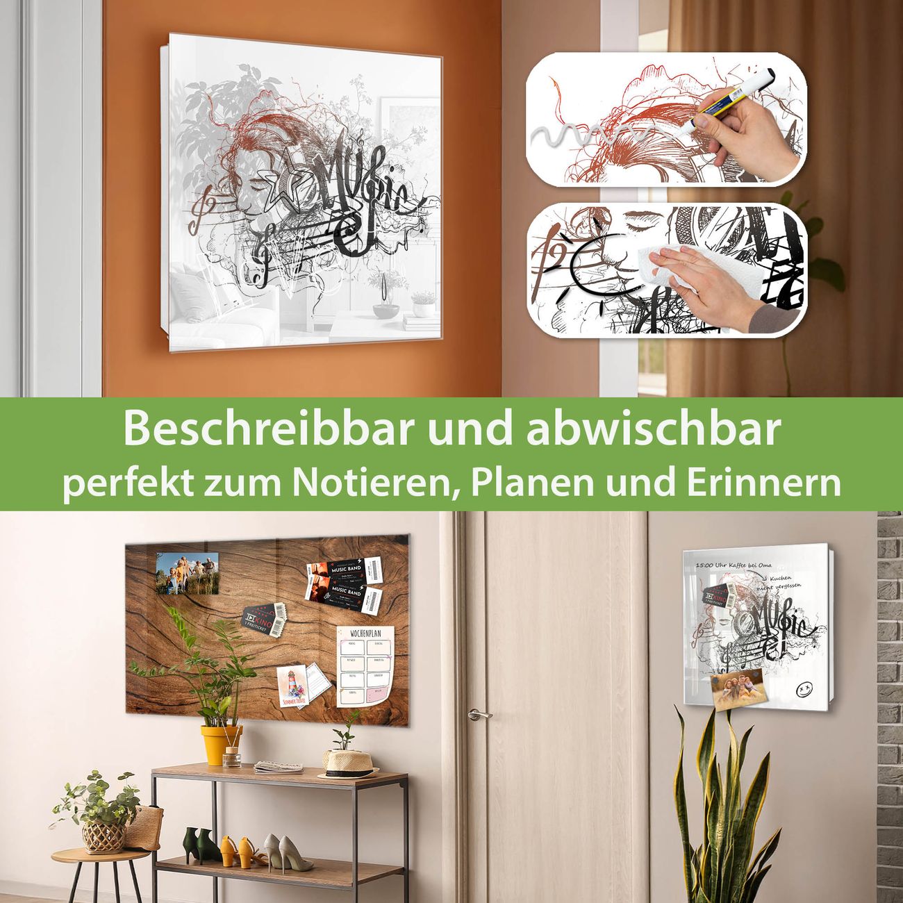 Bringe Ordnung und Eleganz in deinen Eingangsbereich mit dem banjado Schlüsselkasten Motiv Motiv Musikalische Linienkunst. Die moderne Schlüsselbox kombiniert funktionales Design mit hochwertiger Verarbeitung und wird so zu einem echten Hingucker in Flur, Büro oder Ferienwohnung. ✅ Stilvolle Schlüsselaufbewahrung mit Glasfront im Motiv Motiv Musikalische Linienkunst Der Design-Schlüsselkasten Motiv Motiv Musikalische Linienkunst bietet Platz für bis zu 50 Schlüssel, die auf 5 stabilen Reihen mit je 10 Haken übersichtlich verstaut werden. Mit seinen kompakten Maßen von 30 x 30 x 5 cm passt die Schlüsselbox perfekt auch in kleinere Räume. Der weiß lackierte Stahlkorpus mit rechts angeschlagenem Türscharnier harmoniert mit der Glasfront und fügt sich nahtlos in jedes Wohnambiente ein. Ob als Schlüsselorganizer für Zuhause oder als praktische Lösung für Büros, Praxen und Gewerbe, der banjado Schlüsselkasten sorgt für Ordnung und Übersicht. Dank der magnetischen, mit Kreidestiften beschreibbaren Glasfront kannst du Notizen anheften oder Termine direkt auf der Oberfläche festhalten. Die Schlüsselbox Motiv Motiv Musikalische Linienkunst zur Wandmontage wird inklusive Befestigungsmaterial geliefert und ist schnell angebracht. So hast du deine Schlüssel jederzeit griffbereit und zugleich stilvoll verstaut. Mit diesem banjado Schlüsselkasten Motiv Motiv Musikalische Linienkunst kombinierst du praktische Aufbewahrung mit stilvollem Wohndesign. Ob privat oder geschäftlich, die Schlüsselbox sorgt für mehr Ordnung, Übersicht und ein wohnliches Ambiente.Vorteile im Überblick