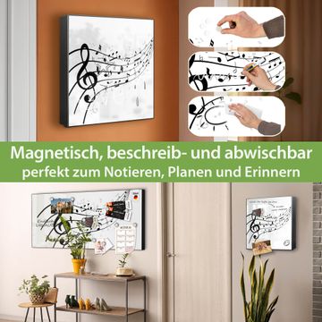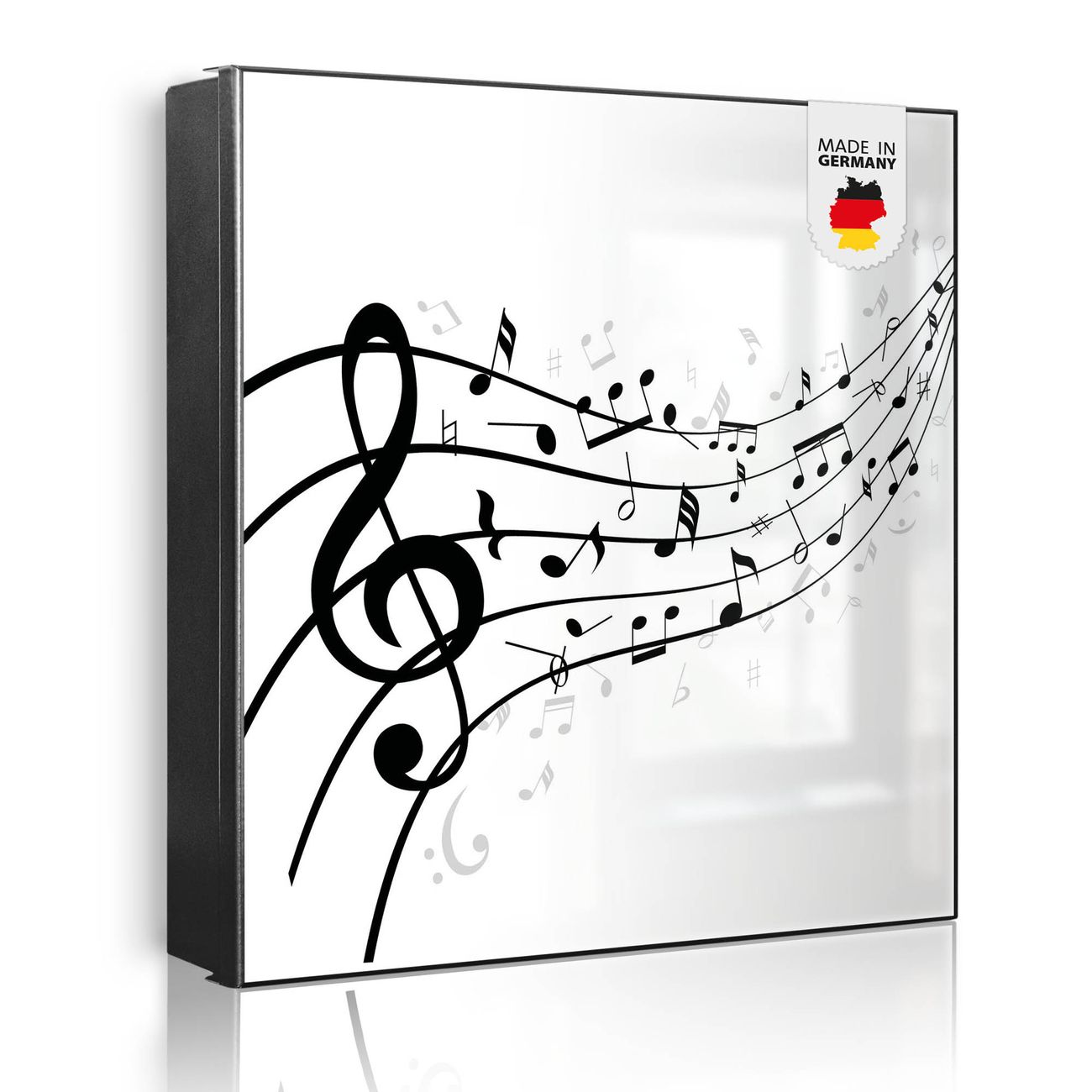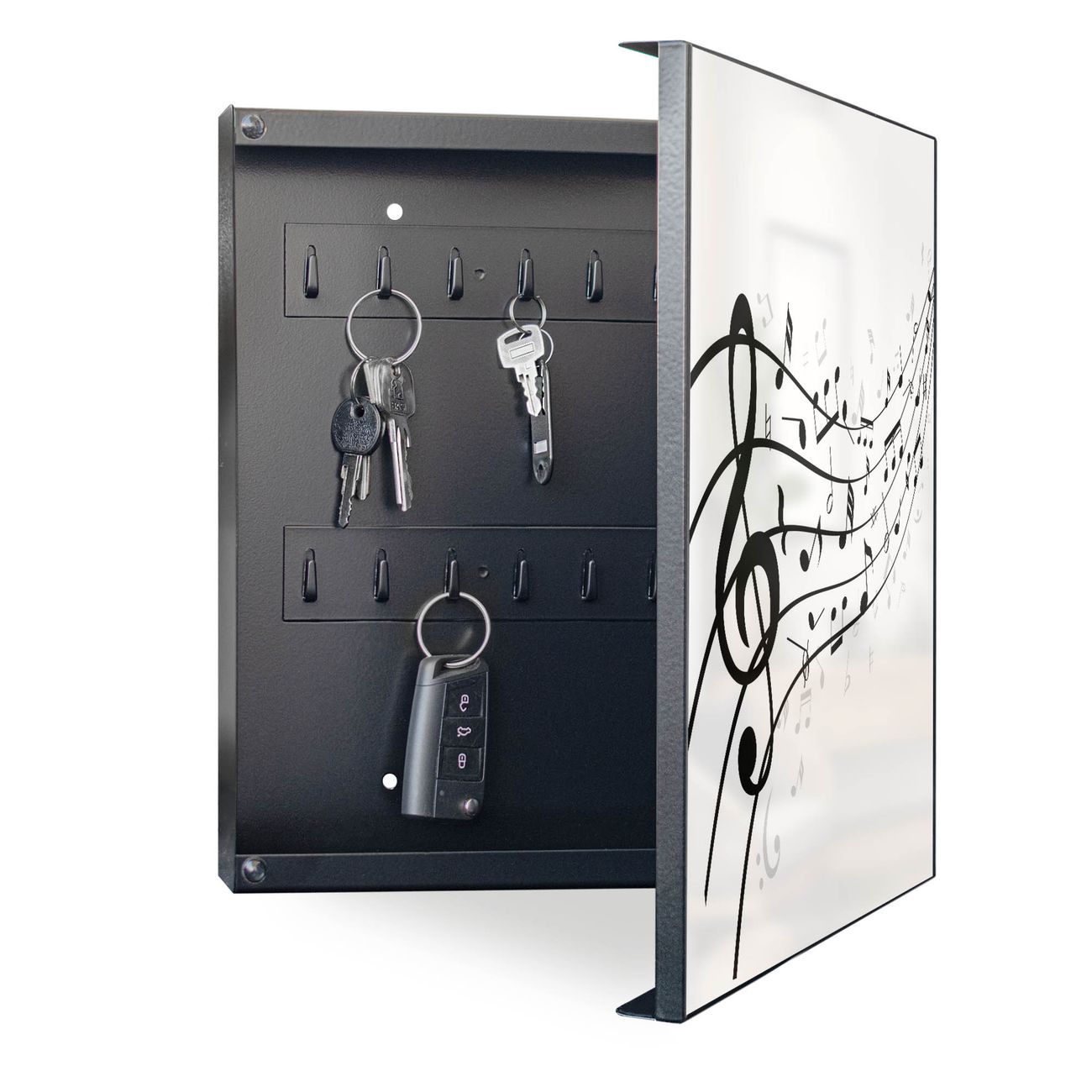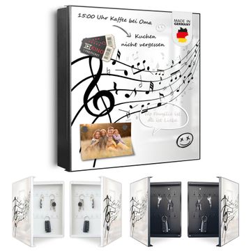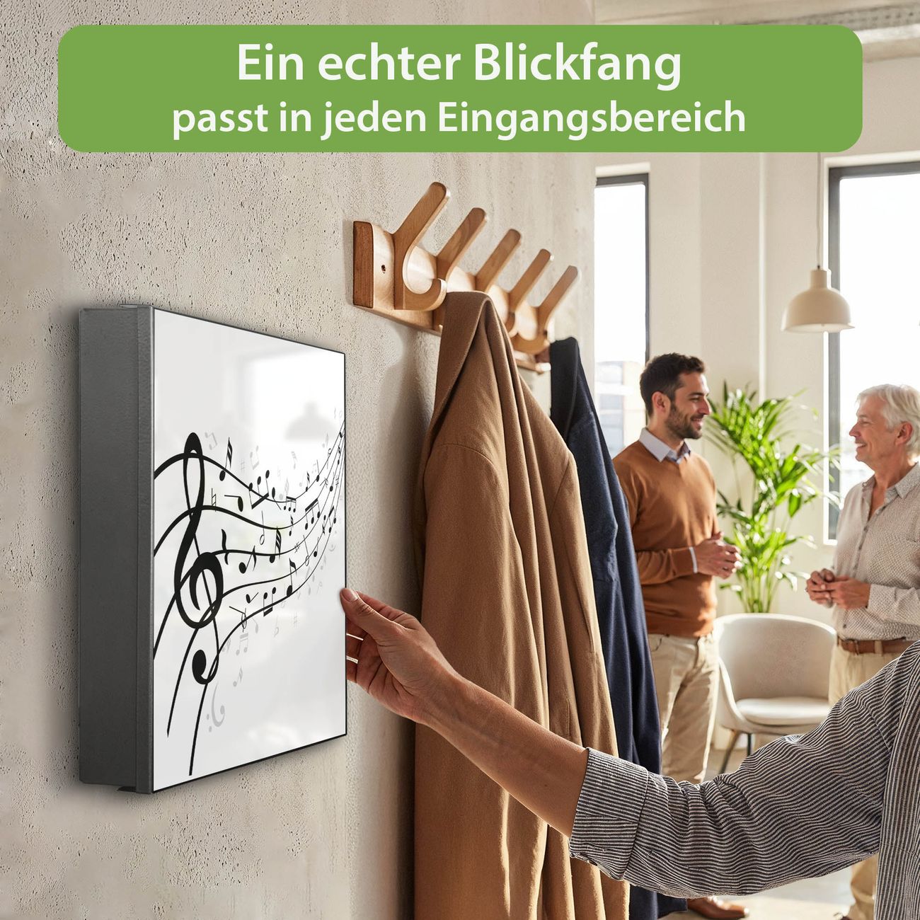 Bringe Ordnung und Eleganz in deinen Eingangsbereich mit dem banjado Schlüsselkasten Motiv Motiv Musikalische Noten. Die moderne Schlüsselbox kombiniert funktionales Design mit hochwertiger Verarbeitung und wird so zu einem echten Hingucker in Flur, Büro oder Ferienwohnung. ✅ Stilvolle Schlüsselaufbewahrung mit Motiv Motiv Musikalische Noten Der Design-Schlüsselkasten Motiv Motiv Musikalische Noten bietet Platz für bis zu 32 Schlüssel, die auf 4 stabilen Reihen mit je 8 Haken übersichtlich verstaut werden. Mit seinen kompakten Maßen von 30 x 30 x 5 cm passt die Schlüsselbox perfekt auch in kleinere Räume. Der schwarz lackierte Stahlkorpus mit rechts angeschlagenem Türscharnier harmoniert mit gedruckten Folie auf der Front und fügt sich nahtlos in jedes Wohnambiente ein. Ob als Schlüsselorganizer für Zuhause oder als praktische Lösung für Büros, Praxen und Gewerbe, der banjado Schlüsselkasten sorgt für Ordnung und Übersicht. Dank der magnetischen, mit Kreidestiften beschreibbaren Folie auf der Front kannst du Notizen anheften oder Termine direkt auf der Oberfläche festhalten. Die Schlüsselbox Motiv Motiv Musikalische Noten zur Wandmontage wird inklusive Befestigungsmaterial geliefert und ist schnell angebracht. So hast du deine Schlüssel jederzeit griffbereit und zugleich stilvoll verstaut. Mit diesem banjado Schlüsselkasten Motiv Motiv Musikalische Noten kombinierst du praktische Aufbewahrung mit stilvollem Wohndesign. Ob privat oder geschäftlich, die Schlüsselbox sorgt für mehr Ordnung, Übersicht und ein wohnliches Ambiente.Vorteile im Überblick
