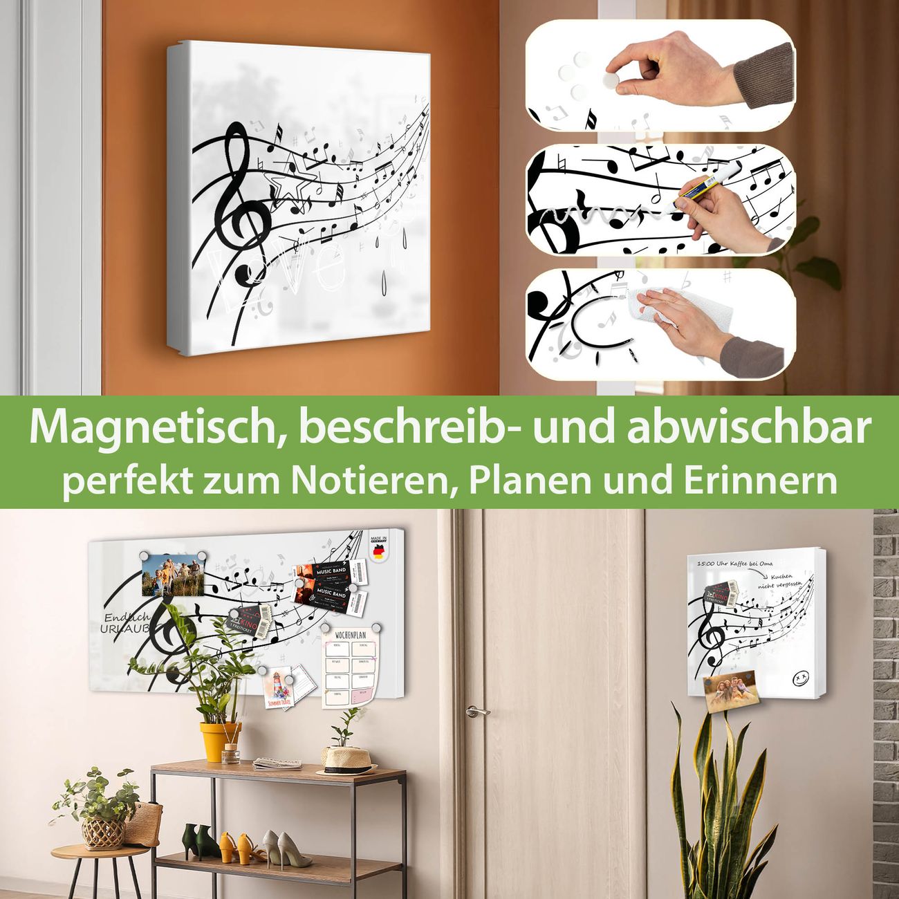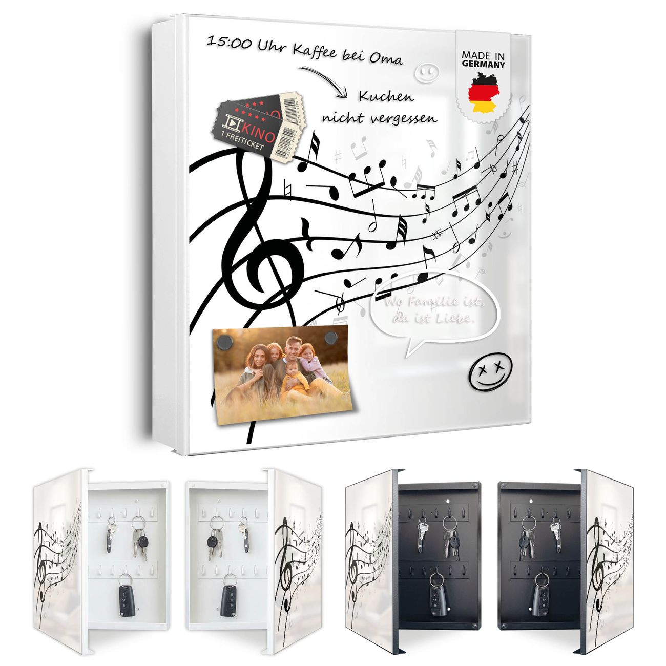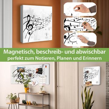 Bringe Ordnung und Eleganz in deinen Eingangsbereich mit dem banjado Schlüsselkasten Motiv Motiv Musikalische Noten. Die moderne Schlüsselbox kombiniert funktionales Design mit hochwertiger Verarbeitung und wird so zu einem echten Hingucker in Flur, Büro oder Ferienwohnung. ✅ Stilvolle Schlüsselaufbewahrung mit Motiv Motiv Musikalische Noten Der Design-Schlüsselkasten Motiv Motiv Musikalische Noten bietet Platz für bis zu 32 Schlüssel, die auf 4 stabilen Reihen mit je 8 Haken übersichtlich verstaut werden. Mit seinen kompakten Maßen von 30 x 30 x 5 cm passt die Schlüsselbox perfekt auch in kleinere Räume. Der weiß lackierte Stahlkorpus mit rechts angeschlagenem Türscharnier harmoniert mit gedruckten Folie auf der Front und fügt sich nahtlos in jedes Wohnambiente ein. Ob als Schlüsselorganizer für Zuhause oder als praktische Lösung für Büros, Praxen und Gewerbe, der banjado Schlüsselkasten sorgt für Ordnung und Übersicht. Dank der magnetischen, mit Kreidestiften beschreibbaren Folie auf der Front kannst du Notizen anheften oder Termine direkt auf der Oberfläche festhalten. Die Schlüsselbox Motiv Motiv Musikalische Noten zur Wandmontage wird inklusive Befestigungsmaterial geliefert und ist schnell angebracht. So hast du deine Schlüssel jederzeit griffbereit und zugleich stilvoll verstaut. Mit diesem banjado Schlüsselkasten Motiv Motiv Musikalische Noten kombinierst du praktische Aufbewahrung mit stilvollem Wohndesign. Ob privat oder geschäftlich, die Schlüsselbox sorgt für mehr Ordnung, Übersicht und ein wohnliches Ambiente.Vorteile im Überblick