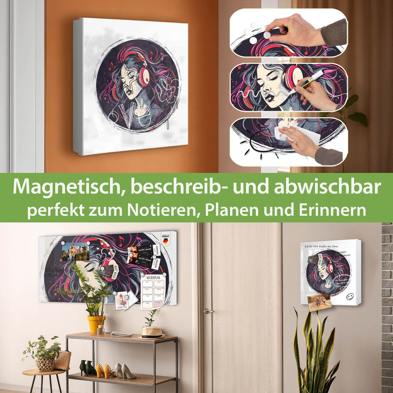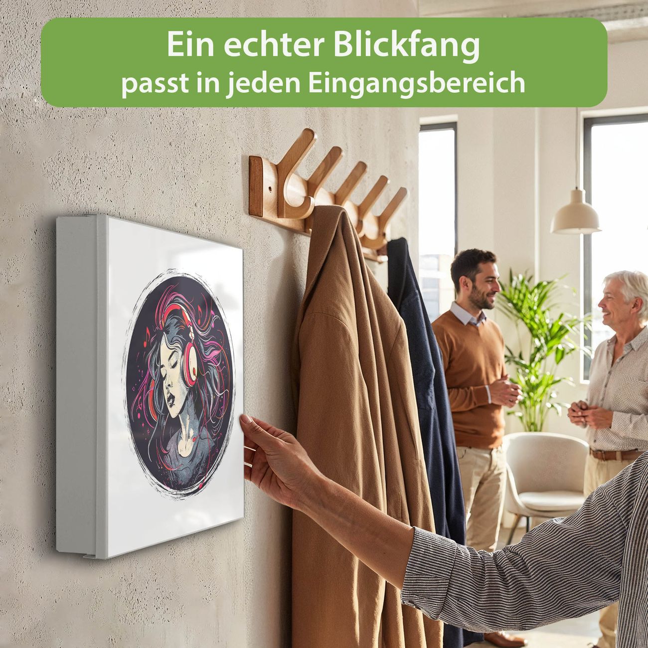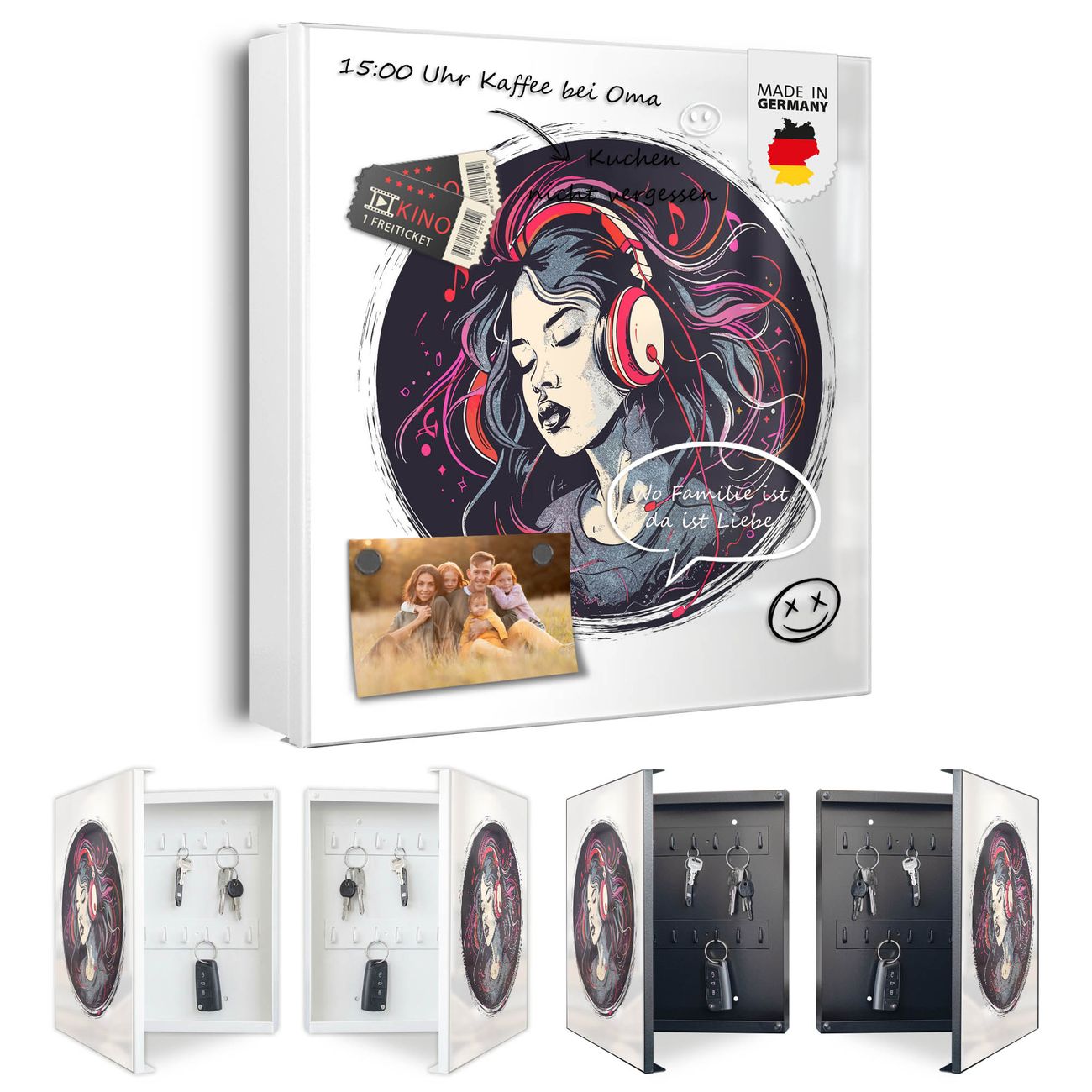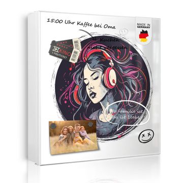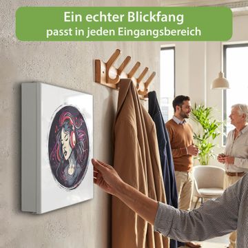 Bringe Ordnung und Eleganz in deinen Eingangsbereich mit dem banjado Schlüsselkasten Motiv Motiv Musikalischer Traum. Die moderne Schlüsselbox kombiniert funktionales Design mit hochwertiger Verarbeitung und wird so zu einem echten Hingucker in Flur, Büro oder Ferienwohnung. ✅ Stilvolle Schlüsselaufbewahrung mit Motiv Motiv Musikalischer Traum Der Design-Schlüsselkasten Motiv Motiv Musikalischer Traum bietet Platz für bis zu 32 Schlüssel, die auf 4 stabilen Reihen mit je 8 Haken übersichtlich verstaut werden. Mit seinen kompakten Maßen von 30 x 30 x 5 cm passt die Schlüsselbox perfekt auch in kleinere Räume. Der weiß lackierte Stahlkorpus mit rechts angeschlagenem Türscharnier harmoniert mit gedruckten Folie auf der Front und fügt sich nahtlos in jedes Wohnambiente ein. Ob als Schlüsselorganizer für Zuhause oder als praktische Lösung für Büros, Praxen und Gewerbe, der banjado Schlüsselkasten sorgt für Ordnung und Übersicht. Dank der magnetischen, mit Kreidestiften beschreibbaren Folie auf der Front kannst du Notizen anheften oder Termine direkt auf der Oberfläche festhalten. Die Schlüsselbox Motiv Motiv Musikalischer Traum zur Wandmontage wird inklusive Befestigungsmaterial geliefert und ist schnell angebracht. So hast du deine Schlüssel jederzeit griffbereit und zugleich stilvoll verstaut. Mit diesem banjado Schlüsselkasten Motiv Motiv Musikalischer Traum kombinierst du praktische Aufbewahrung mit stilvollem Wohndesign. Ob privat oder geschäftlich, die Schlüsselbox sorgt für mehr Ordnung, Übersicht und ein wohnliches Ambiente.Vorteile im Überblick